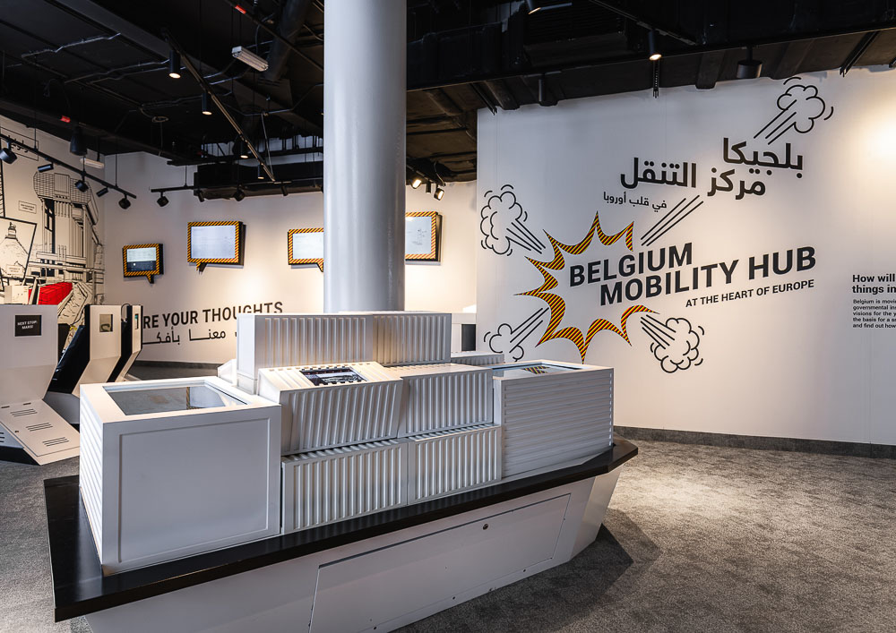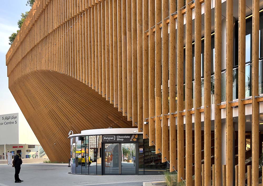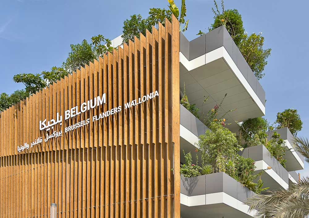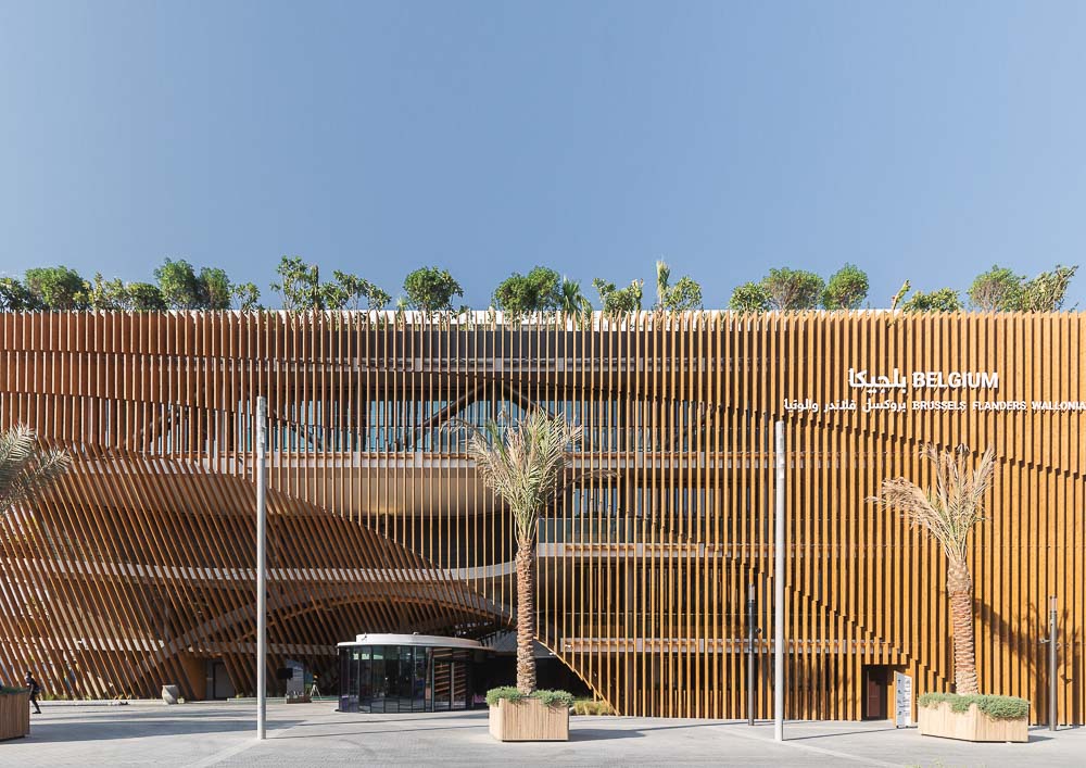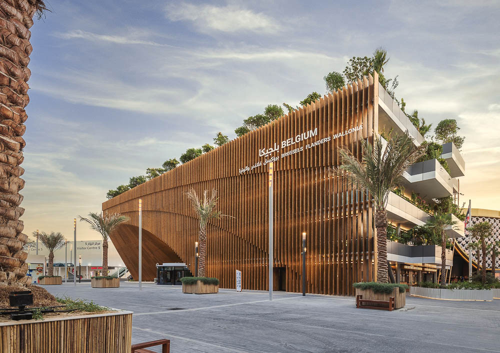 벨기에 파빌리온은 단단한 목재에 집중적인 녹지와 미래 지향적인 디자인이 결합되어 “그린 아치”라고 불린다. 파빌리온은 지속 가능한 개발 측면에서 모범이 되는 것을 목표로 한다. 재생 순환 경제, 생물 기반 및 지구 자원 재료, 생물 기후 규칙과 재생 가능한 에너지의 통합, 그리고 생물 다양성과 자연 보존을 위한 찬사이다. “모빌리티 디스트릭트”에 위치한 벨기에 전시관의 건축 컨셉은 방문객들에게 두바이의 서쪽-동쪽 바람의 축에 있는 가장 큰 그늘지고 자연 환기가 되는 아고라를 제공하는 것이다. 이러한 프로그램의 1층 공간은 최대 공간이 대중이 자유롭게 사용할 수 있도록 더 높은 곳에 배치되어 있다. 이것은 “그린 아치”가 “다리 건설”에 기반을 두고 있다는 것을 의미하며, 두 기둥 사이에 이중 곡률을 가진 거대한 아치를 만든다. 이 곡선형 볼트는 쌍곡 포물선이라고 불리는 수학적 최소 표면에서 생성된다. 이 포물면은 CLT(Cross Laminated Timber)로 제작되었으며 5.5km 이상의 가문비나무 미늘창이 거대한 나무 마슈라비야를 생성한다. 이는 180도 회전하여 전체 프로젝트를 감싸 태양 복사열로부터 내부를 잘 보호한다.