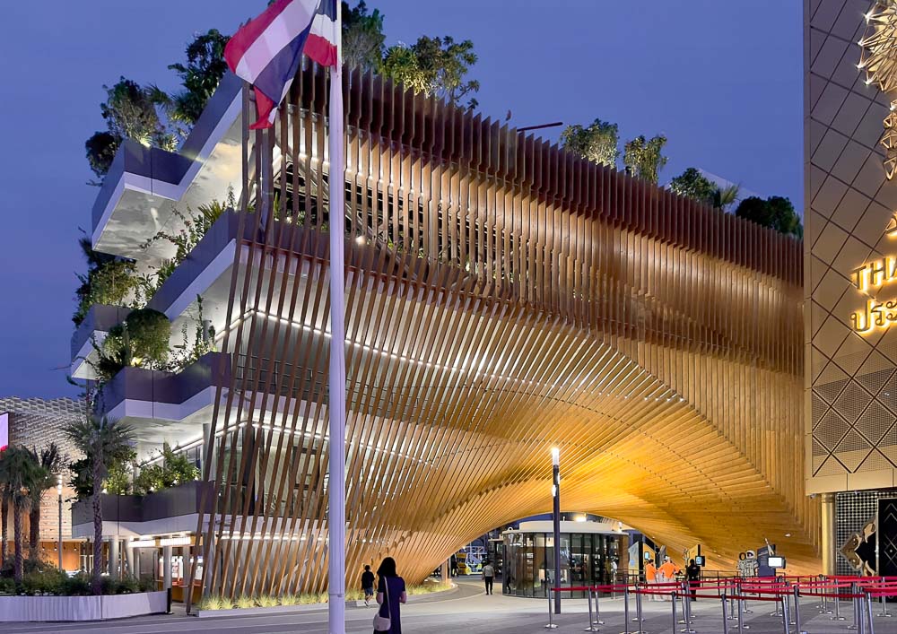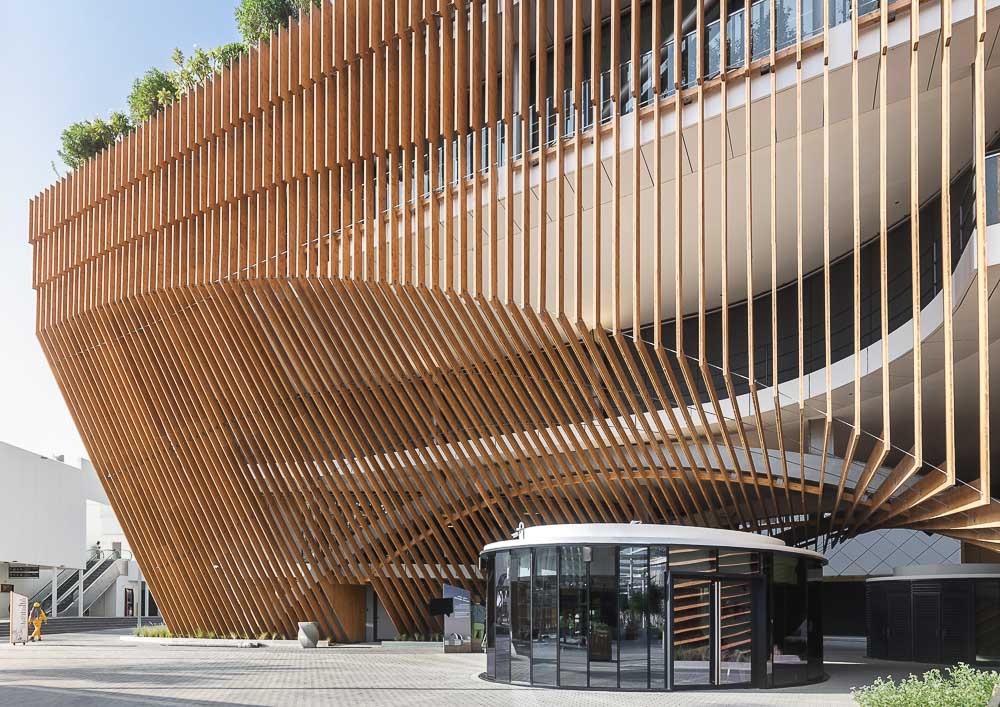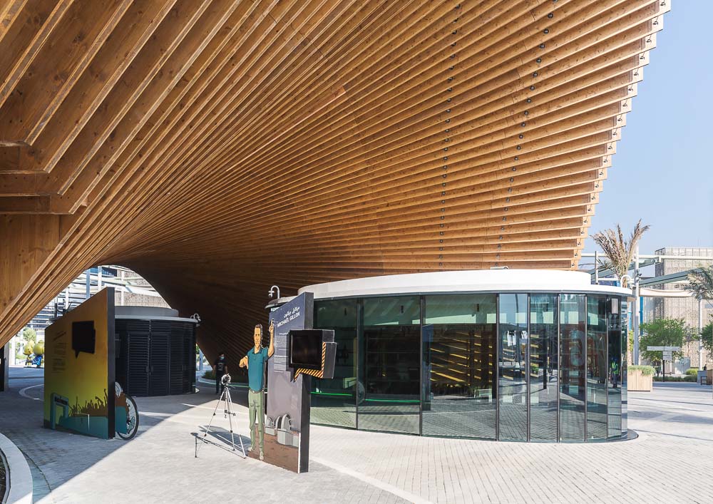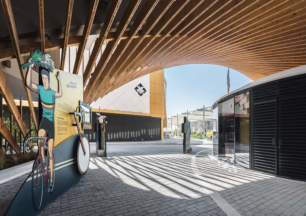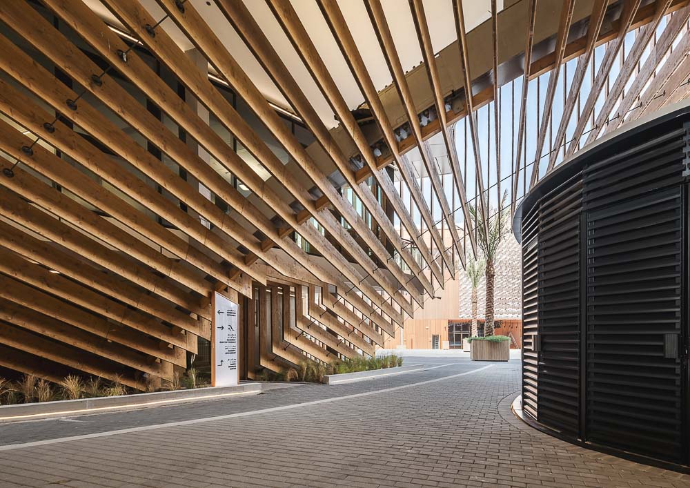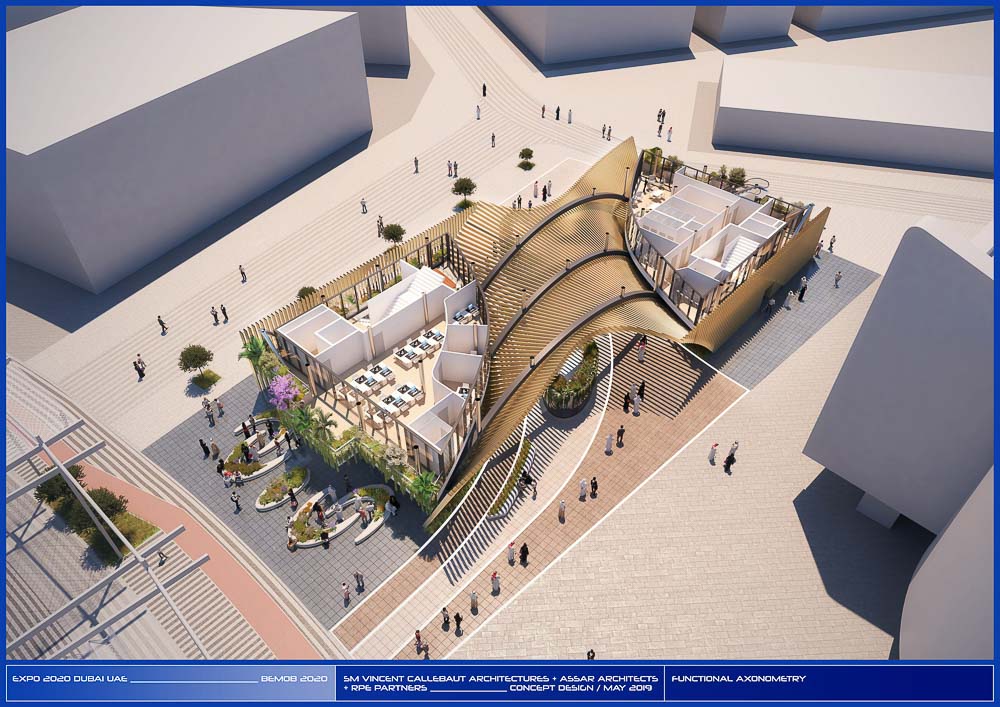 The Belgian pavilion is called “The Green Arch”, as it combines intensive greenery and futuristic design in solid wood. The pavilion aims to be exemplary in terms of sustainable development. It is an ode to regenerative circular economy, to biobased and geosourced materials, to the integration of bioclimatic rules and renewable energies, as well as to the preservation of biodiversity and nature. Located in the “Mobility District”, the architectural concept of the Belgian pavilion is to offer visitors the largest shaded and naturally ventilated agora in the axis of the prevailing west-east winds of Dubai. Its programming is placed higher up so that a maximum of the groundfloor space is free to use for the public.