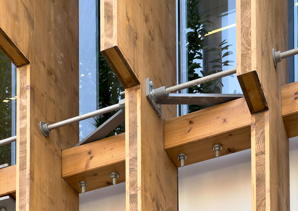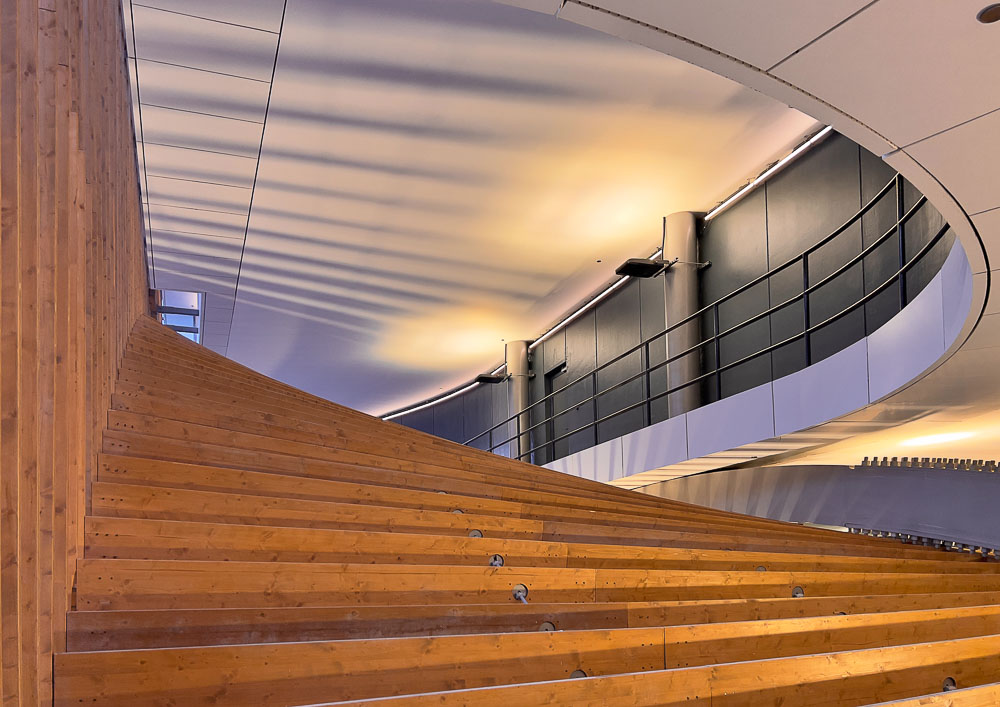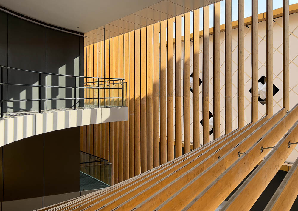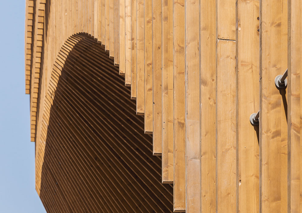 This means that “The Green Arch” is based on a “bridge-building”, creating an immense vault with double curvature between its two pillars. This curvaceous vault is generated from a universal mathematical minimum surface called “hyperbolic paraboloid”. This paraboloid is built in CLT - Cross Laminated Timber - with more than 5.5 linear kilometers of spruce louvers generating a giant wooden Mashrabiya - which by rotating of 180 degrees - envelops the entire project to better protect it from solar radiation.