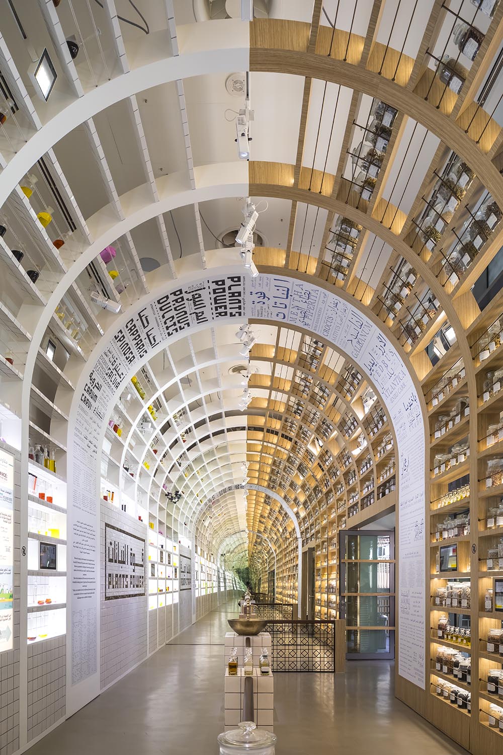 모로코의 토착 마을과 시각적으로 공명하는 22개의 직사각형으로 구성된 파빌리온은 14개의 전시 공간과 식당, 상점, 사무실이 배치되어 있다. 방문객들은 모든 전시 공간을 연결하는 경사로로 내부 ‘거리’를 거닐게 되는데, 이는 미디어에서 이리저리 돌아다니는 경험을 묘사한 것이다. 파빌리온은 토벽의 두께와 여러 개의 수직 정원, 대형 중앙 정원 등으로 소극적이지만 실내 온도 조절 전략을 제시하여 인공적 냉방 공간을 최소화하고 자연 환기와 냉방을 시도하고 있다.