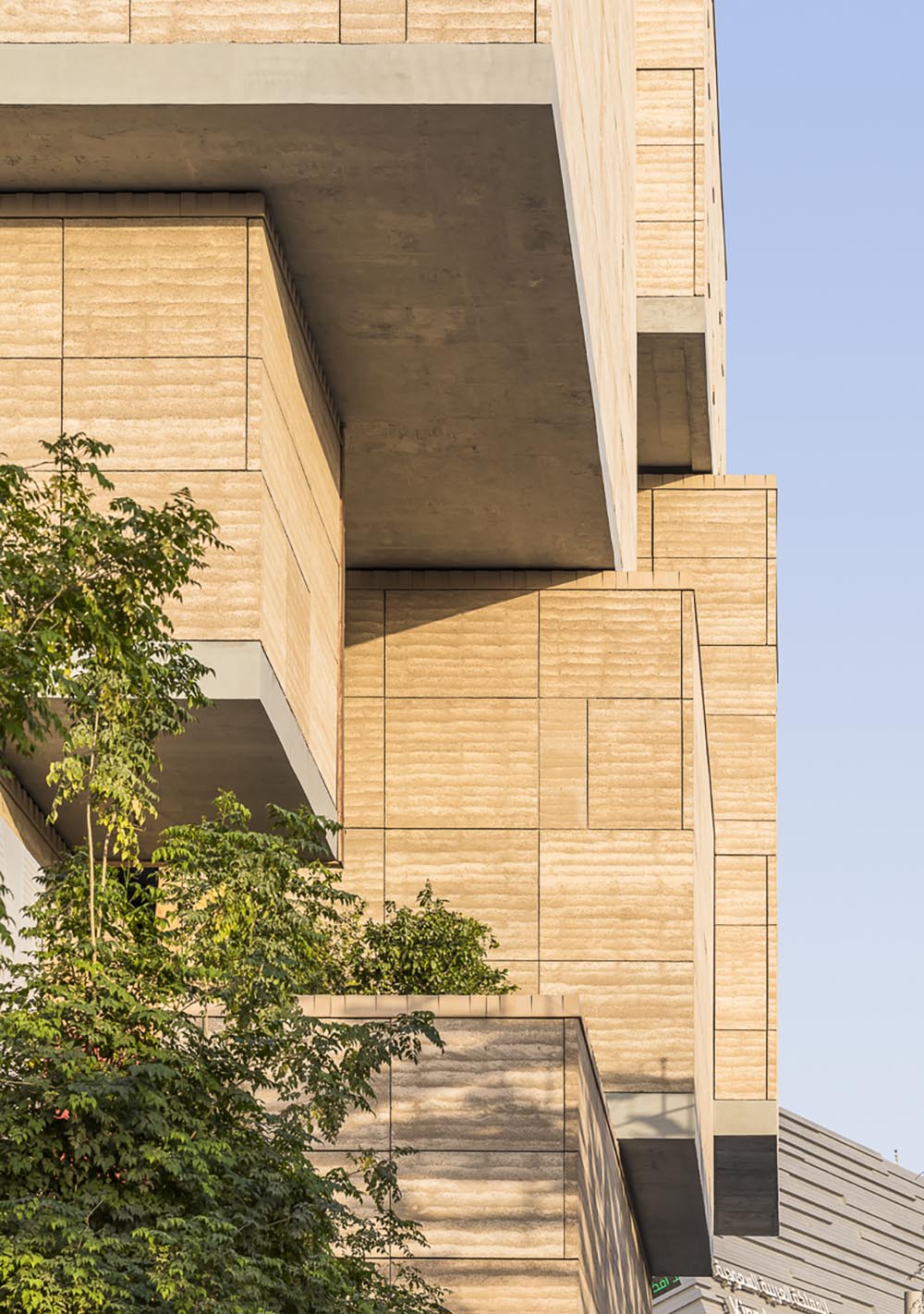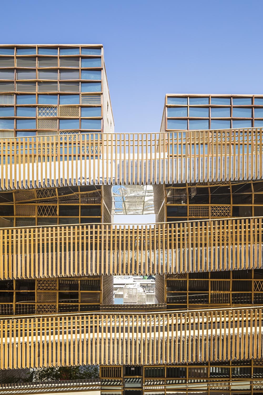34m 높이의 파사드는 흙으로 만든 파사드의 발전을 보여주는 기술적 업적이다. 모로코의 전통적인 건축 재료인 흙다짐 벽(Rammed earth)은 덥고 건조한 지역의 실내 환경을 수동적으로 조절하는 데 중요한 역할을 한다. 파빌리온의 정면 높이를 구축하기 위해 가공되지 않은 압축돈 흙은 경량 콘크리트 프레임과 결합된 조립식 패널로 만들어졌다. 이 패널의 사용은 흙다짐 벽이 전통적이고 혁신적인 재료라는 것을 증명하며, 전통적인 건축 방법이 어떻게 지속 가능한 도시 개발 모델을 고무하는 데 도움이 되는지 보여준다.