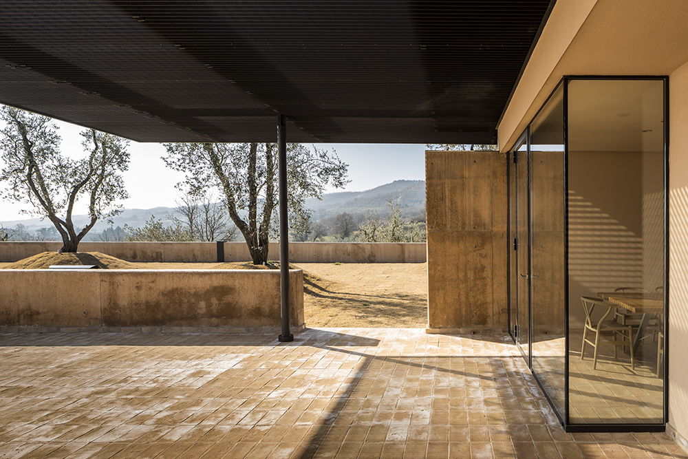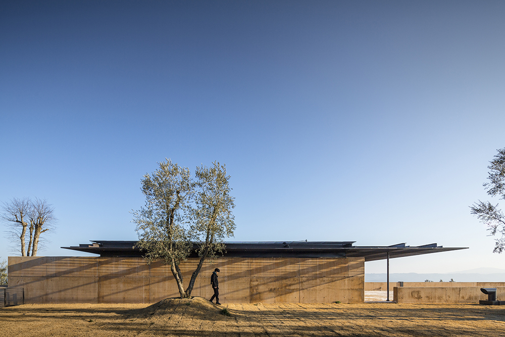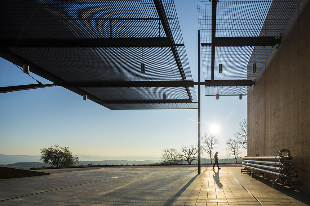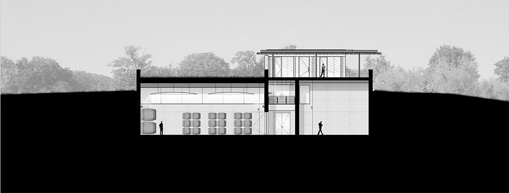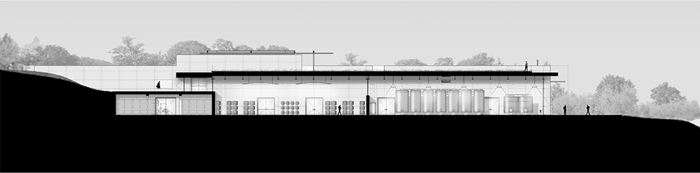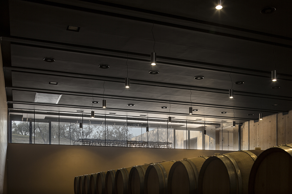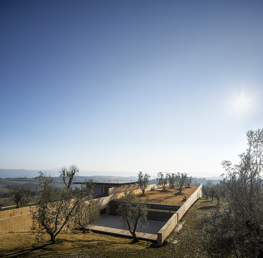 The Winery at Podernuovo is located near San Casciano dei Bagni, in the outskirts of Siena, in Southern Tuscany. It overlooks a vineyard named after the agricultural estate it belongs to. The vineyard, designed to contain spaces accessible to the public, spaces of production, and offices endeavors to reduce as much as possible its impact on the environment. The winery can be accessed from two points: the fist situated by the service entrance near the loading docks, the second by the parking lot used by both visitors and staff. The main county road diverges, branching off into a local road (Strada delle Vigne, “of the vines” in English) which curves left, and intersects the access that leads all transport to the main terrace. By planning the entrance in this manner, the architects managed to avoid the overlap of flows between general and specialized traffic. This zone, on the Eastern side of the winery, is where the first parking area is found. The access road continues uphill towards a secondary parking area and ends at a third parking area, intended principally for staff and visitors. At this point the entrance used by the workers is also accessed, only separately, merging with the office spaces and the production areas, as well as passing by the changing rooms. This split access was intentionally designed in this manner to once more avoid interference with production. Upon access through the principal loading dock, on the left are located three main program areas: the vat cellar, the barrel cellar, and the wine cellar where the bottled wine is stored and left to mature; on the right of the corridor, instead, the architects placed the zones where the final stages of wine production are undertaken (i.e. the main bottling area, a storage for oenological products, a secondary processing area where wine is fined in steel barrels), the staircase to the upper floors, the water reserves (intended for sprinklers, irrigation, flushing) and the warehouse space where the barrels are cleaned. A height of +6.10 meters creates a series of interstitial zones amongst the intermediate programs, like the mechanical rooms above the main production space, the staff changing rooms, the toilets for visitors and the laboratories. The latter are accessed via a private staircase which also leads to the offices. At a similar height of +5.30 meters above the fermentation areas, a wine tasting room overlooks the program. Large panels of glass compose two sides of the room, allowing incredible visibility into the barrel storage area and into the garden, which is enclosed by two of the concrete walls and slopes towards the upper levels of the project. A ramp also at this level allows access to the exterior of the winery and continues the plane out towards the landscape. A large entrance serves as a vestibule for both the people who access the space via the staircase and those coming from the outside. By means of a glass door, the main corridor overlooking the terrace is once more accessed. The wine tasting room, the meeting rooms, the offices with six workstations, and toilets, can be entered from both sides of the axis. The production zones and the meeting rooms are enclosed by large glass walls that overlook the terrace which was partly tiled, whilst the rest forms a distinctive green roof over the program areas. The shades are a distinctive detail throughout the building. Conceived as a light metallic frame structure, they cover the entrance, act as a roof in specific locations and protect the offices from direct sunlight. On the ground floor the large glass panels span the entire width of the rooms and visually connect the vat cellar with the exterior whichm during harvest, is transformed into an incredibly dynamic space and is one of the most fascinating sights to oversee. The materials for the building were chosen to integrate the architecture, as much as possible, with the landscape of its surroundings. Exposed concrete, brick, klinker, varnished steel, glass are all the materials that characterize the envelope of the winery. The long walls that traverse and anchor the project are exposed and painted in a color similar to the hue of clay which characterizes the earth in Tuscany; it is as if they had just emerged from the ground to house a process older even than the Etruscan antecedents of the land. The building is further embellished by a green roof and shades over the offices and main production areas.