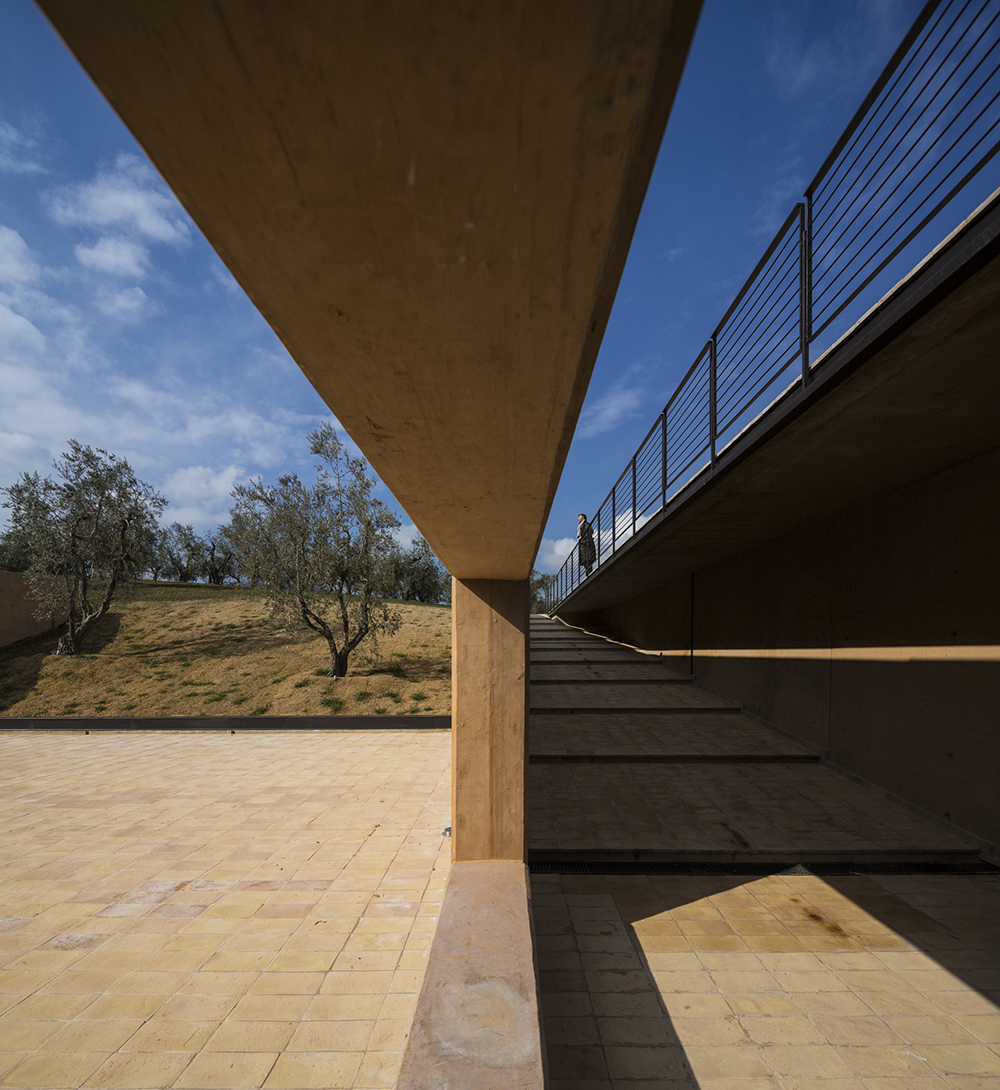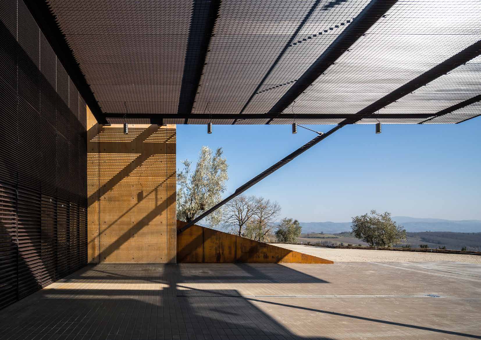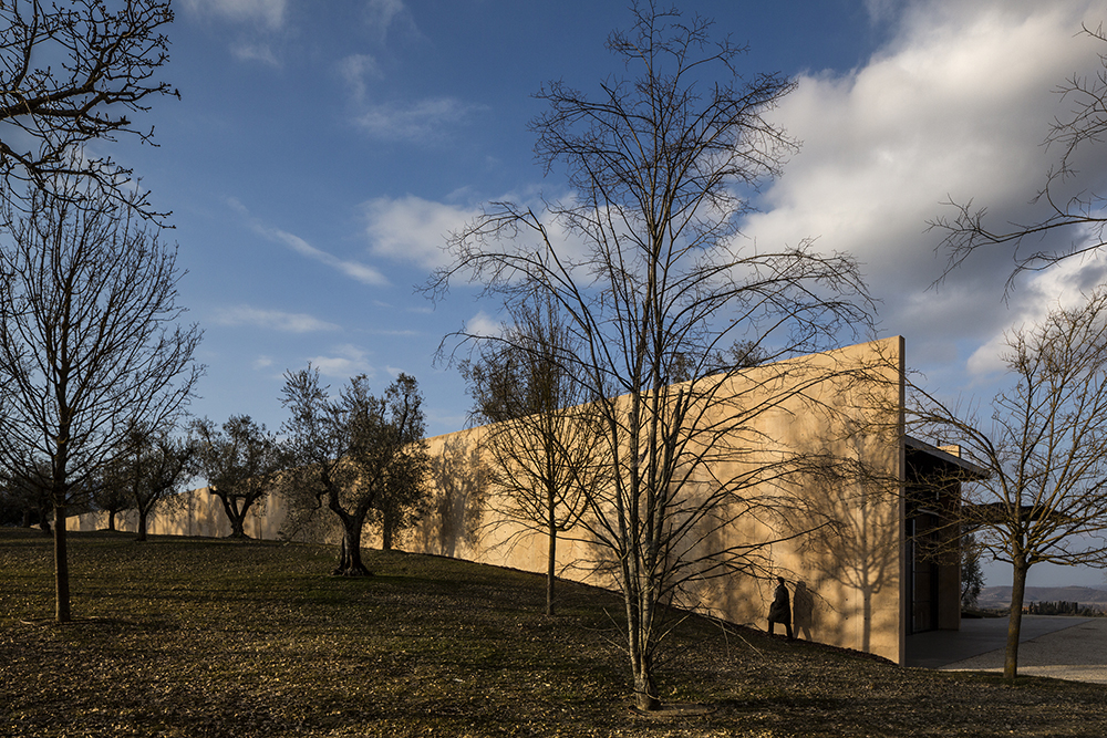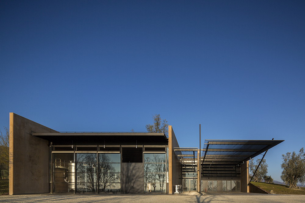 The Winery at Podernuovo is located near San Casciano dei Bagni, in the outskirts of Siena, in Southern Tuscany. It overlooks a vineyard named after the agricultural estate it belongs to. The vineyard, designed to contain spaces accessible to the public, spaces of production, and offices endeavors to reduce as much as possible its impact on the environment. The winery can be accessed from two points: the fist situated by the service entrance near the loading docks, the second by the parking lot used by both visitors and staff. The main county road diverges, branching off into a local road (Strada delle Vigne, “of the vines” in English) which curves left, and intersects the access that leads all transport to the main terrace. By planning the entrance in this manner, the architects managed to avoid the overlap of flows between general and specialized traffic. This zone, on the Eastern side of the winery, is where the first parking area is found. The access road continues uphill towards a secondary parking area and ends at a third parking area, intended principally for staff and visitors. At this point the entrance used by the workers is also accessed, only separately, merging with the office spaces and the production areas, as well as passing by the changing rooms. This split access was intentionally designed in this manner to once more avoid interference with production. Upon access through the principal loading dock, on the left are located three main program areas: the vat cellar, the barrel cellar, and the wine cellar where the bottled wine is stored and left to mature; on the right of the corridor, instead, the architects placed the zones where the final stages of wine production are undertaken (i.e. the main bottling area, a storage for oenological products, a secondary processing area where wine is fined in steel barrels), the staircase to the upper floors, the water reserves (intended for sprinklers, irrigation, flushing) and the warehouse space where the barrels are cleaned. A height of +6.10 meters creates a series of interstitial zones amongst the intermediate programs, like the mechanical rooms above the main production space, the staff changing rooms, the toilets for visitors and the laboratories. The latter are accessed via a private staircase which also leads to the offices. At a similar height of +5.30 meters above the fermentation areas, a wine tasting room overlooks the program. Large panels of glass compose two sides of the room, allowing incredible visibility into the barrel storage area and into the garden, which is enclosed by two of the concrete walls and slopes towards the upper levels of the project. A ramp also at this level allows access to the exterior of the winery and continues the plane out towards the landscape. A large entrance serves as a vestibule for both the people who access the space via the staircase and those coming from the outside. By means of a glass door, the main corridor overlooking the terrace is once more accessed. The wine tasting room, the meeting rooms, the offices with six workstations, and toilets, can be entered from both sides of the axis. The production zones and the meeting rooms are enclosed by large glass walls that overlook the terrace which was partly tiled, whilst the rest forms a distinctive green roof over the program areas. The shades are a distinctive detail throughout the building. Conceived as a light metallic frame structure, they cover the entrance, act as a roof in specific locations and protect the offices from direct sunlight. On the ground floor the large glass panels span the entire width of the rooms and visually connect the vat cellar with the exterior whichm during harvest, is transformed into an incredibly dynamic space and is one of the most fascinating sights to oversee. The materials for the building were chosen to integrate the architecture, as much as possible, with the landscape of its surroundings. Exposed concrete, brick, klinker, varnished steel, glass are all the materials that characterize the envelope of the winery. The long walls that traverse and anchor the project are exposed and painted in a color similar to the hue of clay which characterizes the earth in Tuscany; it is as if they had just emerged from the ground to house a process older even than the Etruscan antecedents of the land. The building is further embellished by a green roof and shades over the offices and main production areas.