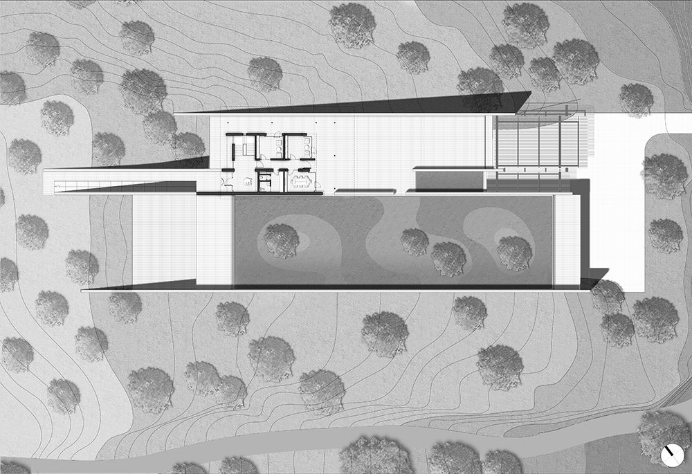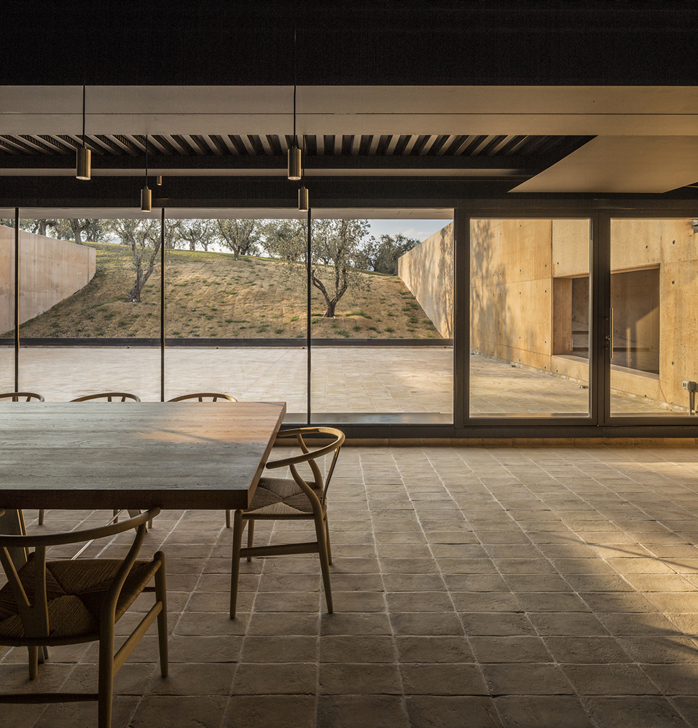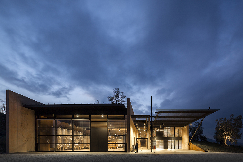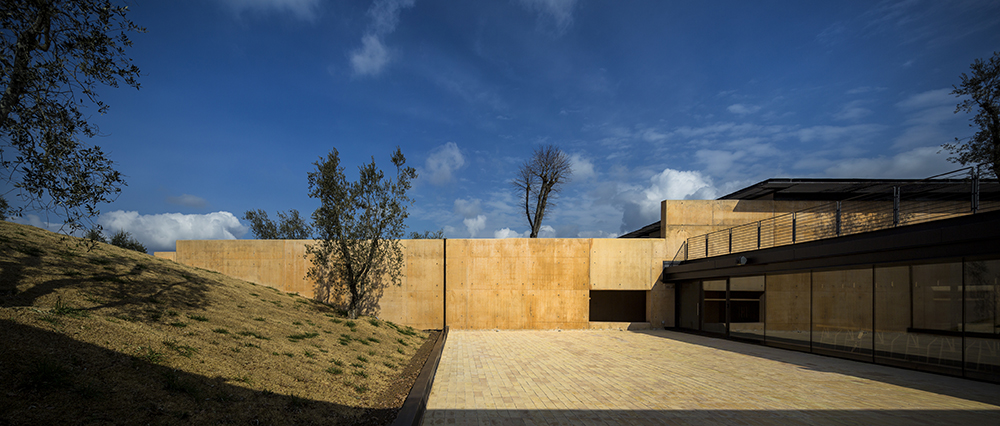 The Winery at Podernuovo is located near San Casciano dei Bagni, in the outskirts of Siena, in Southern Tuscany. It overlooks a vineyard named after the agricultural estate it belongs to. The vineyard, designed to contain spaces accessible to the public, spaces of production, and offices endeavors to reduce as much as possible its impact on the environment. The winery can be accessed from two points: the fist situated by the service entrance near the loading docks, the second by the parking lot used by both visitors and staff. The main county road diverges, branching off into a local road (Strada delle Vigne, “of the vines” in English) which curves left, and intersects the access that leads all transport to the main terrace. By planning the entrance in this manner, the architects managed to avoid the overlap of flows between general and specialized traffic. This zone, on the Eastern side of the winery, is where the first parking area is found. The access road continues uphill towards a secondary parking area and ends at a third parking area, intended principally for staff and visitors. At this point the entrance used by the workers is also accessed, only separately, merging with the office spaces and the production areas, as well as passing by the changing rooms. This split access was intentionally designed in this manner to once more avoid interference with production. Upon access through the principal loading dock, on the left are located three main program areas: the vat cellar, the barrel cellar, and the wine cellar where the bottled wine is stored and left to mature; on the right of the corridor, instead, the architects placed the zones where the final stages of wine production are undertaken (i.e. the main bottling area, a storage for oenological products, a secondary processing area where wine is fined in steel barrels), the staircase to the upper floors, the water reserves (intended for sprinklers, irrigation, flushing) and the warehouse space where the barrels are cleaned. A height of +6.10 meters creates a series of interstitial zones amongst the intermediate programs, like the mechanical rooms above the main production space, the staff changing rooms, the toilets for visitors and the laboratories. The latter are accessed via a private staircase which also leads to the offices. At a similar height of +5.30 meters above the fermentation areas, a wine tasting room overlooks the program. Large panels of glass compose two sides of the room, allowing incredible visibility into the barrel storage area and into the garden, which is enclosed by two of the concrete walls and slopes towards the upper levels of the project. A ramp also at this level allows access to the exterior of the winery and continues the plane out towards the landscape. A large entrance serves as a vestibule for both the people who access the space via the staircase and those coming from the outside. By means of a glass door, the main corridor overlooking the terrace is once more accessed. The wine tasting room, the meeting rooms, the offices with six workstations, and toilets, can be entered from both sides of the axis. The production zones and the meeting rooms are enclosed by large glass walls that overlook the terrace which was partly tiled, whilst the rest forms a distinctive green roof over the program areas. The shades are a distinctive detail throughout the building. Conceived as a light metallic frame structure, they cover the entrance, act as a roof in specific locations and protect the offices from direct sunlight. On the ground floor the large glass panels span the entire width of the rooms and visually connect the vat cellar with the exterior whichm during harvest, is transformed into an incredibly dynamic space and is one of the most fascinating sights to oversee. The materials for the building were chosen to integrate the architecture, as much as possible, with the landscape of its surroundings. Exposed concrete, brick, klinker, varnished steel, glass are all the materials that characterize the envelope of the winery. The long walls that traverse and anchor the project are exposed and painted in a color similar to the hue of clay which characterizes the earth in Tuscany; it is as if they had just emerged from the ground to house a process older even than the Etruscan antecedents of the land. The building is further embellished by a green roof and shades over the offices and main production areas.