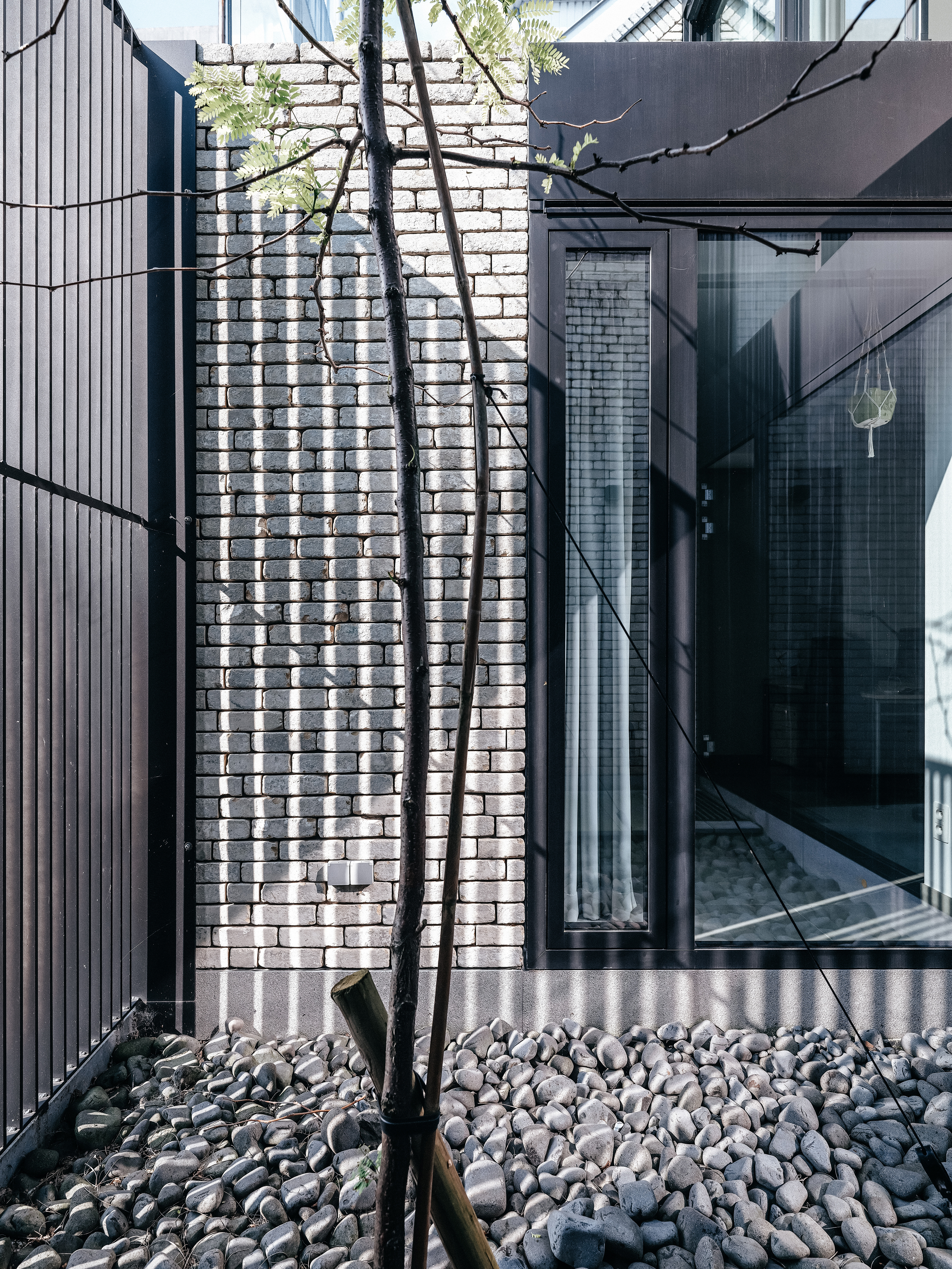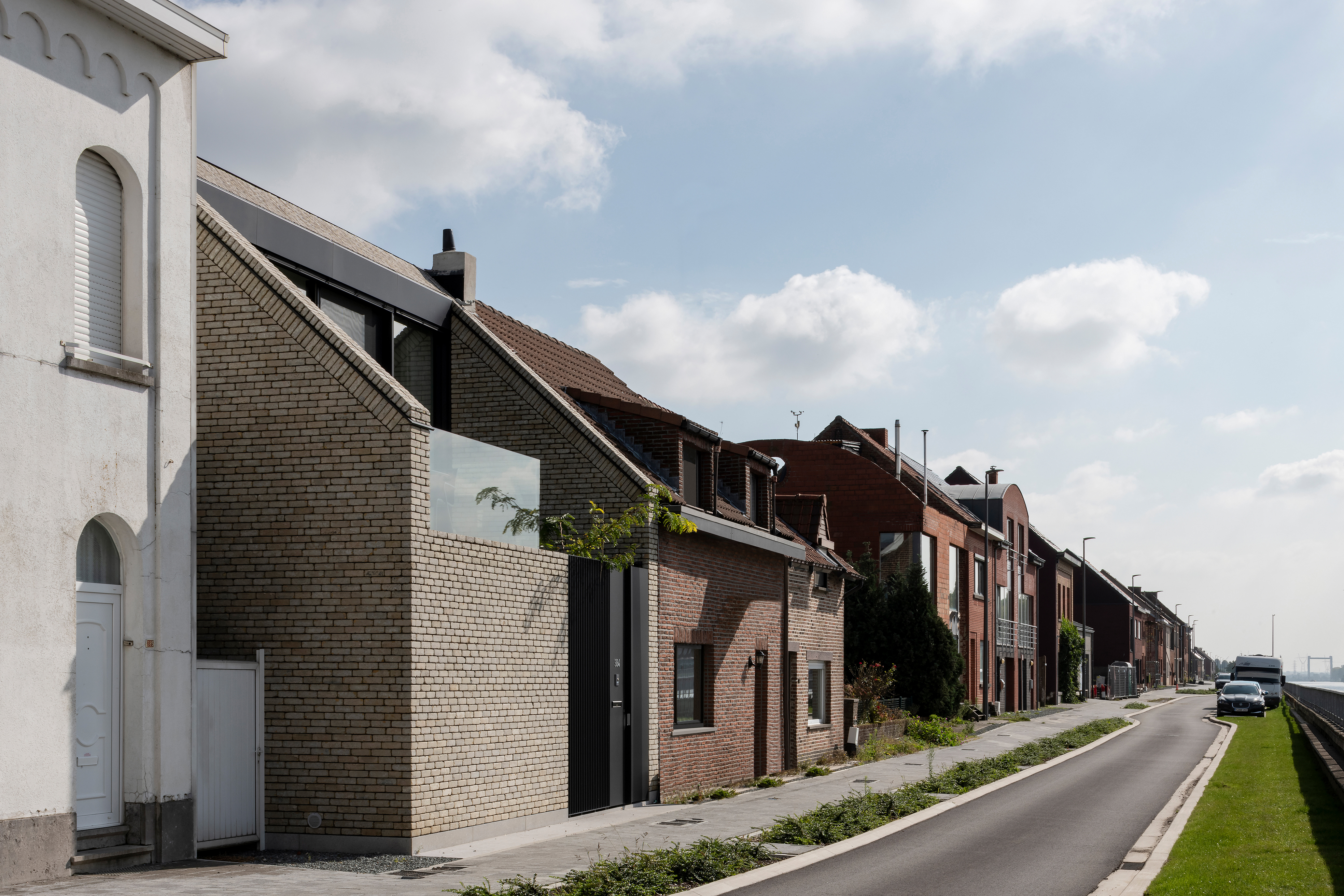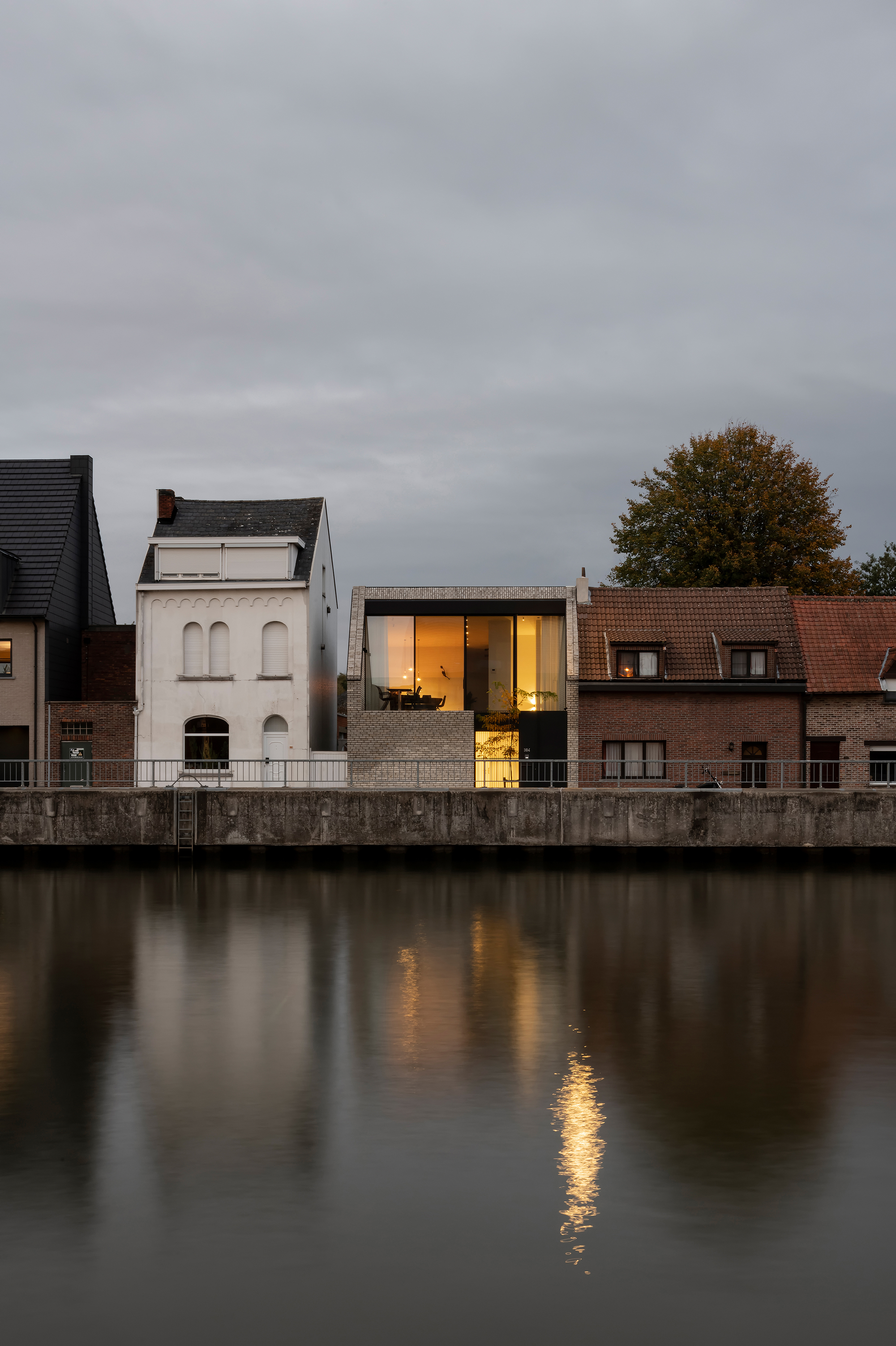 A small residence is inserted with originality among the houses overlooking the Brussel-Scheldt Maritime canal that splits the small town of Humbeek, part of the municipality of Grimbergen, in the province of Flemish Brabant in Belgium. In emphasizing the relationship with the canal, the project of this house draws upon an original spatial configuration based on the definition of a new relationship between the inside and outside. Humbeek Canal House was created to substitute a pre-existing building and makes the most of the available surface area by respectfully placing itself within the profile defined by the row of residential buildings facing the canal, complying to the surrounding gabled roofscape. The architect worked on the volume and distribution of space, emptying part of the original envelope, reversing the program by placing the living area upstairs and the sleeping areas on the ground floor, working on a careful redefinition of the boundaries between indoors and outdoors. The building recedes, resulting in an introverted facade that is organized around a new open space created by the volume subtraction. The project thus determines an unexpected spatial layout consisting of an entrance courtyard on the ground floor, which acts as a filter between the street and the house, matched by a small garden at the back of the house. It is a sort of “Japanese courtyard”. The idea is that of a small secret garden, to be discovered beyond the gate that separates it from the road along the canal. The courtyards also help to determine a spatial continuity between the ground floor and the upper floor, where the living quarters are arranged. The staircase that can be accessed from the entrance courtyard leads to the upper floor and unfolds adjacent to the entrance courtyard, leading to the discovery of the canal view. At this point, the living room projects and expands to the outside through a terrace that brings air and light inside. The relationship established between the interiors, the courtyards and the outdoor spaces helps to define an ideal connection between the two floors and to give the entire intervention a spatial continuity that reveals at every turn a new relationship with the outside.