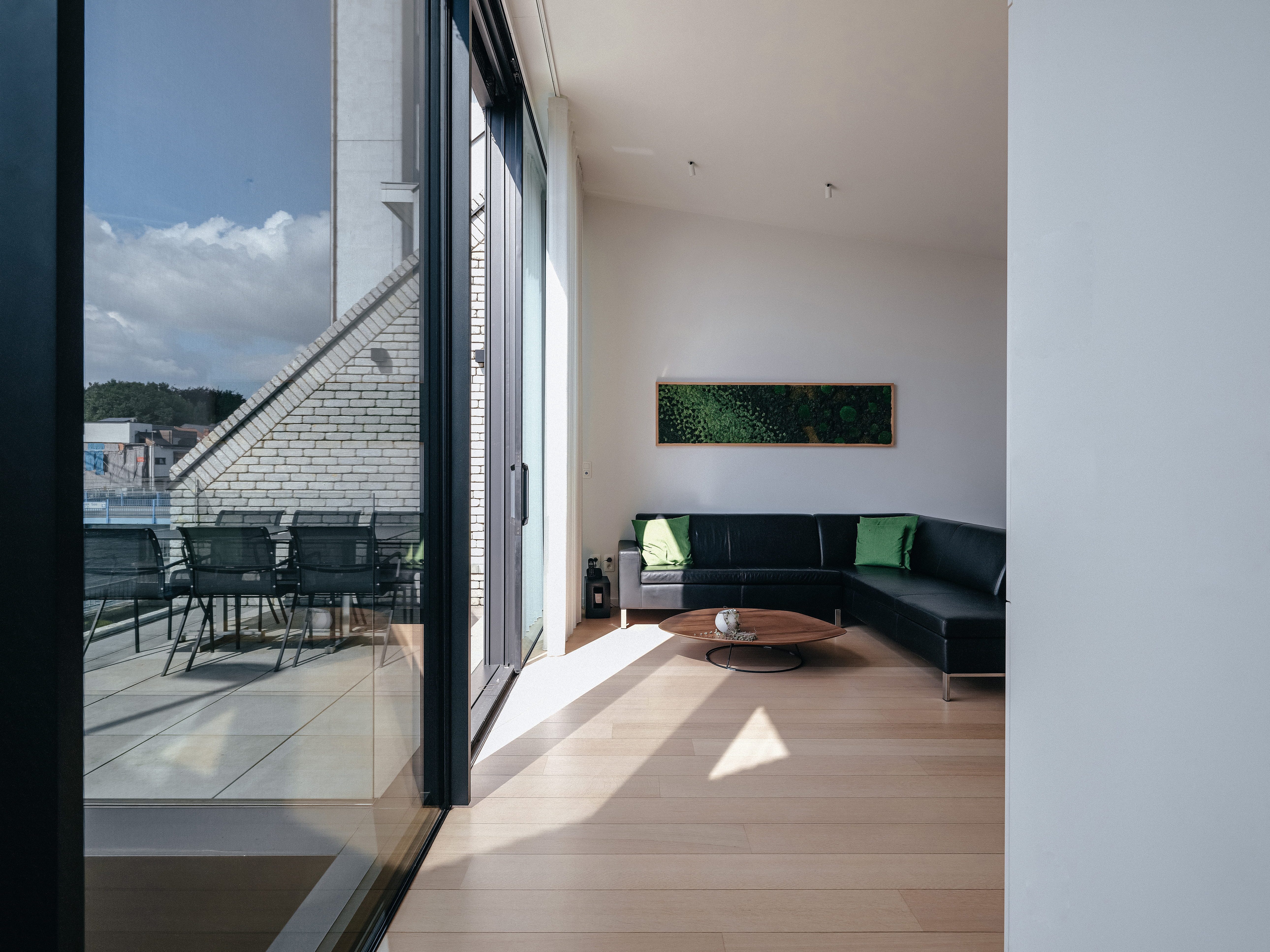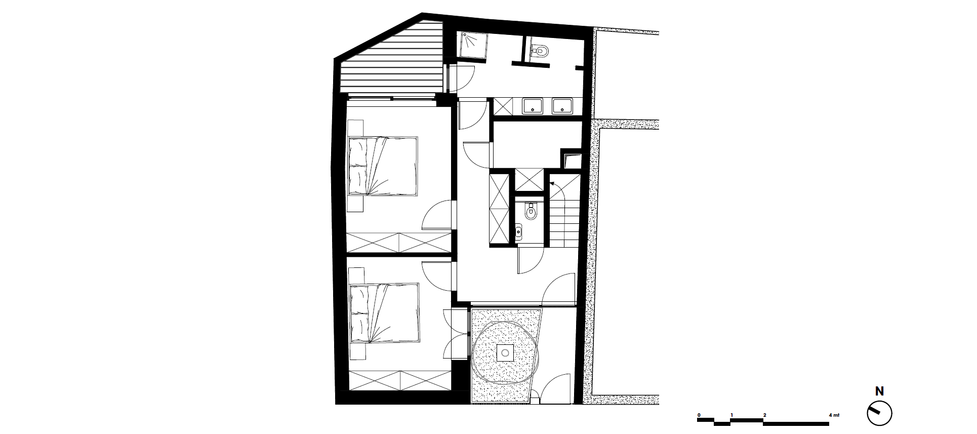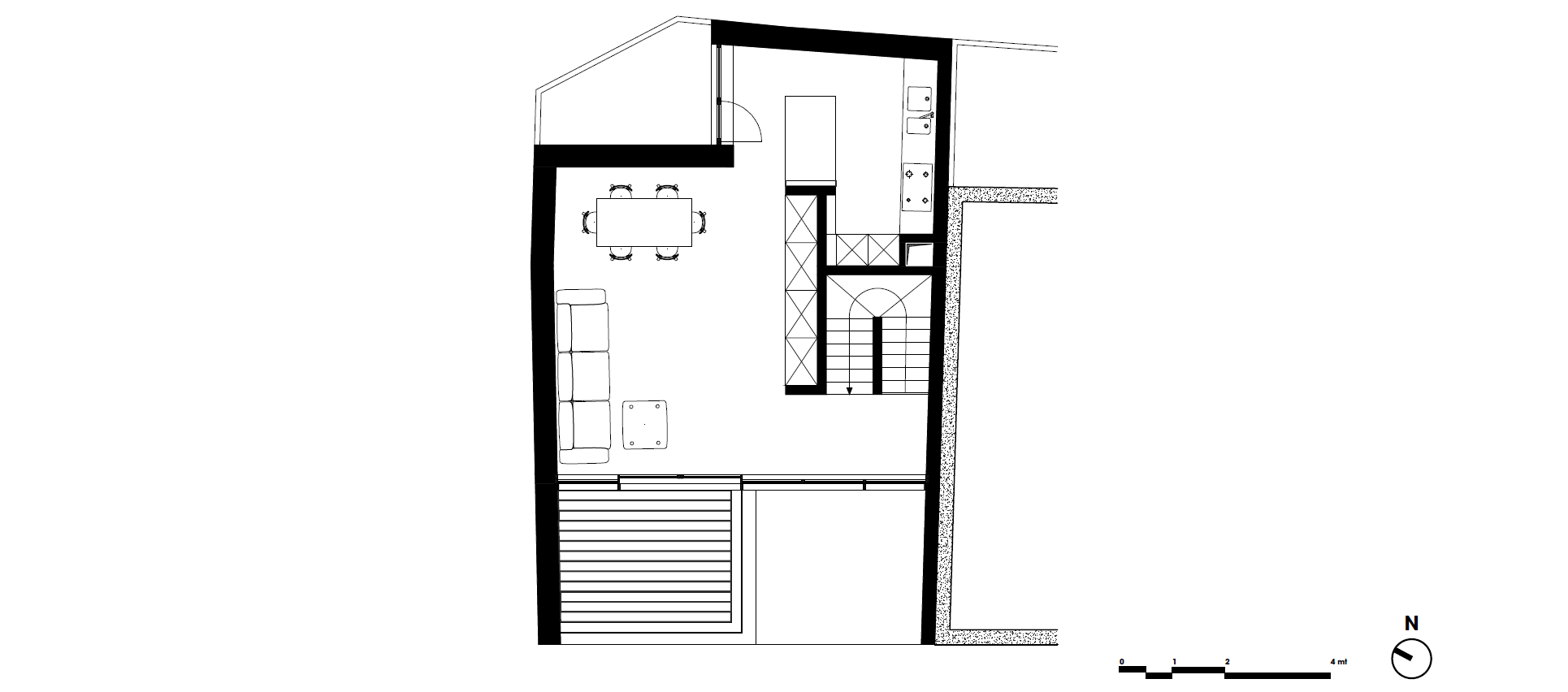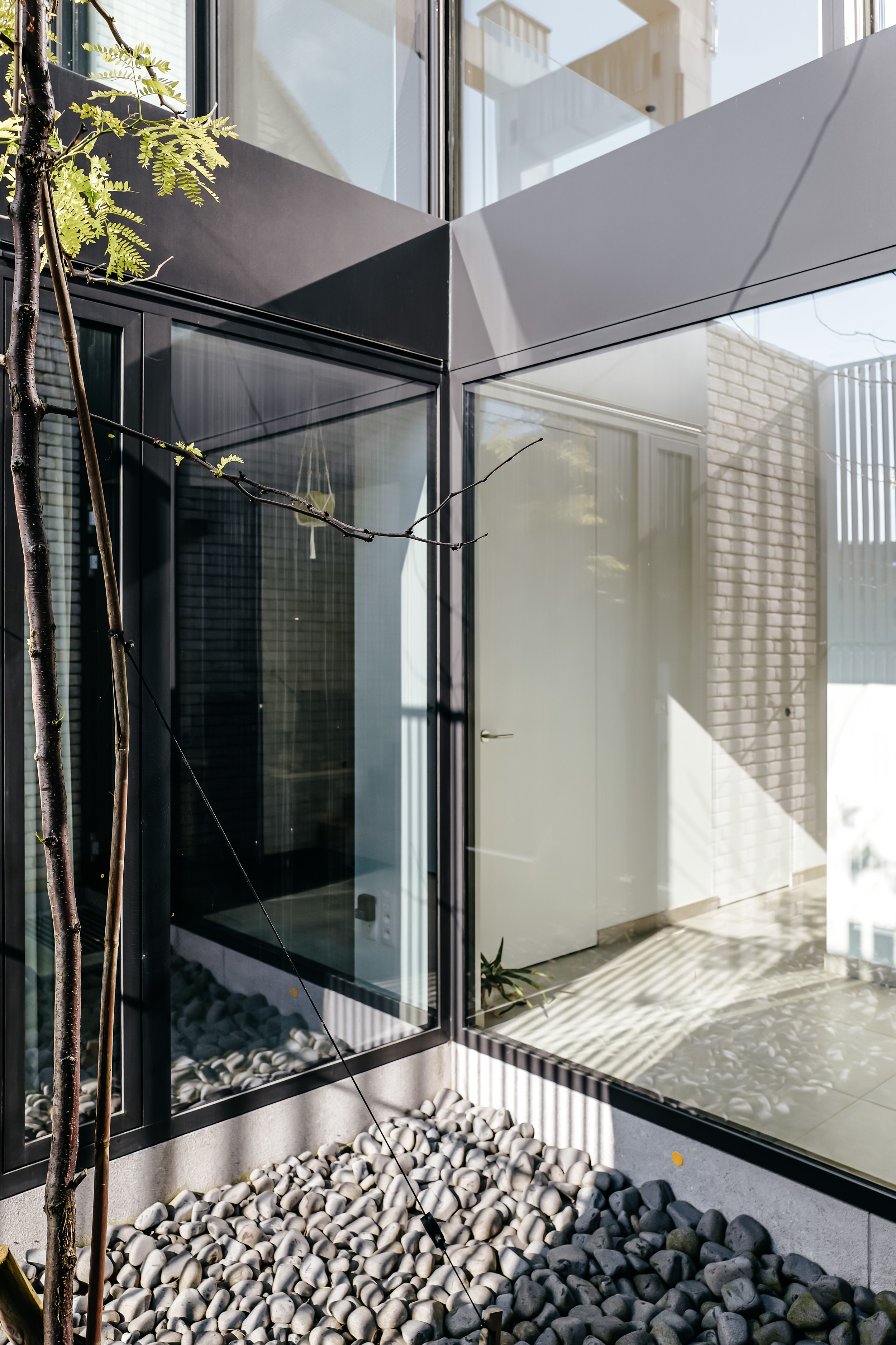 A small residence is inserted with originality among the houses overlooking the Brussel-Scheldt Maritime canal that splits the small town of Humbeek, part of the municipality of Grimbergen, in the province of Flemish Brabant in Belgium. In emphasizing the relationship with the canal, the project of this house draws upon an original spatial configuration based on the definition of a new relationship between the inside and outside. Humbeek Canal House was created to substitute a pre-existing building and makes the most of the available surface area by respectfully placing itself within the profile defined by the row of residential buildings facing the canal, complying to the surrounding gabled roofscape. The architect worked on the volume and distribution of space, emptying part of the original envelope, reversing the program by placing the living area upstairs and the sleeping areas on the ground floor, working on a careful redefinition of the boundaries between indoors and outdoors. The building recedes, resulting in an introverted facade that is organized around a new open space created by the volume subtraction. The project thus determines an unexpected spatial layout consisting of an entrance courtyard on the ground floor, which acts as a filter between the street and the house, matched by a small garden at the back of the house. It is a sort of “Japanese courtyard”. The idea is that of a small secret garden, to be discovered beyond the gate that separates it from the road along the canal. The courtyards also help to determine a spatial continuity between the ground floor and the upper floor, where the living quarters are arranged. The staircase that can be accessed from the entrance courtyard leads to the upper floor and unfolds adjacent to the entrance courtyard, leading to the discovery of the canal view. At this point, the living room projects and expands to the outside through a terrace that brings air and light inside. The relationship established between the interiors, the courtyards and the outdoor spaces helps to define an ideal connection between the two floors and to give the entire intervention a spatial continuity that reveals at every turn a new relationship with the outside.