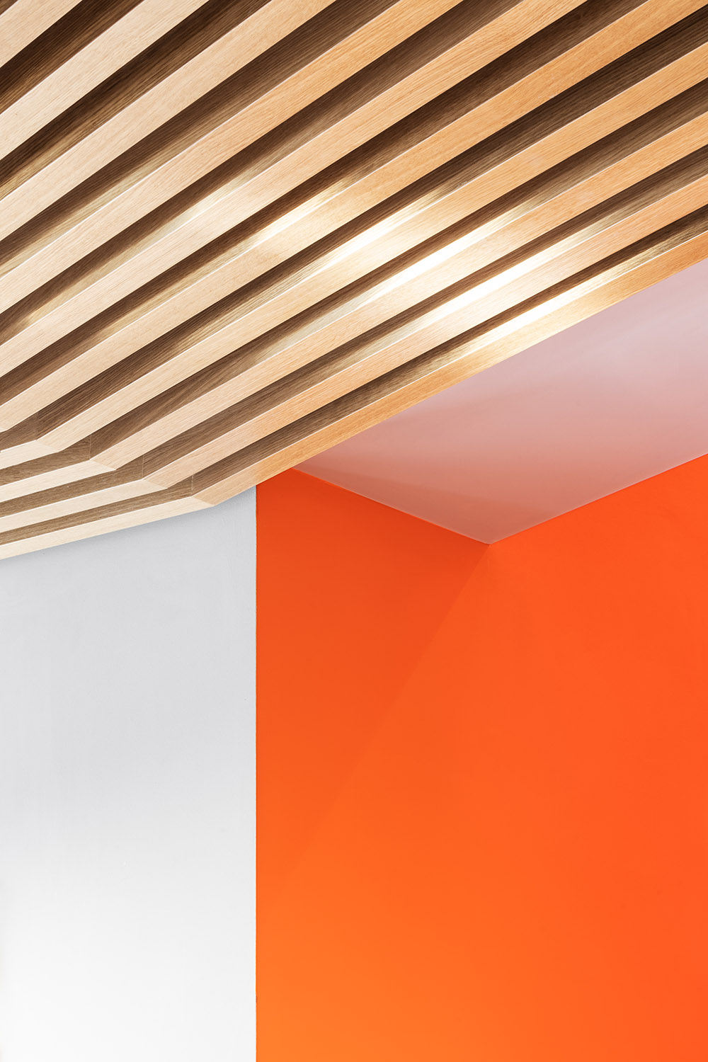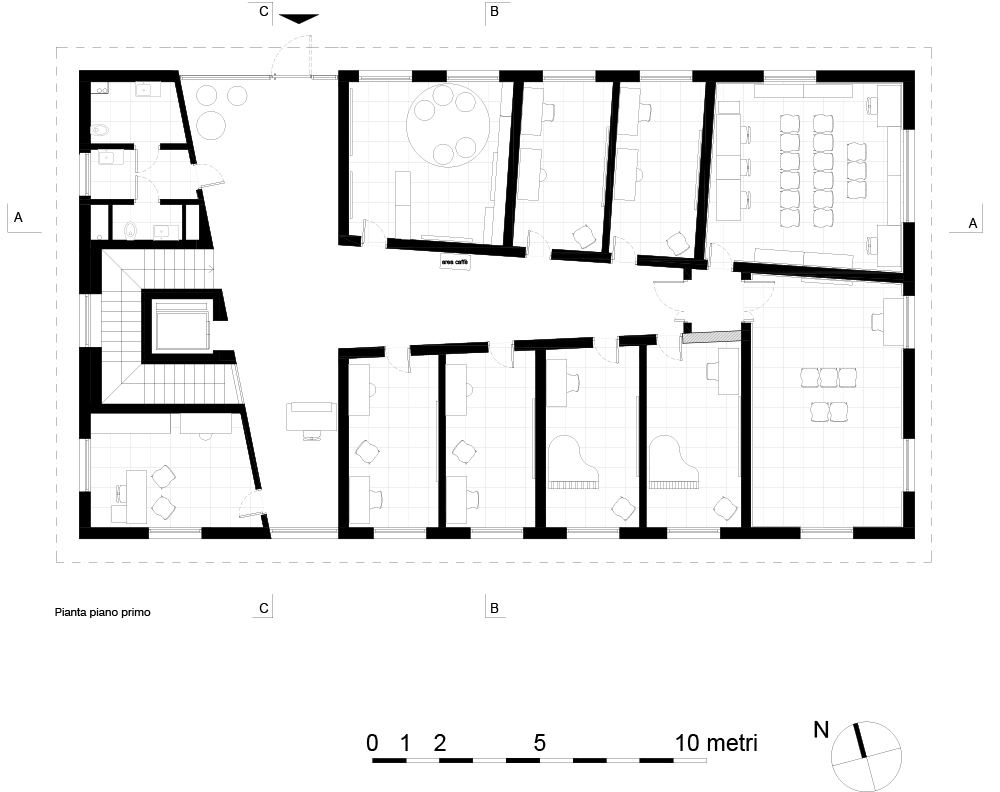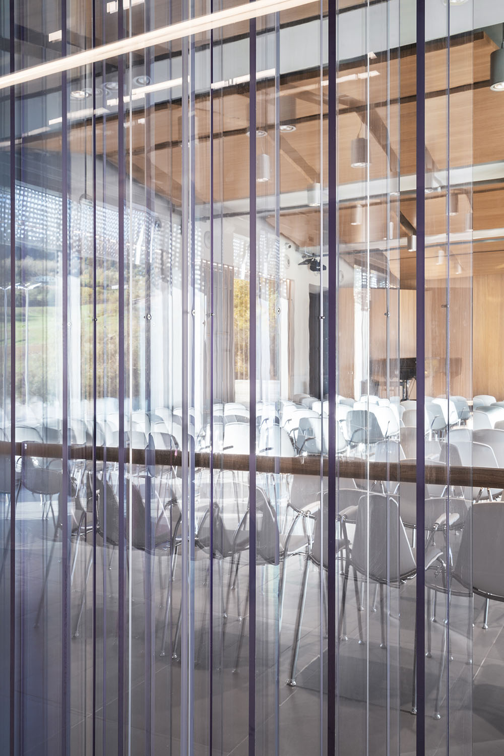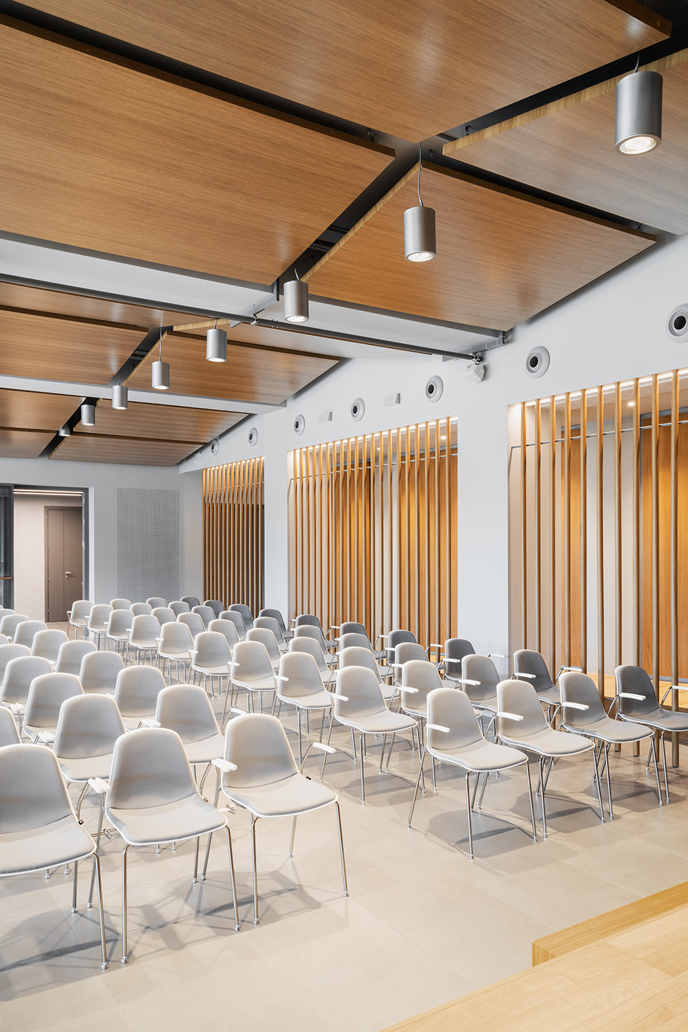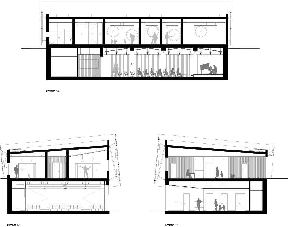 대단하지 않은 크기의 공간을 넓히는 것을 목표로 한 강당의 내부 디자인은 재료의 역동적인 사용이 특징이다. 한편으로는 다양한 경사의 매달린 패널, 원형 스트립, 측면 벽에서 나오는 패널, 목재로 완전히 덮인 배경과 회전 패널이 있는 무대 등 실을 구성하는 여러 표면과 요소의 오크 나무가 있고, 다른 한편으로는 콘크리트가 석기 바닥에서 현관을 향한 뒷벽, 노출된 윗층에서 구조 요소까지 구조를 구축하는 주요 표면을 정의한다. 180석 규모의 좌석은 3개 구역에 걸쳐 있다. 완전히 투명한 뒷벽은 강당을 로비와 직접 연결하여 공간에 대한 인식을 확장한다. 로비에는 직사각형 목재 칸막이가 뒷벽에서 가천장까지 서있으며, 흰색 외피에 의해 생성된 매스의 위치로 정의된 긴장감을 따라 입구 파사드 쪽으로 기울어진다. 교실에서는 필요한 가구와 악기 외에도 거울과 목재 패널이 있어 학생들이 악보를 이용해 개성 있게 꾸밀 수 있다. 뒤편에는 녹음 스튜디오와 전자 음악 수업 및 콘서트를 위해 사용할 있는 두 개의 큰 교실이 있다. 건너편 공간과 달리 어두운 회색이며, 벽에는 특수 미세 천공 목재 패널이 있어 음향 성능을 최적화한다. 위층의 모든 실에서 두 개의 다른 높이에 위치한 원형 창문은 패널의 여러 천공을 통해 여과된 빛을 들여온다.