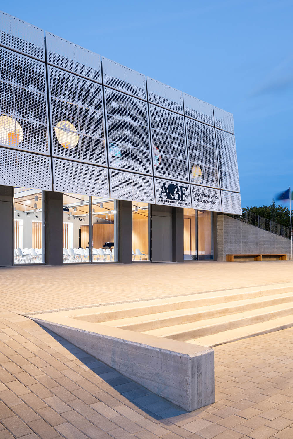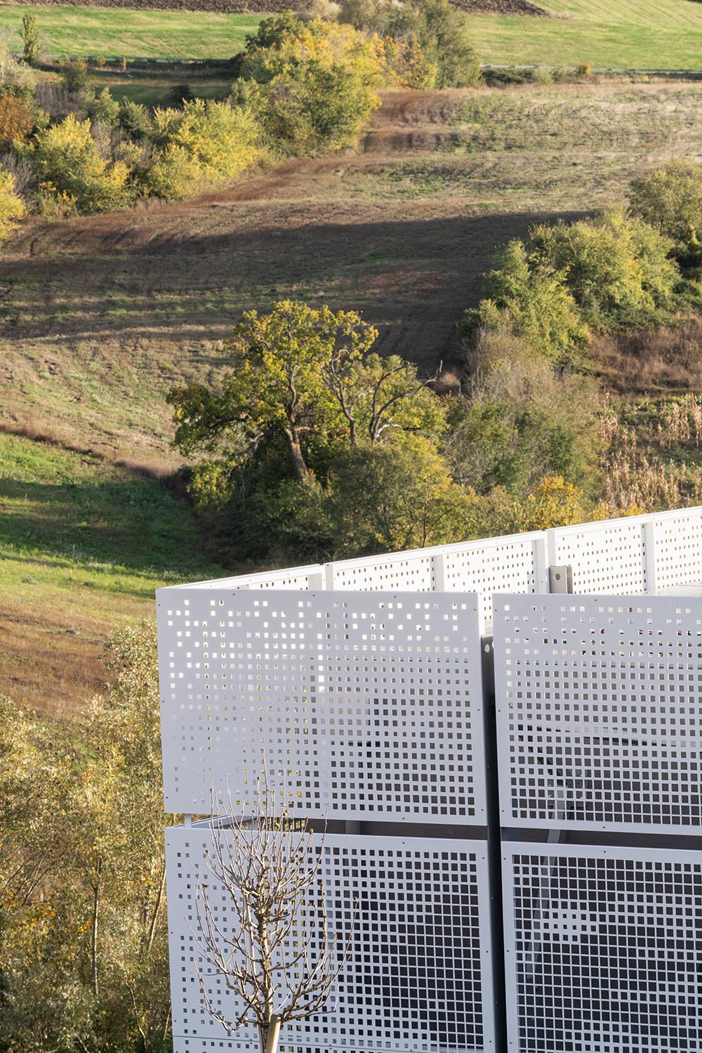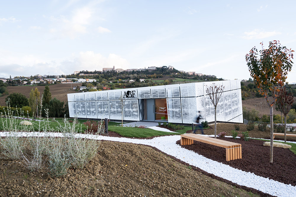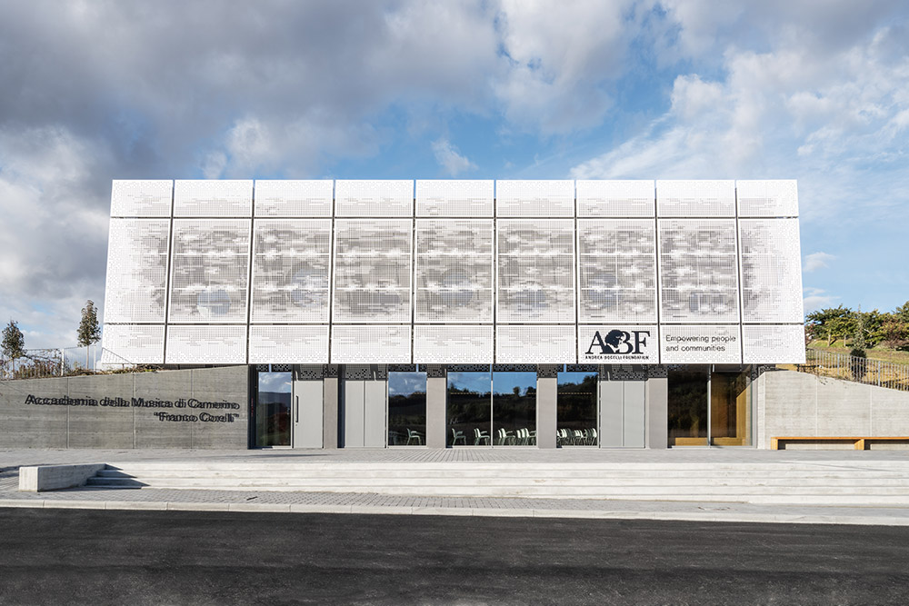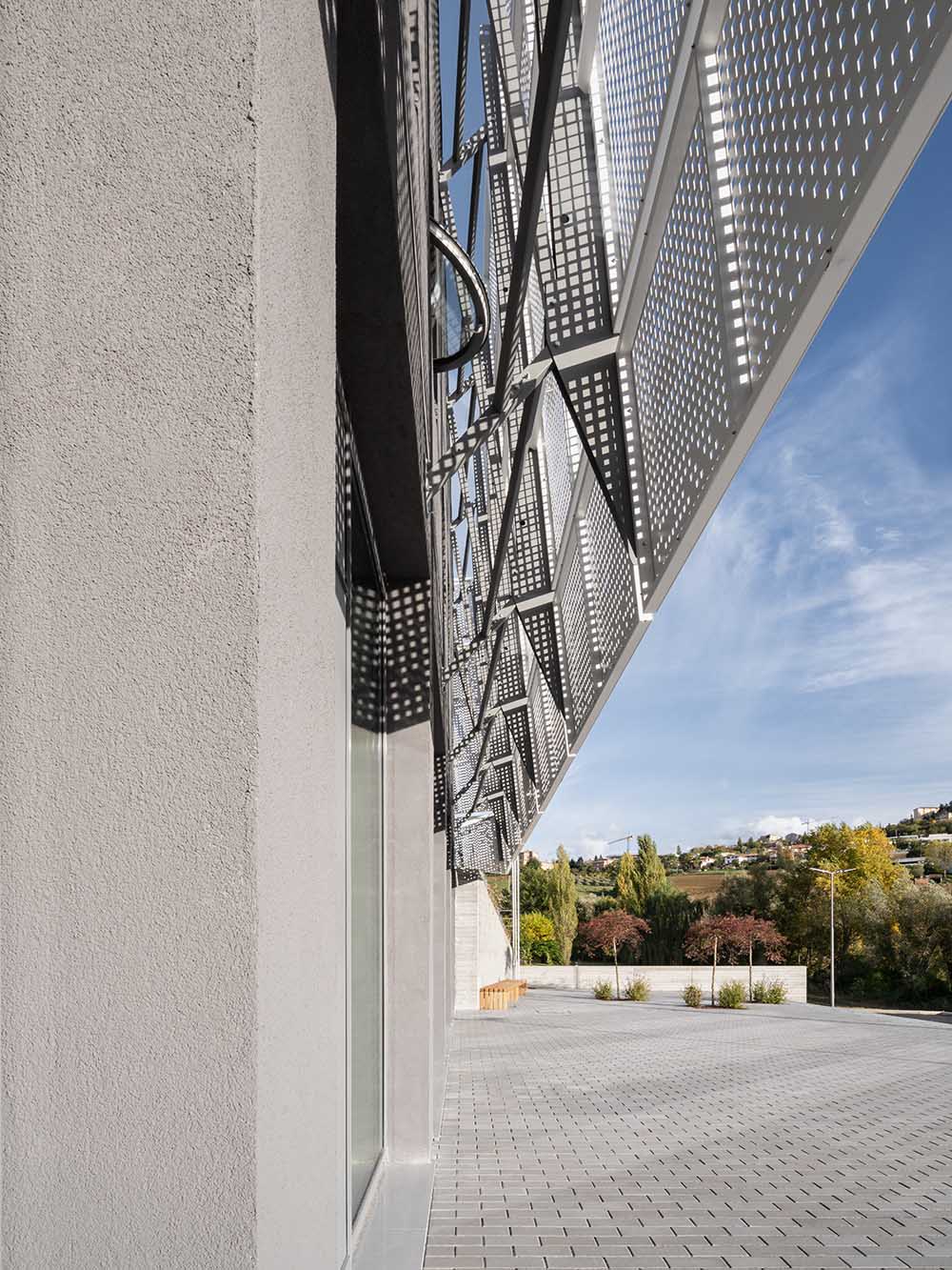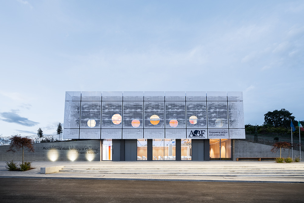 The new Academy of Music to Camerino is giving the structure a significant contemporary look. The project not only returns the local Academy of Music to Camerino, aimed at welcoming over 160 students and the many cultural initiatives of the community, but also gives the university city a new architectural identity. The idea that guided the design was to create a volume that amazed, not only up close, but also from afar. With clean and elegant lines, the building, which is spread over two levels, stands out for its ethereal skin in white sheet metal panels with perforations of varying size. Inspired by the rarefaction and dynamism of clouds, the inclined volume, lying on the slope of the ground and on a glass curtain marked by grey pillars, dissolves into the context. The north façade presents the volume as a box, with the panels suspended a few tens of centimetres from the ground. The two side elevations, on the other hand, show the inclination and slope of the land. The dichromatism of the façade, offered by the dark grey of the external structure, the fixtures and the white of the sheet metal cladding, outlines a graceful but resolute volume. A shady garden and the lower square constitute new open spaces available to the whole community. The interior design of the auditorium, aimed at enhancing the space despite its modest size, is characterized by the dynamic use of materials. Concrete, which defines the main surfaces that forge the structure, from the stoneware floor, to the back wall towards the foyer, and from the exposed upper floor to the structural elements. The 180-seat stalls spread over three sectors. The back wall, entirely transparent, connects the auditorium directly with the foyer, expanding the perception of space. An orange resin staircase brings great liveliness and energy to the environment. The two larger classrooms at the back house recording studios and electronic music lessons-concerts. In contrast to their counterparts, they are dark grey in colour and have special micro-perforated wooden panels on the walls that optimize their acoustic performance. In all the rooms on the upper floor, the circular windows positioned at two different heights welcome in the light that filters through the multiple perforations of the panels. Open all year round and ready to host conferences, events, study activities and workshops at the service of the community, the new architecture presents itself as an educational and innovative forge dedicated to music, capable of giving Camerino a role of reference in the cultural panorama of the Marche region and beyond.