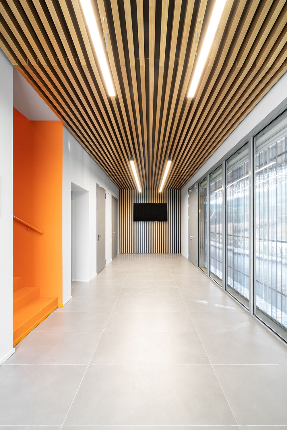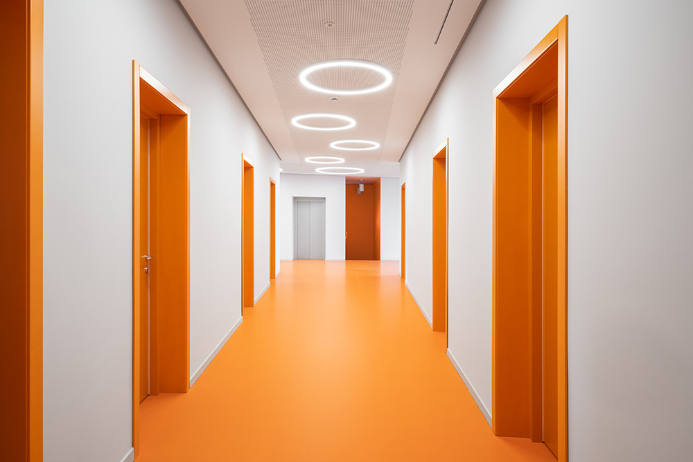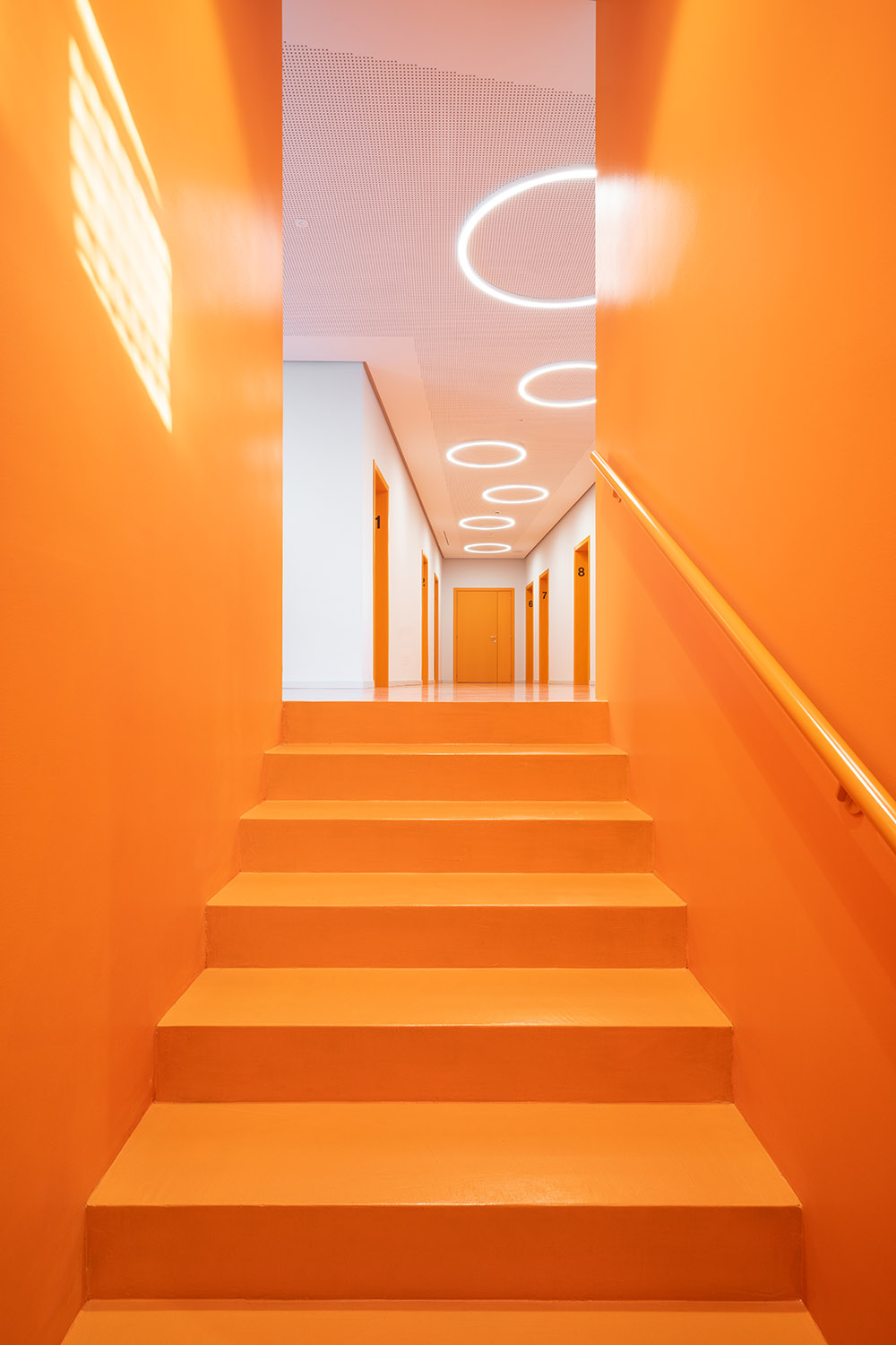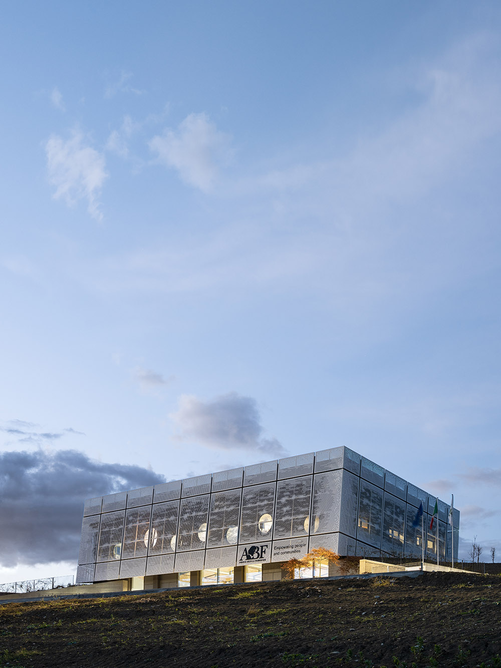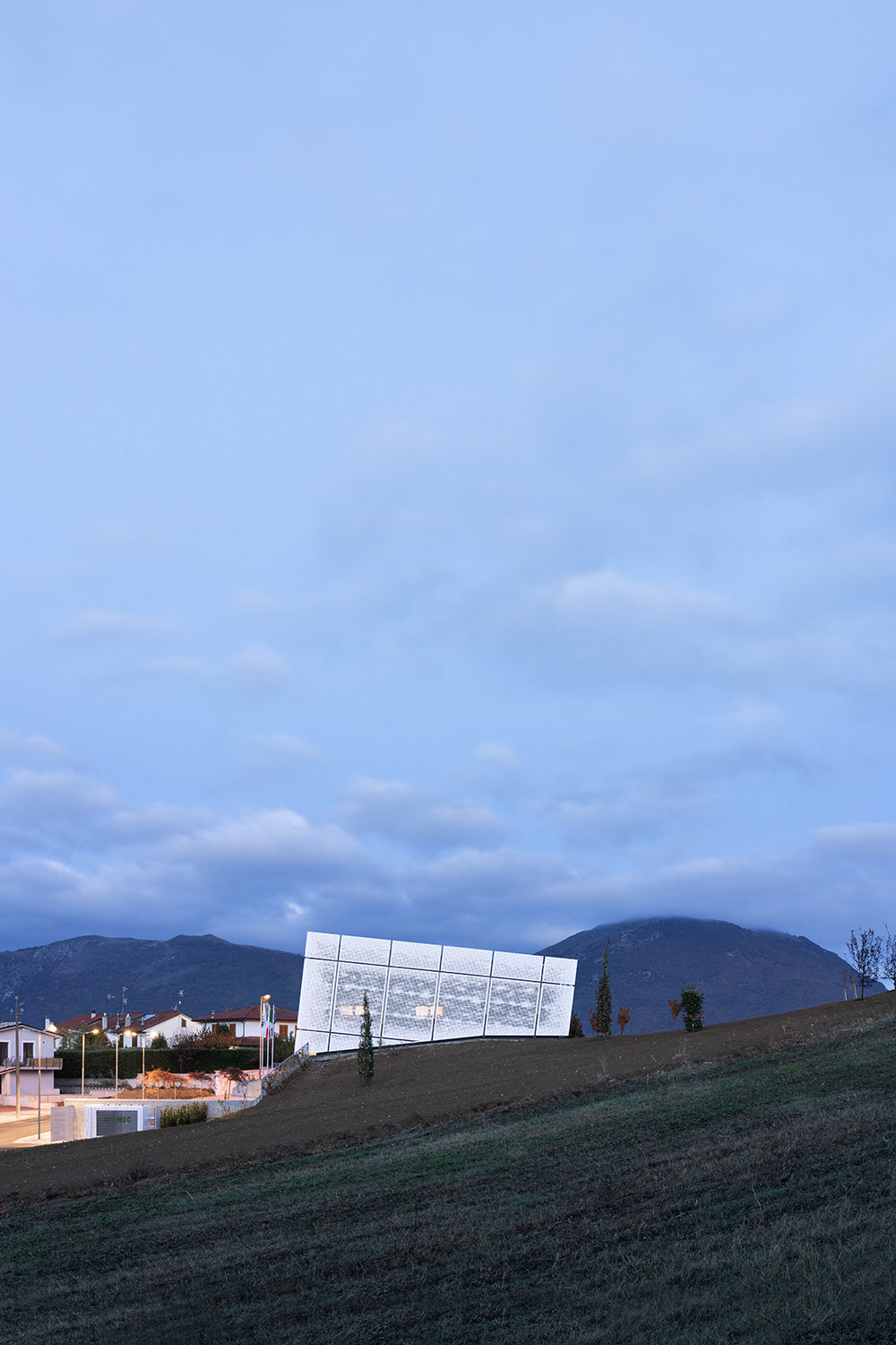 The new Academy of Music to Camerino is giving the structure a significant contemporary look. The project not only returns the local Academy of Music to Camerino, aimed at welcoming over 160 students and the many cultural initiatives of the community, but also gives the university city a new architectural identity. The idea that guided the design was to create a volume that amazed, not only up close, but also from afar. With clean and elegant lines, the building, which is spread over two levels, stands out for its ethereal skin in white sheet metal panels with perforations of varying size. Inspired by the rarefaction and dynamism of clouds, the inclined volume, lying on the slope of the ground and on a glass curtain marked by grey pillars, dissolves into the context. The north façade presents the volume as a box, with the panels suspended a few tens of centimetres from the ground. The two side elevations, on the other hand, show the inclination and slope of the land. The dichromatism of the façade, offered by the dark grey of the external structure, the fixtures and the white of the sheet metal cladding, outlines a graceful but resolute volume. A shady garden and the lower square constitute new open spaces available to the whole community. The interior design of the auditorium, aimed at enhancing the space despite its modest size, is characterized by the dynamic use of materials. Concrete, which defines the main surfaces that forge the structure, from the stoneware floor, to the back wall towards the foyer, and from the exposed upper floor to the structural elements. The 180-seat stalls spread over three sectors. The back wall, entirely transparent, connects the auditorium directly with the foyer, expanding the perception of space. An orange resin staircase brings great liveliness and energy to the environment. The two larger classrooms at the back house recording studios and electronic music lessons-concerts. In contrast to their counterparts, they are dark grey in colour and have special micro-perforated wooden panels on the walls that optimize their acoustic performance. In all the rooms on the upper floor, the circular windows positioned at two different heights welcome in the light that filters through the multiple perforations of the panels. Open all year round and ready to host conferences, events, study activities and workshops at the service of the community, the new architecture presents itself as an educational and innovative forge dedicated to music, capable of giving Camerino a role of reference in the cultural panorama of the Marche region and beyond.