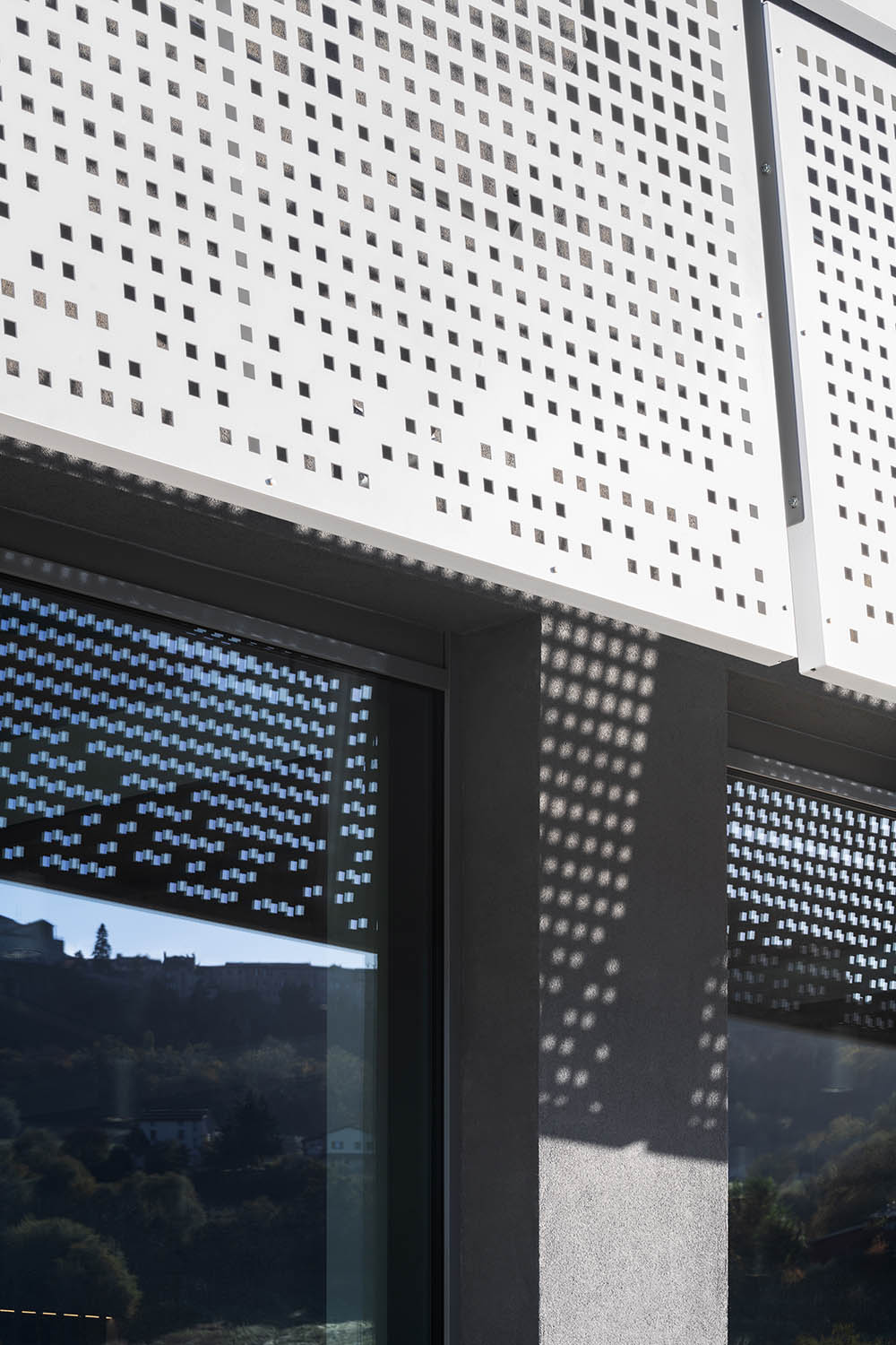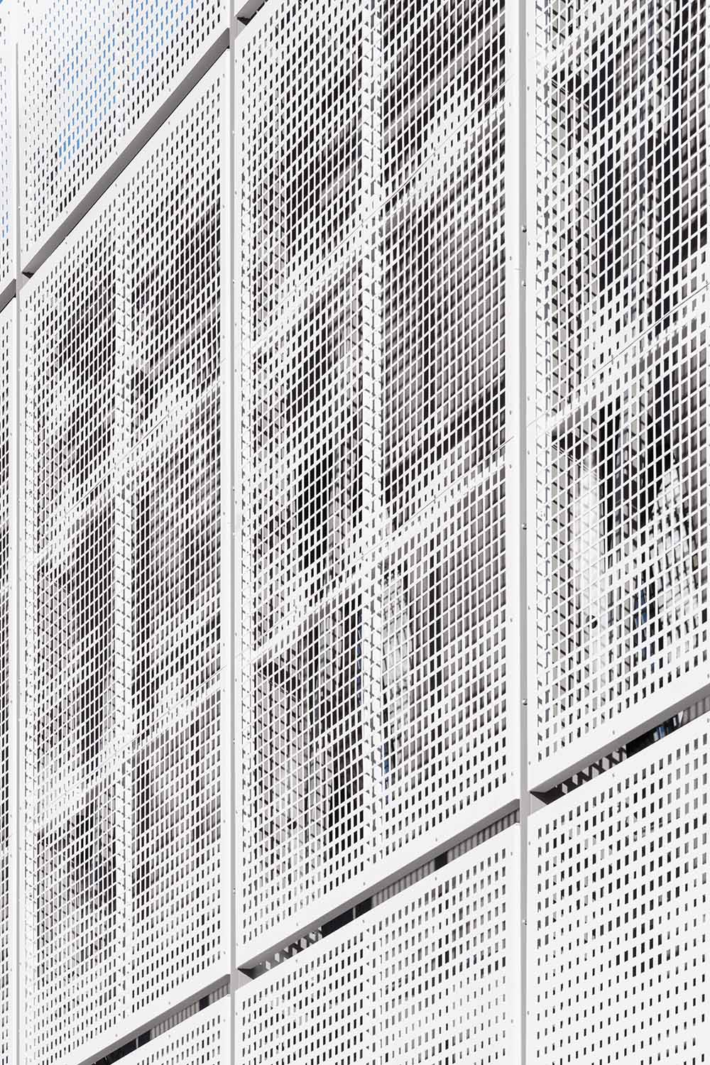 거리와 위쪽 정원에서 보이는 북쪽 파사드는 매스를 상자처럼 보이게 하며, 패널은 지면에서 수십 센티미터 떨어진 곳에 매달려 있다. 반면, 두 개의 측면 입면도는 땅의 경사도를 보여준다. 외부 구조의 짙은 회색과, 고정 장치 및 판금 클래딩의 흰색이 제공하는 파사드의 이색성은 주변과 완벽하게 통합된 동시에 도시 스카이라인을 상징하는 우아하면서도 단호한 매스를 그려낸다. 그늘진 정원과 아래쪽 광장은 지역 전체가 사용할 수 있는 새로운 열린 공간을 구성한다.