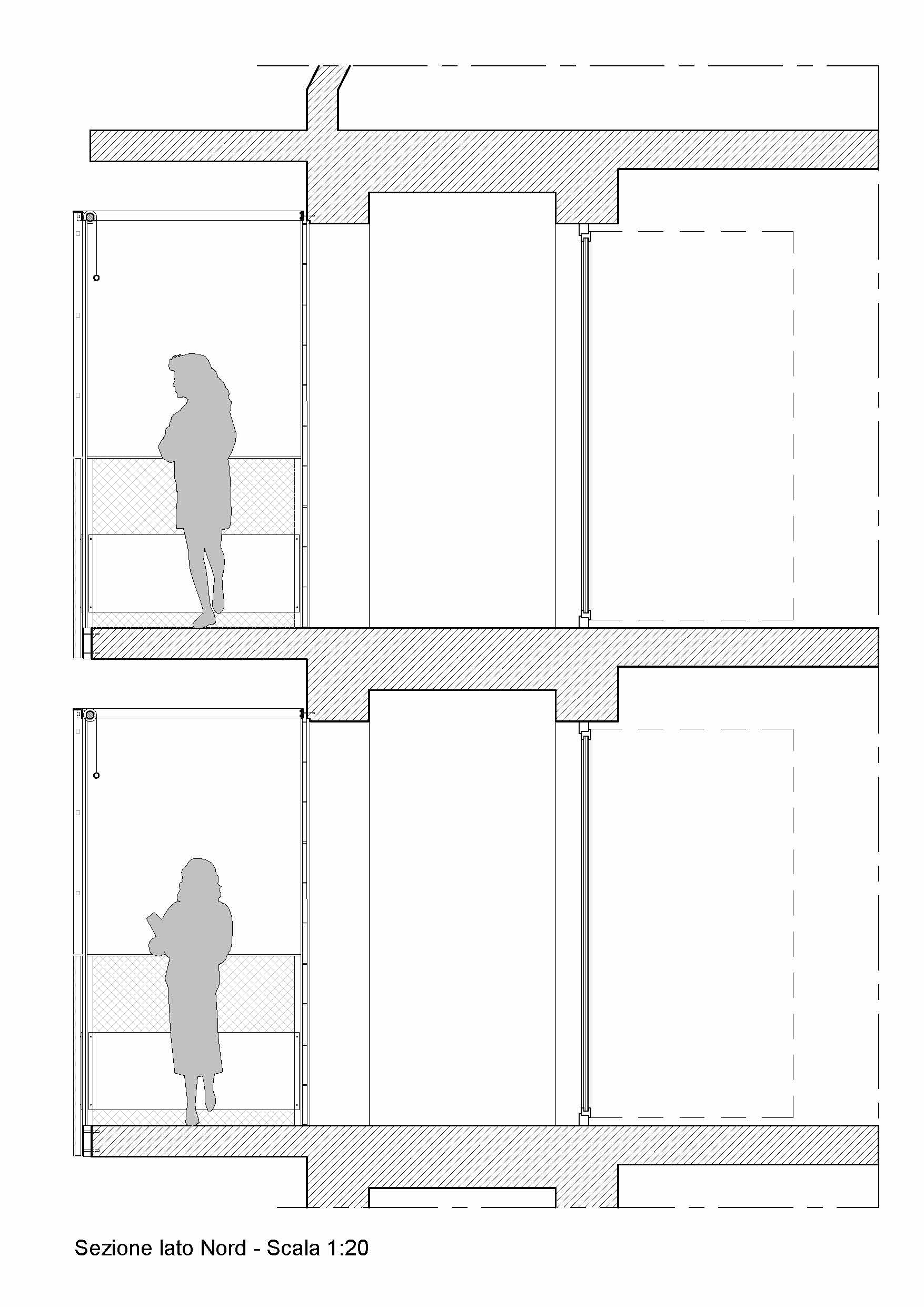 입면의 규칙성은 건물의 주된 특징을 드러낸다. 돌출된 흰색 금속판 요소가 역동적인 리듬을 전달하는데, 균일한 짙은 회색 벽돌 커튼은 일종의 중립적인 요소가 된다. 공공공간 확장을 위해 1층의 외벽을 기울이고, 이런 매스의 균형을 맞추기 위해 건축가는 파사드에 매달려 있는 일련의 가벼운 로지아를 구상하여 모든 사람에게 ‘민주적으로’ 여분의 공간을 부여했다. 로지아는 아파트의 자연스러운 확장으로, 바깥쪽으로 돌출되어 있다. 더 나아가서 로지아의 흰색과 타공된 표면 덕분에 실내까지 자연광을 받아들이고 아파트에 10~15㎡의 공간을 추가하여 보다 유형적 공간의 품질을 향상시킨다. 낮에는 자연 채광이 건물의 무게감을 줄여주고, 로지아와 발코니의 부피가 작아 보이게 하면서 재료와 추상성, 가벼움과 중력을 최대한 단순하게 결합시킨다. 건물의 1층은 견고함과 역동성을 동시에 전달한다.