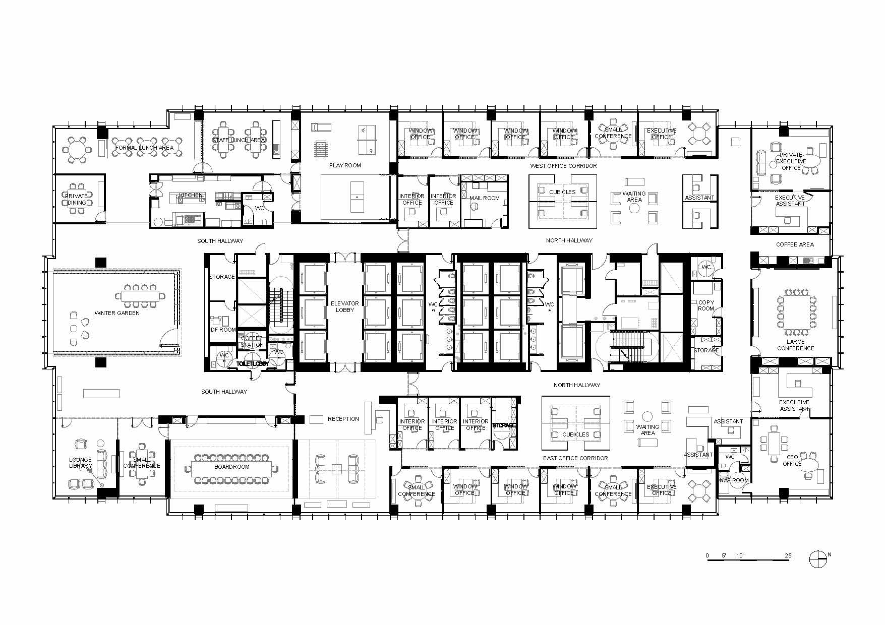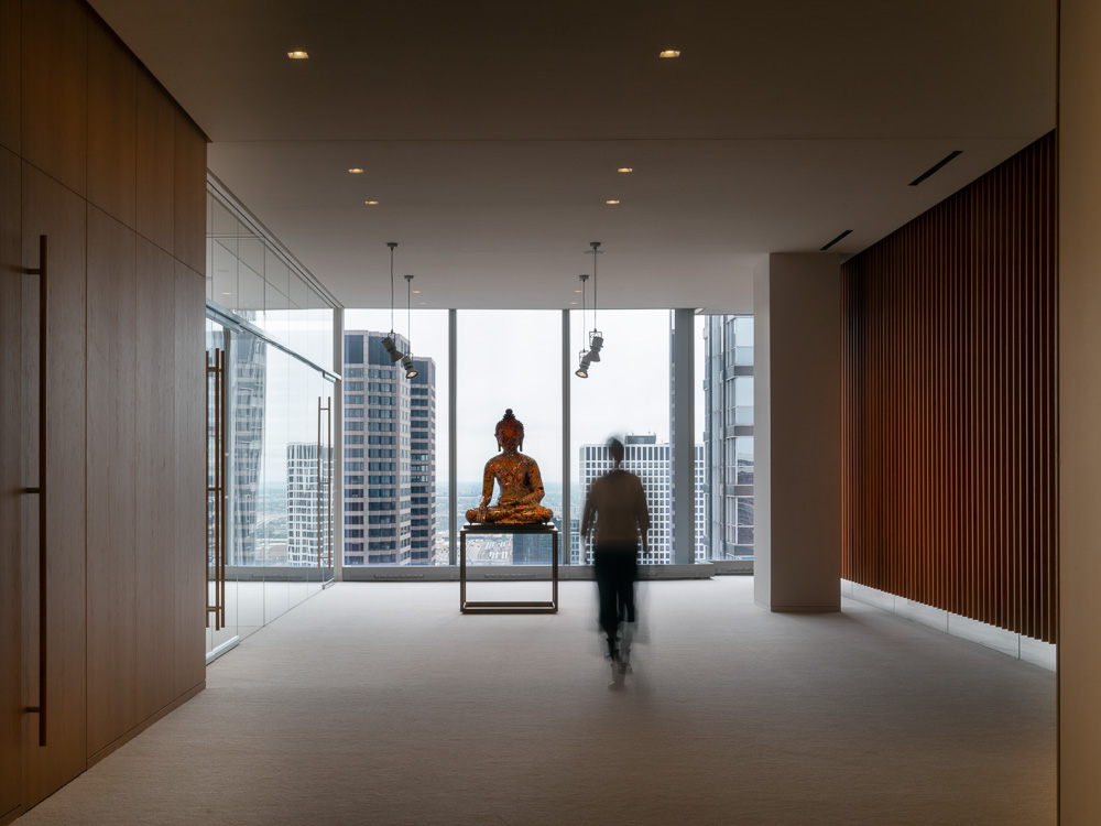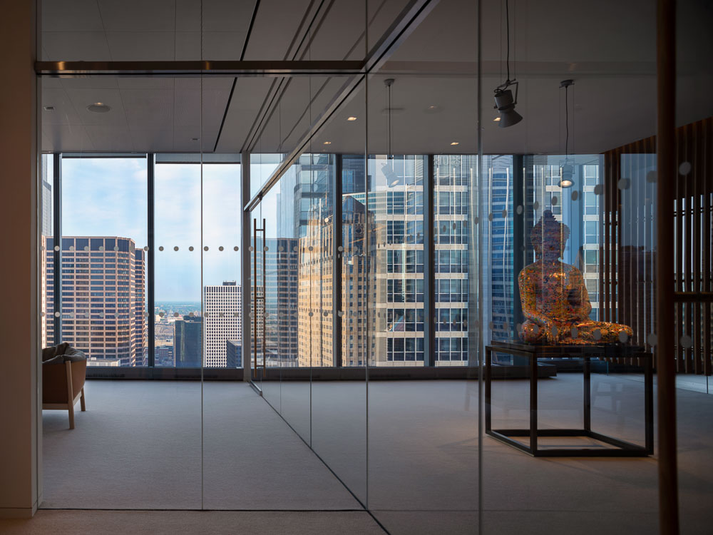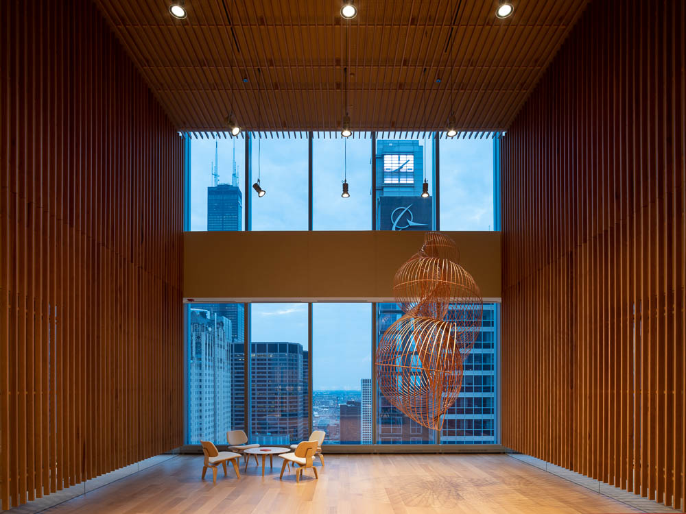 프라이베이트 오피스는 시카고 웨스트 루프에 있는 옛 공업지구에 새로 지은 초고층 빌딩 32층 전체층을 말한다. 의뢰인의 요청에 따라 사무실 공간을 조성하며, 그의 미술품 수집품 일부를 전시하기 위한 공간이다. 32층의 프라이베이트 오피스로 진입하는 부분은 해당 층의 가장 중심부에 있다. 하여 건축가는 두 개의 대조되는 실들을 입장하는 부분에 배치하여, 한 쪽에는 리셉션 영역 그리고 다른 쪽에는 플레이 공간을 만들었다. 시카고의 업무 공간에서 만나는 이 두 얼굴의 공간은 방문자들을 거대한 유리벽을 따라 이어진다. 사무실 남쪽으로는 회의실, 윈터 가든, 전시실, 식당가 등 집합적인 기능들이 곳곳에 배치되어 있으며, 북쪽은 개인 사무실과 일부 공용 업무 시설 등이 배치되어 있다. 바닥에서 천장까지 이어진 자연 목재 벽, 유리 파티션은 여러 업무 영역들을 구분하고, 투명한 유리벽은 방문자와 직원들이 개인적인 공간에서 시카고의 숨막히는 전경을 즐길 수 만든다. 목재 패널로 이어지는 곳에는 비현실적인 공간인 윈터 가든이 나타나며 공간의 전환을 일으킨다.