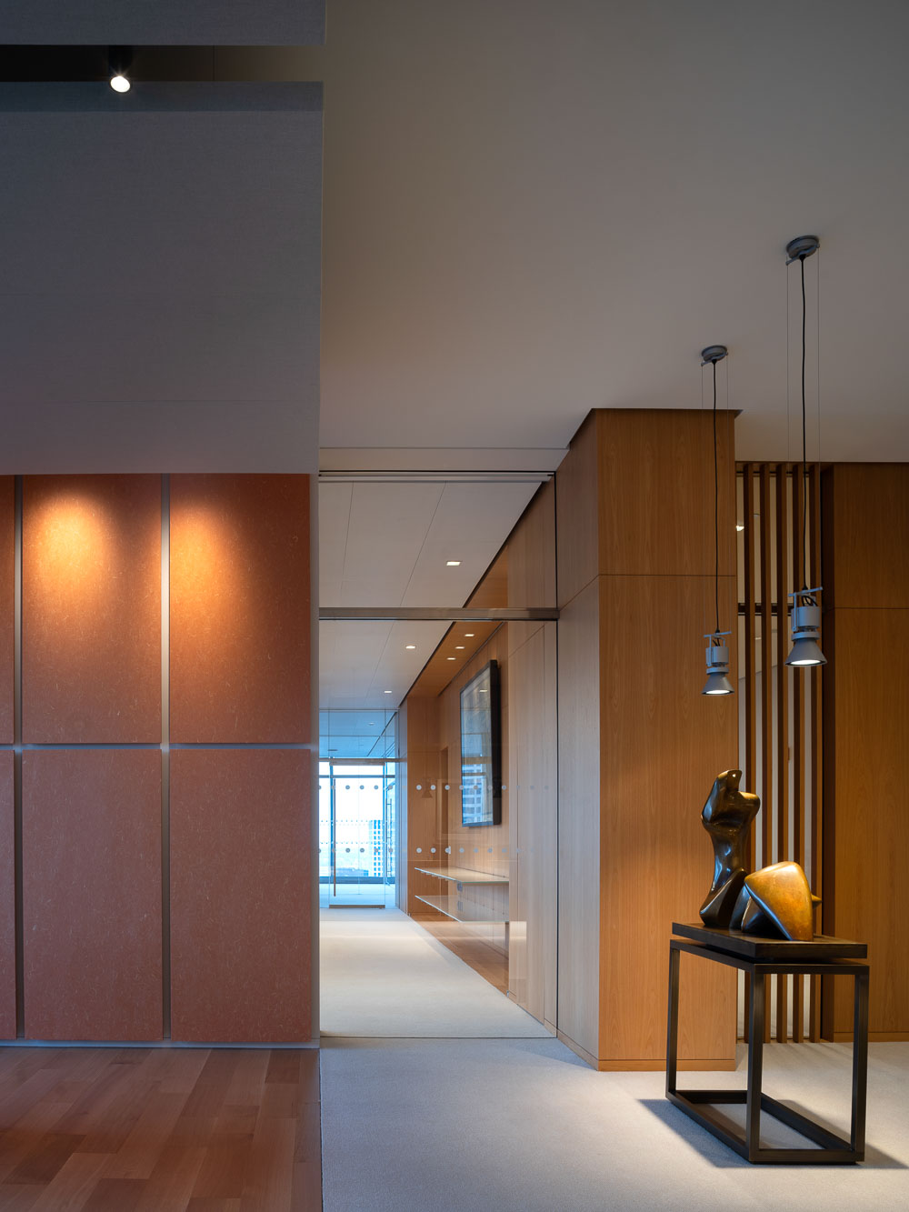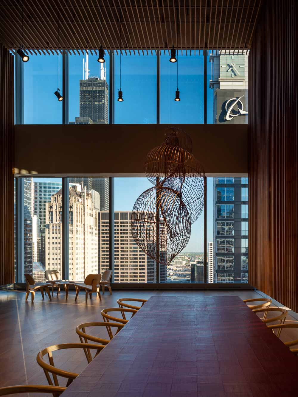 Suspended between the clouds, but firmly rooted in their surroundings, the executive offices designed by Rome-based architectural firm Alvisi Kirimoto occupy the entire 32nd floor of a newly built skyscraper in the lively ex-industrial district of West Loop, Chicago. The project, designed to accommodate the client's headquarters and showcase part of his art collection, fills an area of 2,600㎡, within a 224m high building located in the heart of the city, on the bank of the homonymous river.