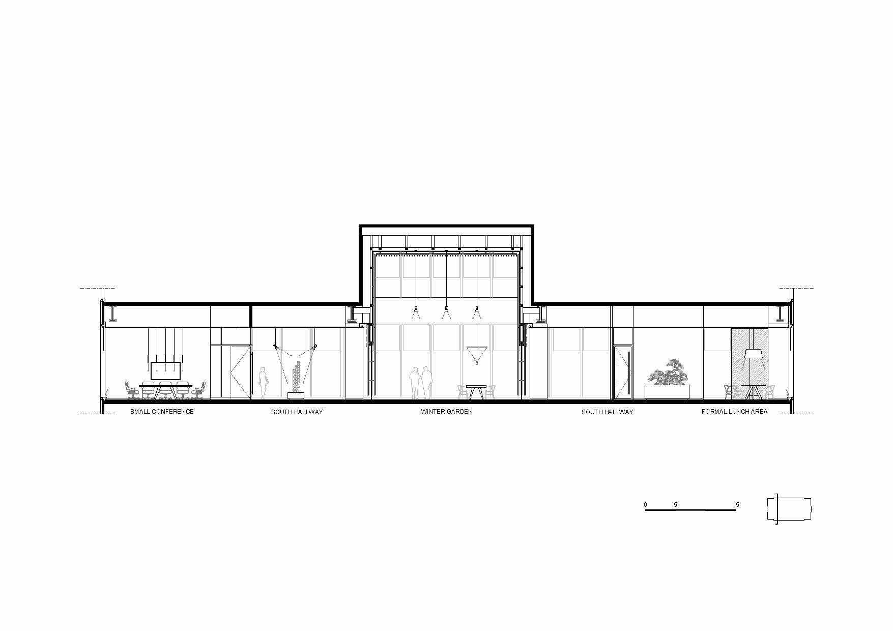 The main entrance to the building is located in its structural core, which encompasses all services and facilities. Two opposing rooms are immediately visible upon entry: on one side, the reception area and on the other, the playroom, both characterized by a large window that connects the visitor with the two faces of Chicago: the urban and the territorial. From a planimetric point of view, the South side hosts the most representative and aggregative functions such as the reception area, the meeting room, the Winter Garden, the exhibition routes and the restaurant area, while the North-facing side houses the private offices and some common areas.