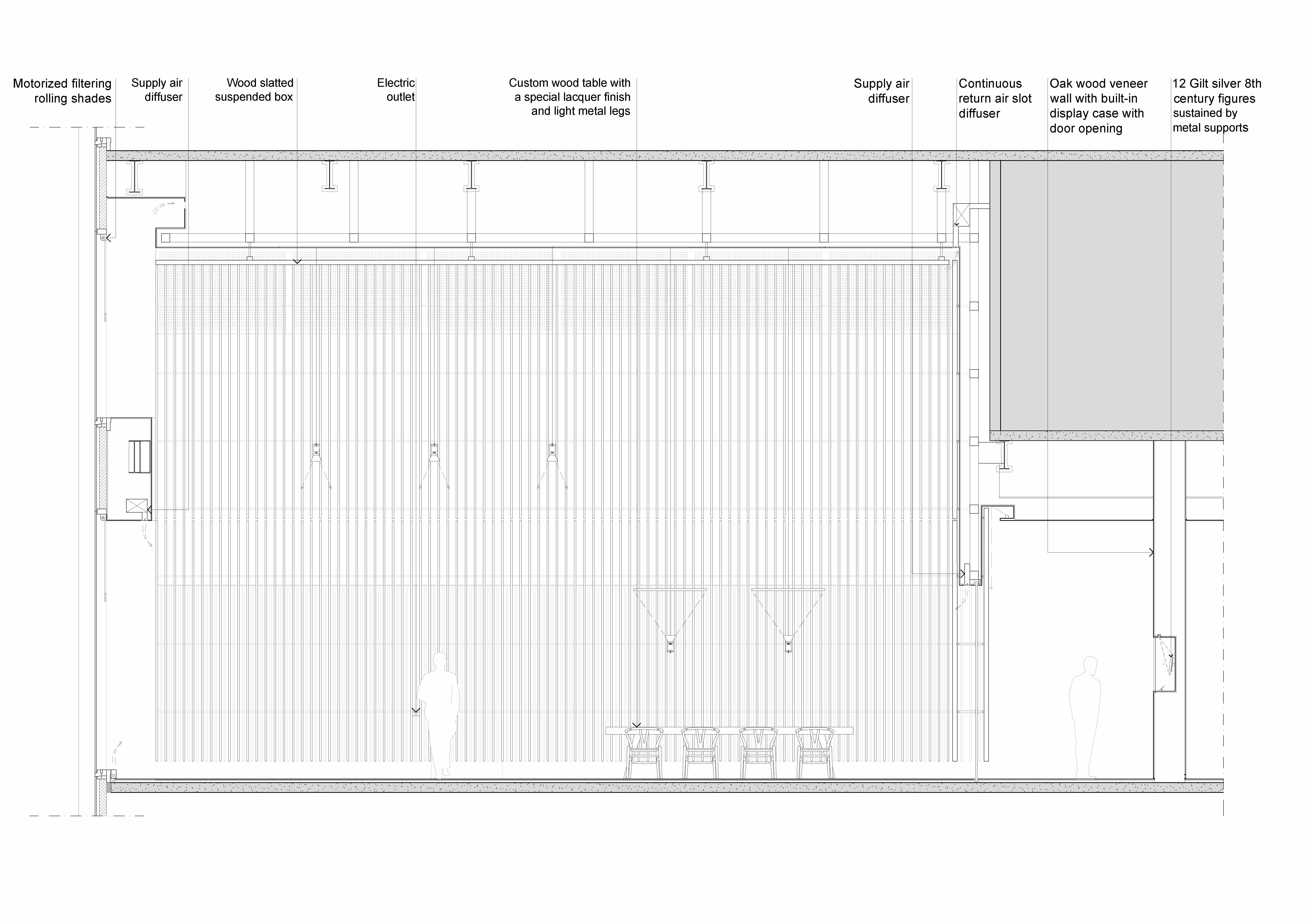 Depending on the point of view, the skin of the Winter Garden, composed of two rows of suspended wooden slats that do not align with each other, frame a central transparent glass partition, which, dissolves or becomes opaque, generating multiple perspectives and igniting an interesting game of lights and shadows. Similar to a light box, the environment allows the light to be directed through a system of double darkening and filtering curtains, and to diffuse the adjacent spaces with the wooden slats.