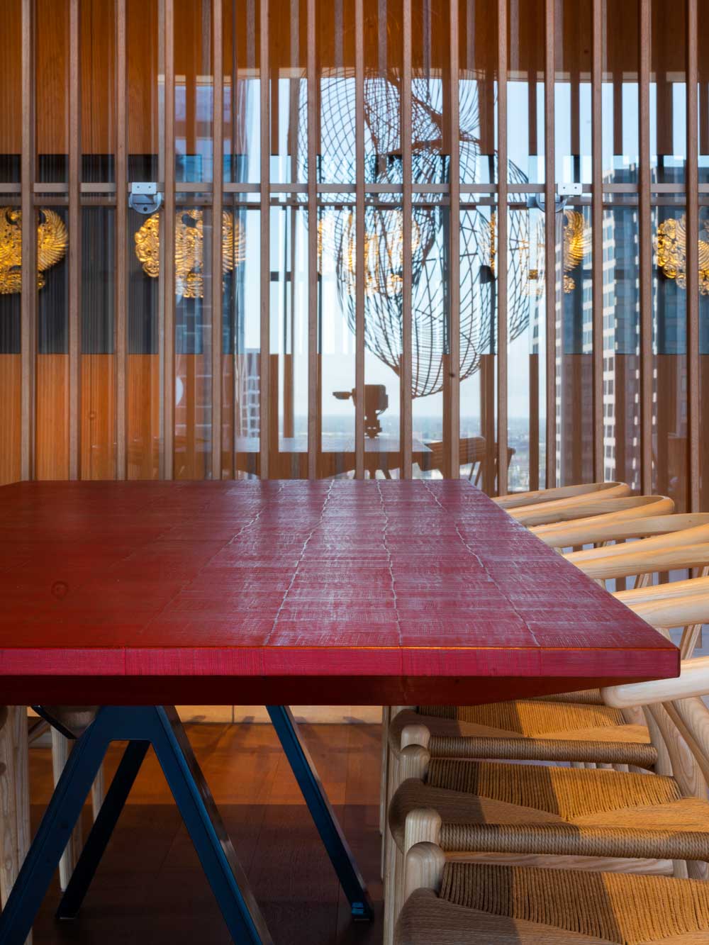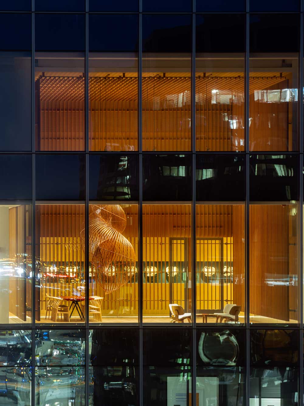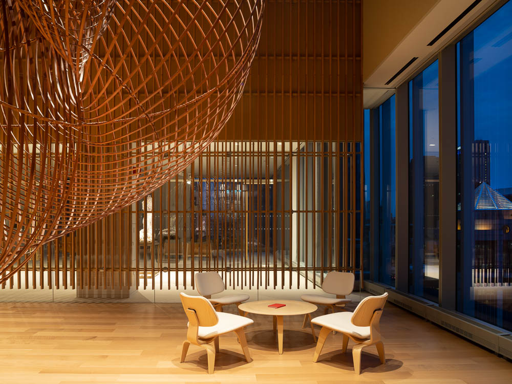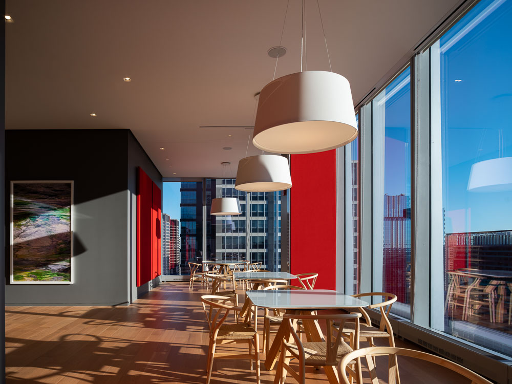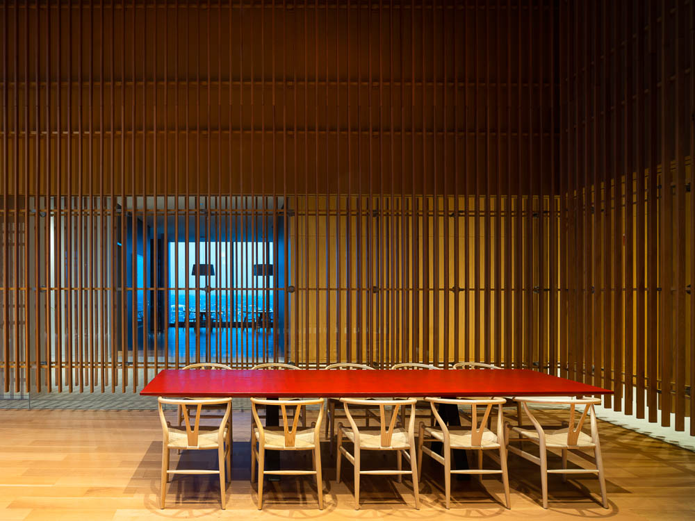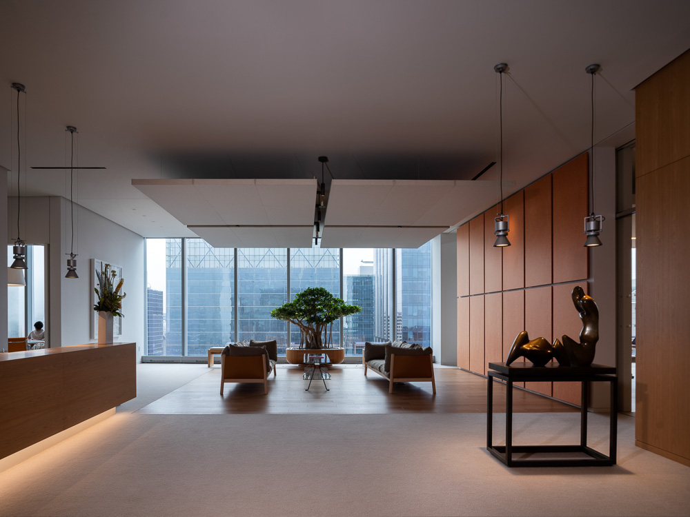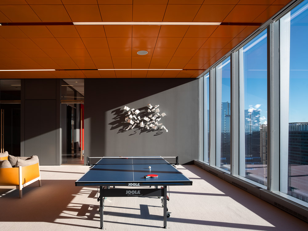 관점에 따라, 서로 정렬되지 않고 천장에 매달린 두 개 열의 목재 패널은 윈터 가든으로 빛과 그림자의 흥미로운 연출로 독특한 분위기를 만들어 낸다. 공간의 모든 부분은 세심하게 조절되어 조화를 이루고 있다. 작업책상, 식당의 식탁은 모두 맞춤 제작된 가구이며, 조명의 배치와 조도까지 미세하게 조절되어 있다. 이러한 빛과 가구로 정밀하게 조성된 내부의 색감은 때로는 고요함을, 때로는 그 자체의 기능을 정의한다. 플레이룸의 천장과 사무실 천장에 매달린 패널은 밝은 오렌지색이며, 식당가의 회색 벽은 강렬한 붉은색 벽과 대비된다. 입구 부분의 일본 풍의 벽지와 탁 트인 업무 공간의 백색까지 다양한 색감이 전체적으로 조화를 이루고 있다. 마지막으로, 공간 곳곳에 자리잡은 예술품은 공간의 결정적인 분위기 연출을 책임지고 있다. 사무 공간에서 자연스럽게 이어지는 동선을 따라 전시 공간에 들어서면 도시의 전경과 중첩되면서 예상하지 못한 곳이 나타나게 된다.
