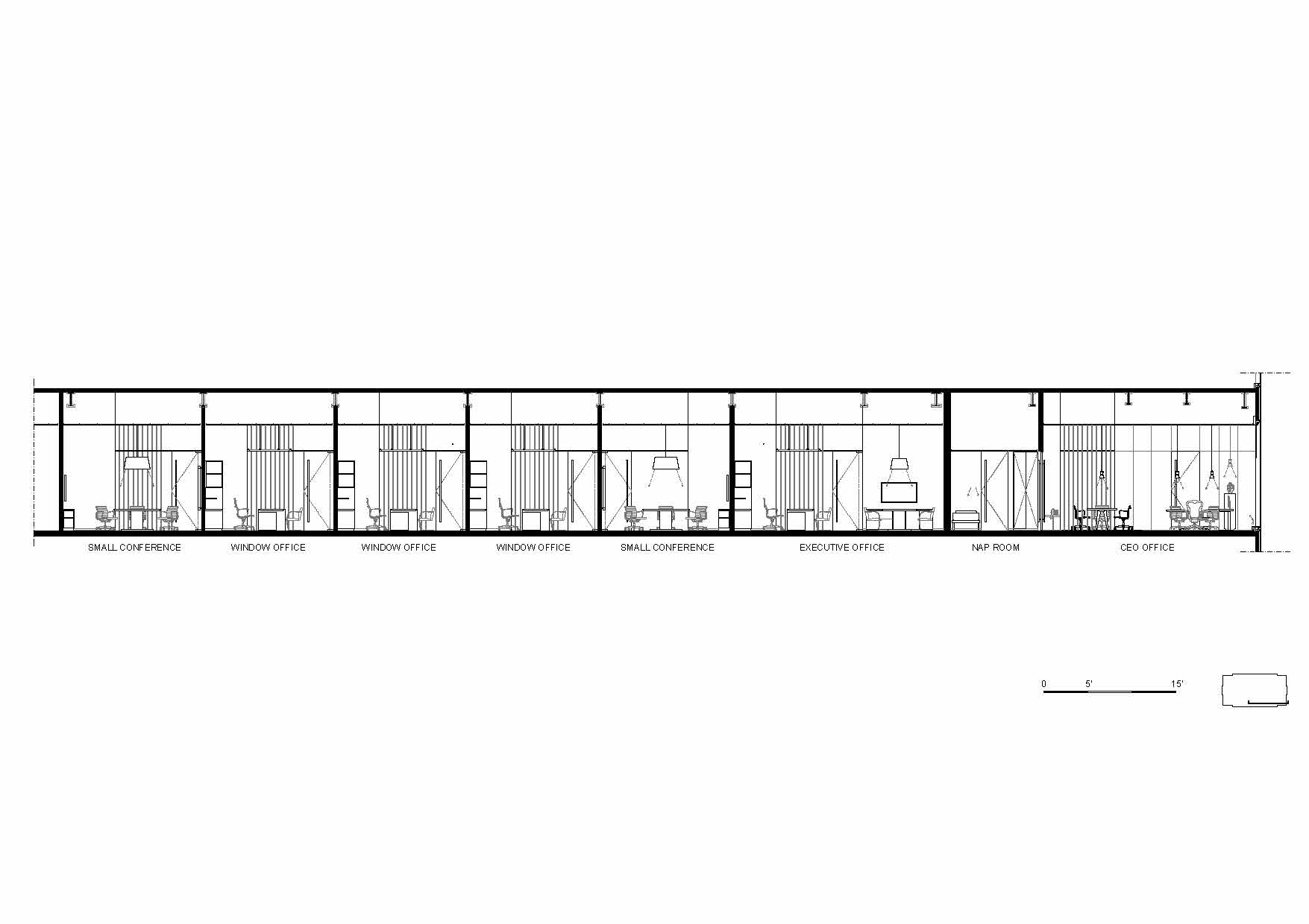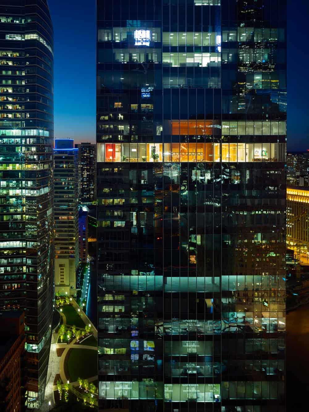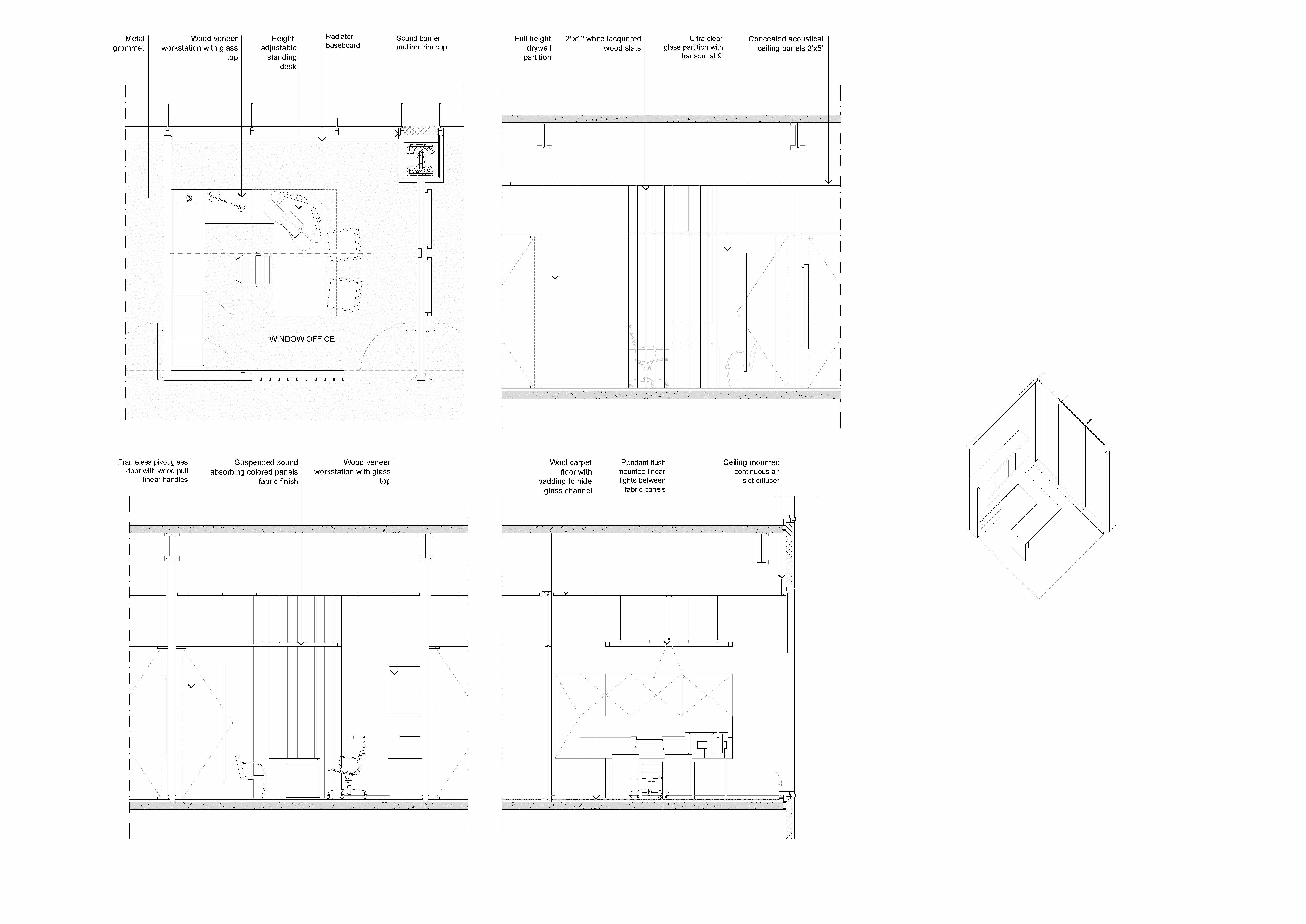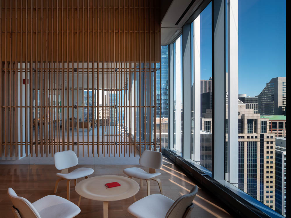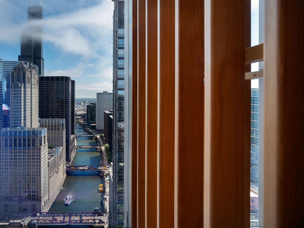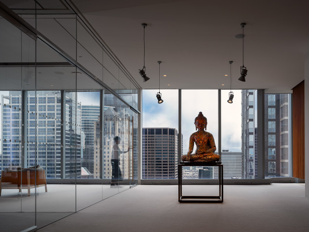 프라이베이트 오피스는 시카고 웨스트 루프에 있는 옛 공업지구에 새로 지은 초고층 빌딩 32층 전체층을 말한다. 의뢰인의 요청에 따라 사무실 공간을 조성하며, 그의 미술품 수집품 일부를 전시하기 위한 공간이다. 32층의 프라이베이트 오피스로 진입하는 부분은 해당 층의 가장 중심부에 있다. 하여 건축가는 두 개의 대조되는 실들을 입장하는 부분에 배치하여, 한 쪽에는 리셉션 영역 그리고 다른 쪽에는 플레이 공간을 만들었다. 시카고의 업무 공간에서 만나는 이 두 얼굴의 공간은 방문자들을 거대한 유리벽을 따라 이어진다. 사무실 남쪽으로는 회의실, 윈터 가든, 전시실, 식당가 등 집합적인 기능들이 곳곳에 배치되어 있으며, 북쪽은 개인 사무실과 일부 공용 업무 시설 등이 배치되어 있다. 바닥에서 천장까지 이어진 자연 목재 벽, 유리 파티션은 여러 업무 영역들을 구분하고, 투명한 유리벽은 방문자와 직원들이 개인적인 공간에서 시카고의 숨막히는 전경을 즐길 수 만든다. 목재 패널로 이어지는 곳에는 비현실적인 공간인 윈터 가든이 나타나며 공간의 전환을 일으킨다.