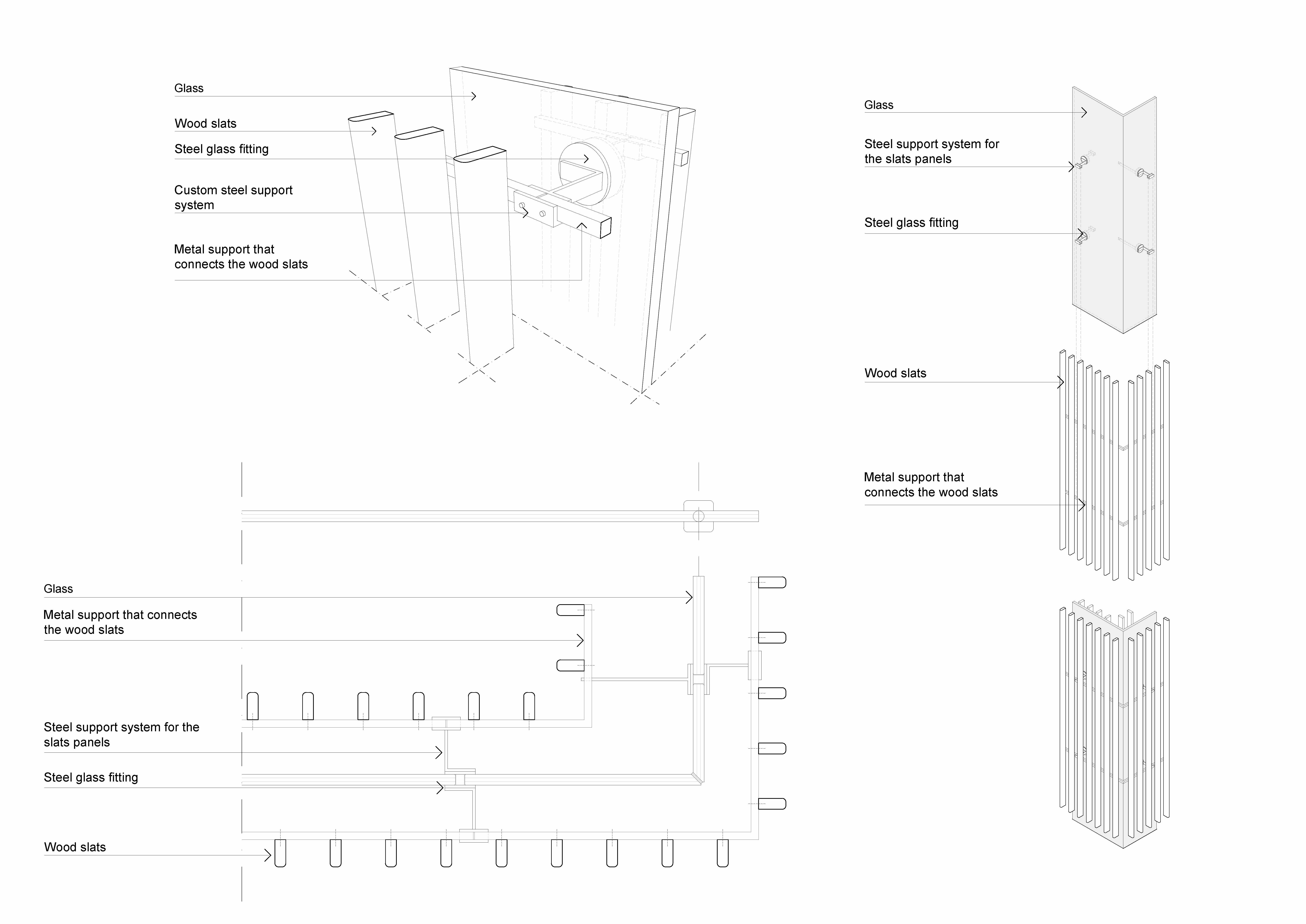 Depending on the point of view, the skin of the Winter Garden, composed of two rows of suspended wooden slats that do not align with each other, frame a central transparent glass partition, which, dissolves or becomes opaque, generating multiple perspectives and igniting an interesting game of lights and shadows. Similar to a light box, the environment allows the light to be directed through a system of double darkening and filtering curtains, and to diffuse the adjacent spaces with the wooden slats.