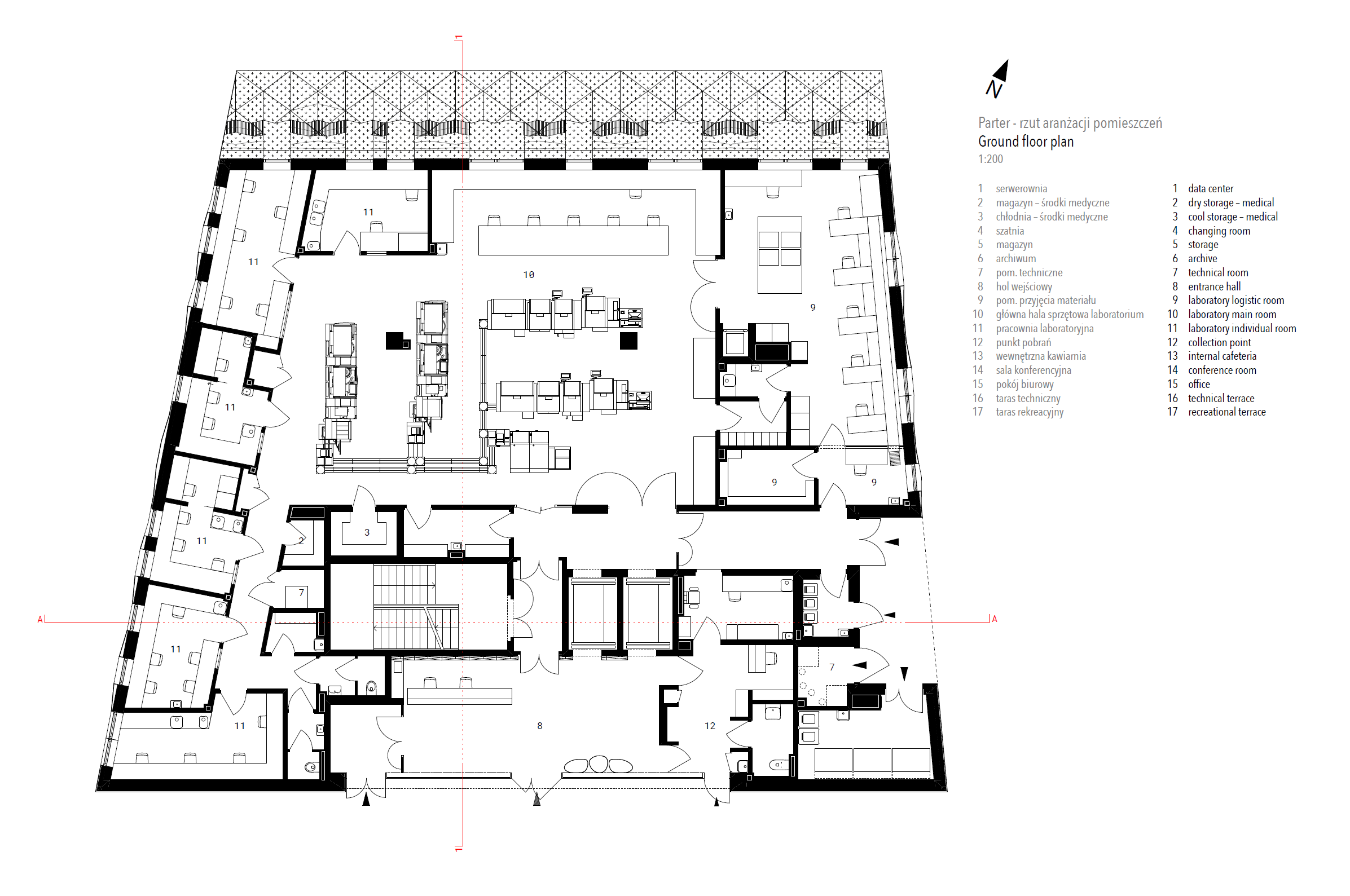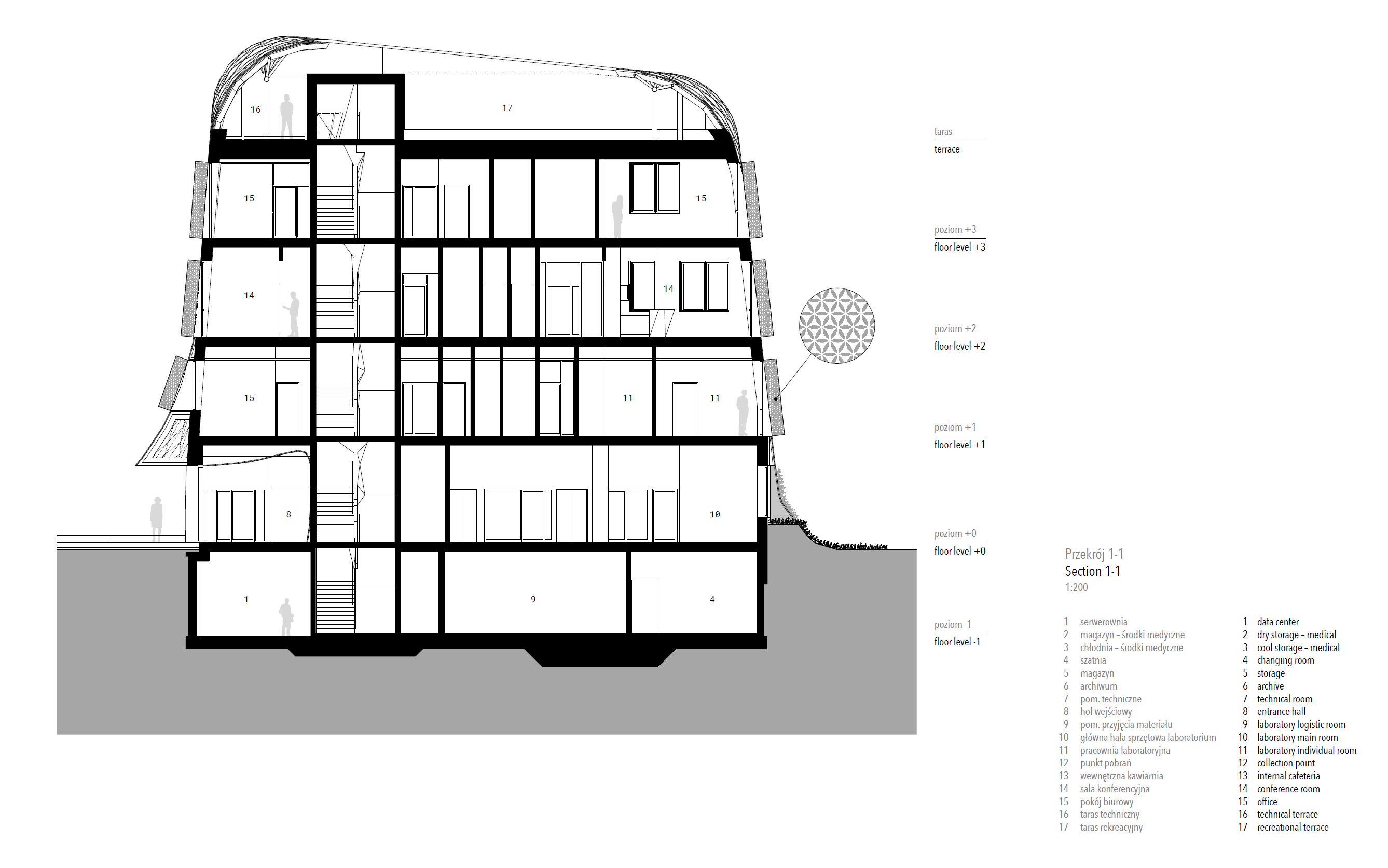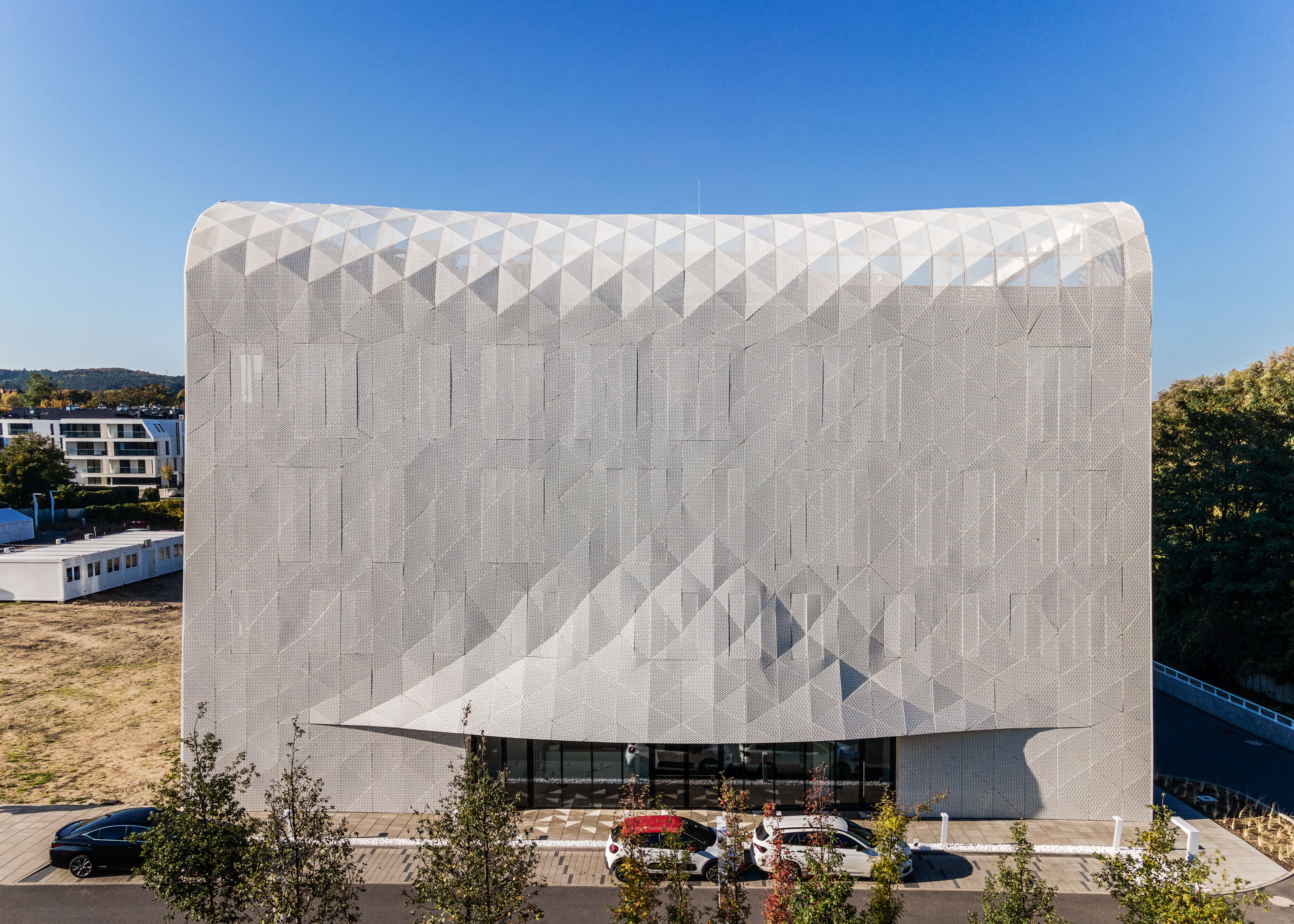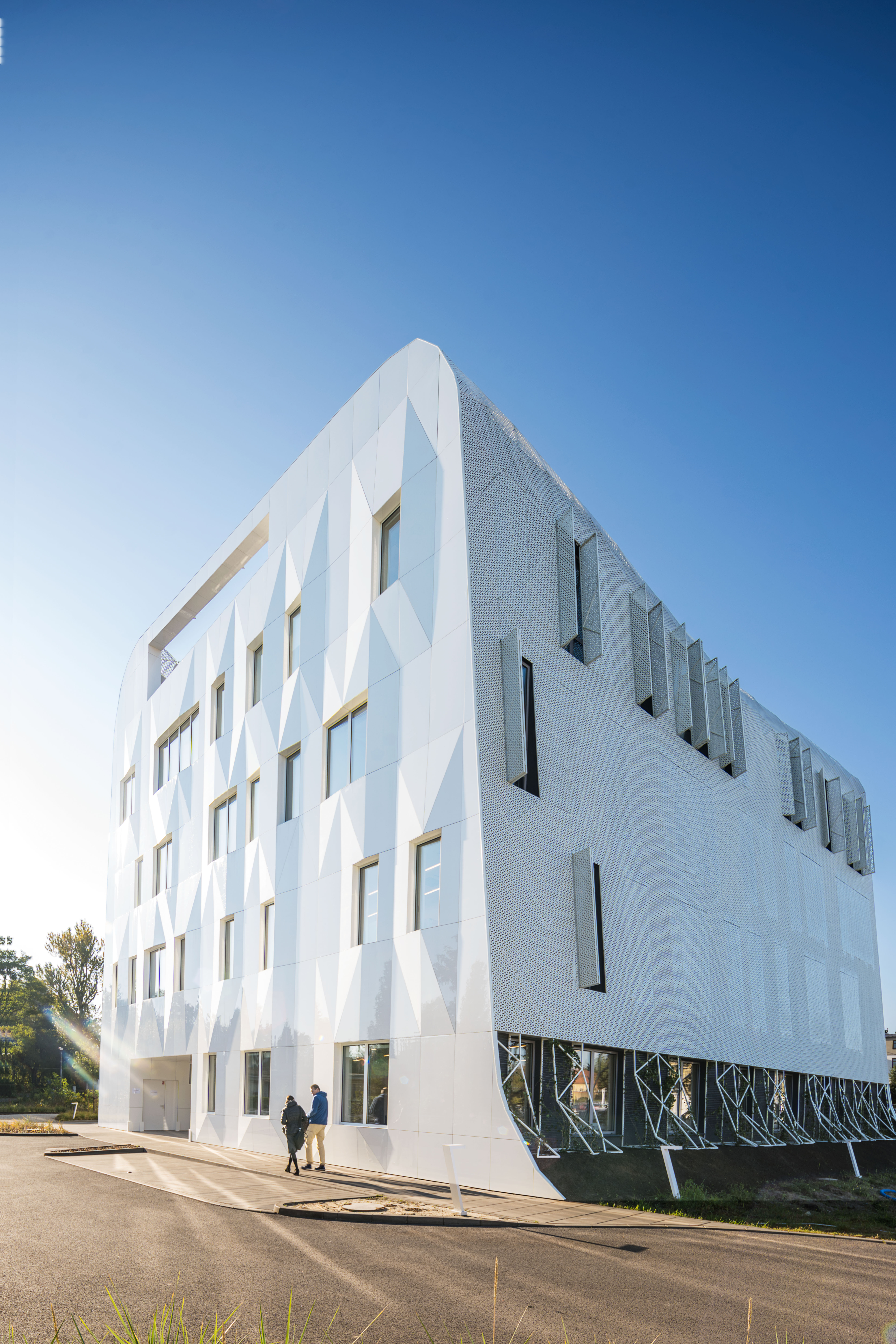 Wave One, of the European Center for Families, is located 400m from the Baltic Sea in what is historically known as a health resort town. The concept derives from the complexity of sea waves and the local vernacular of carved ornamental detailing on facade elements. Wave One, the first to be built after a lengthy design and construction process, encompasses specialized medical laboratories including SARS-CoV-2 testing labs, a research & development center and administration spaces. The white perforated facade, enfolding Wave One, was partly inspired by a series of photographs by Pierre Carreau, titled AquaViva. The architects analyzed the geometric complexity of the sea waves, captured by the photographer. The arched 3D forms, frozen in time, were translated into an architectural language that shaped the building’s final form. With 1,362 perforated triangular panels, the facade, just like a wave, bends at its crest, the top of the building. The panels perforations are a symbolic gesture in reference to the local tradition of placing ornamental details carved in wood on buildings’ facade. It made it possible to bring about an airiness and dissipation of the building in space, particularly visible in the upper realm of the facade. The East/west elevations take on 3D form with triangular panels of sintered white ceramics, skewing and refiecting sunlight onto the pavement. They create a transient detail, enlivening the immediate surroundings of the building. Equally, curvature - a reference to the concavity of a sea wave - inspired the shape of the building mass. In a facility with such a high saturation of technological equipment, many of which have to work 24 hours a day, it is very important to protect the rooms from overheating. In order to avoid such threats and at the same time to prevent enlarging the cooling systems, a number of passive solutions were used. For instance, the architects resigned from large glass surfaces. Instead, the surface area of the designed windows, provides the optimal natural lighting conditions for the laboratory rooms. The largest room, in which the technological line, generating the greatest amounts of heat was placed, is located on the North side. Further, the building facade is built of two layers. The outer layer of the facade acts as a continuous protective barrier over the building, shielding the exterior wall from heating up and the interior rooms from overheating. This barrier also has a positive effect on the surroundings. It prevents the urban heat island phenomenon.