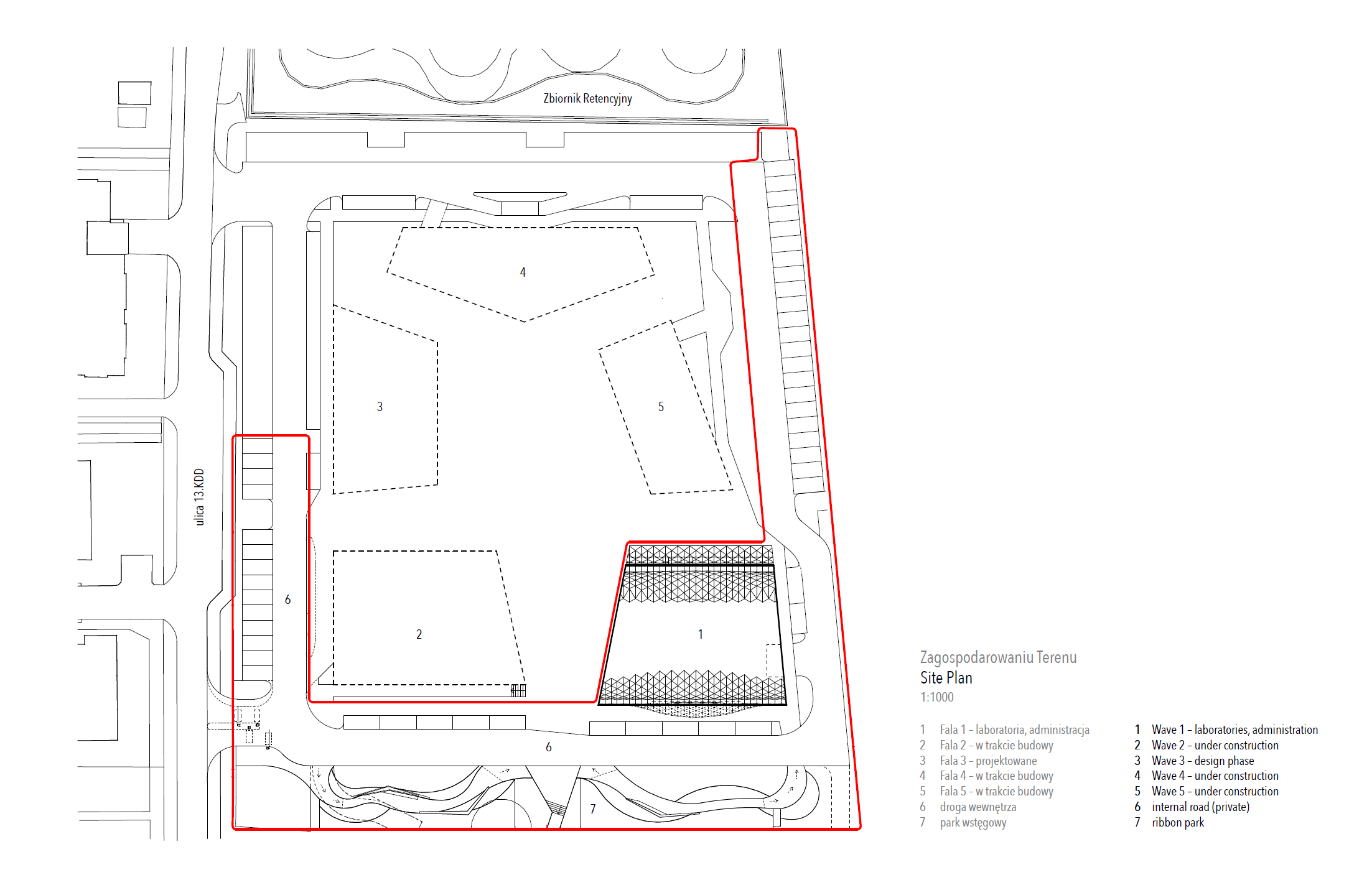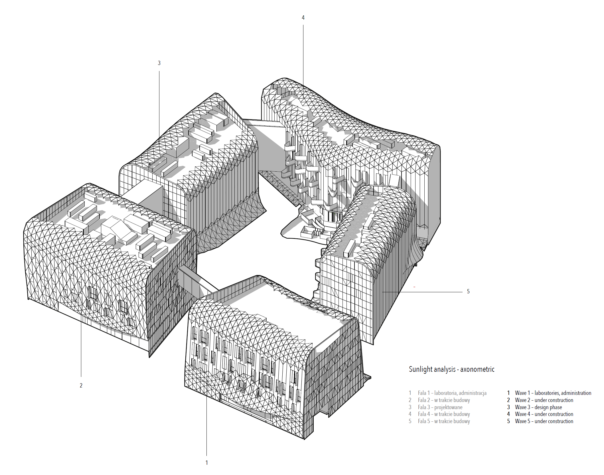 역사적인 휴양지로 유명한 발트해에서 400m 떨어진 곳, 폴란드 소포트. 이곳에 새롭게 들어선 소프트 유전학연구소 웨이브원은 코로나바이러스감염증-19(SARS-CoV-2) 검사실을 포함한 전문 의료 연구실, 연구 개발 센터 및 관리 공간이다. 건물을 보자마자 가장 눈에 띄는 것은 흰 색의 천공 입면과 독특한 선을 가진 건축물의 형태다. 사진작가 피에르 카로(Pierre Carreau)의 작품인 덮쳐오는 파도를 포착한 아쿠아비바(AquaViva)라는 사진에서 영감을 얻어 디자인된 이 독특한 건축물은 파도가 가지고 있는 기하학적 구조를 공간으로 구현한 것이다. 밀려오는 파도의 시간을 마치 멈춘 것처럼 건물은 입체적인 아치형입구를 가지고 있다. 입면은 파도처럼 건물의 꼭대기인 마루에서부터 흐르듯이 휘어진다. 이 입면을 만드는 삼각형의 패널은 1,362개의 구멍이 뚫려 있는데, 이는 건물의 정면에 나무로 조각된 장식적인 디테일을 배치하는 지역 전통이 현대적으로 구현된 것이다. 건물 정면부에서부터 흐르듯이 내려오는 건물은 도시 경관에 경쾌함을 가져다 준다. 동쪽과 서쪽의 입면은 흰색 세라믹의 삼각형 패널로 정면과는 다른 입체적 형태를 취하면서 햇빛을 반사해낸다. 이것은 24시간 가동해야 하는 기술 장비가 많은 시설에서 실이 과열되지 않도록 보호하는 것이 매우 중요하기 때문이다. 입면은 이러한 과열을 방지하고, 동시에 대공간을 확보하면서 냉각 시스템을 다룰 수 있도록 설계되어 있다. 또한, 건축물을 겉에서 보면 큰 유리창이 없는데. 대신, 창의 표면적이 실험실에 최적의 자연 채광을 이용할 수 있도록 공간이 배치, 구성되어 됐다. 가장 많은 양의 열을 발생시키는 기술 라인이 배치된 가장 큰 실은 북쪽에 위치해 있으며, 건물 정면은 두 개의 층이 뚫린 형태로 큰 공기 흐름을 만들어내는 공간으로 벽과 내부 공간이 과열되는 것을 방지한다. 뿐만 아니라 이 천공 입면은 도시열섬현상을 방지하는 효과도 있다.