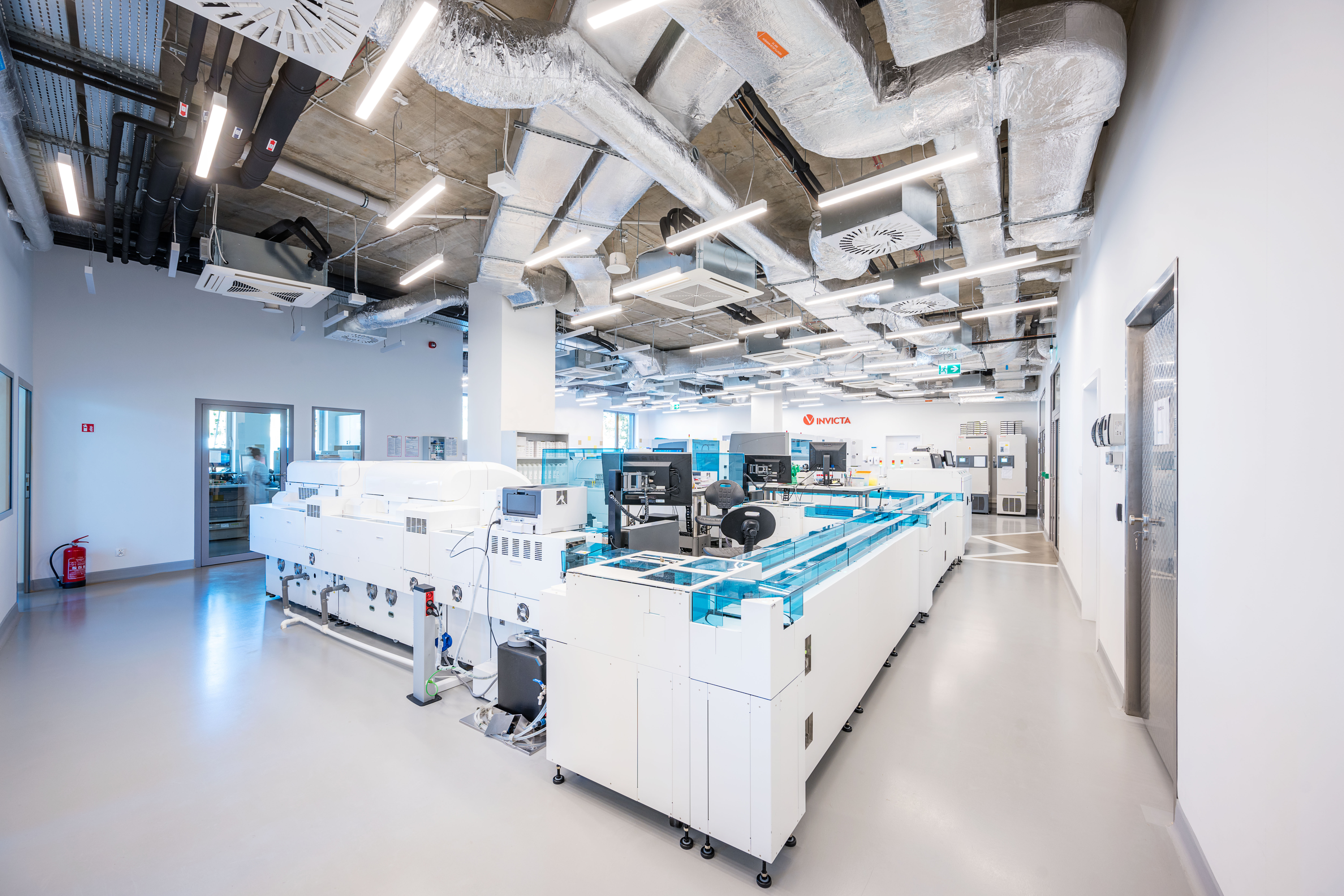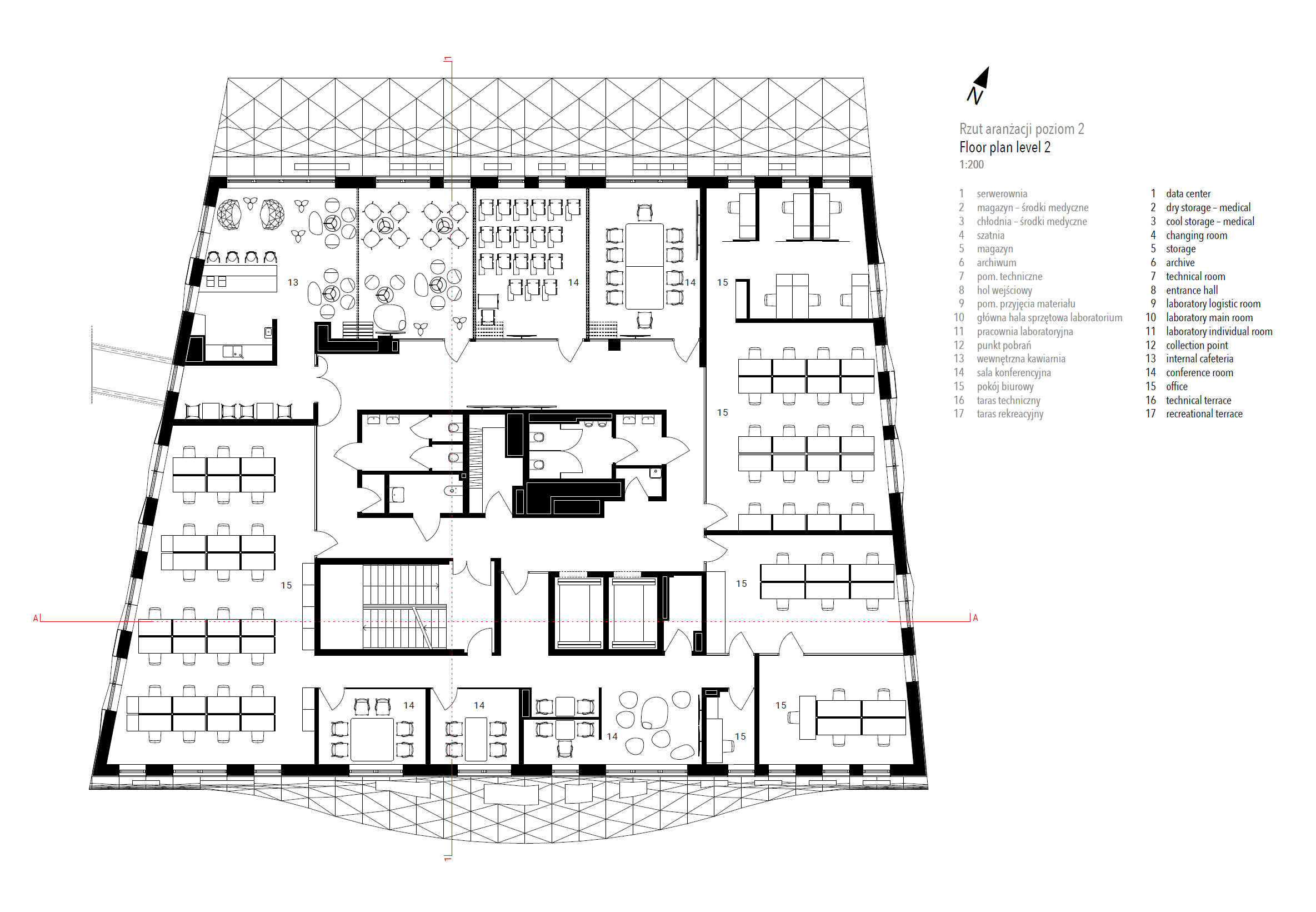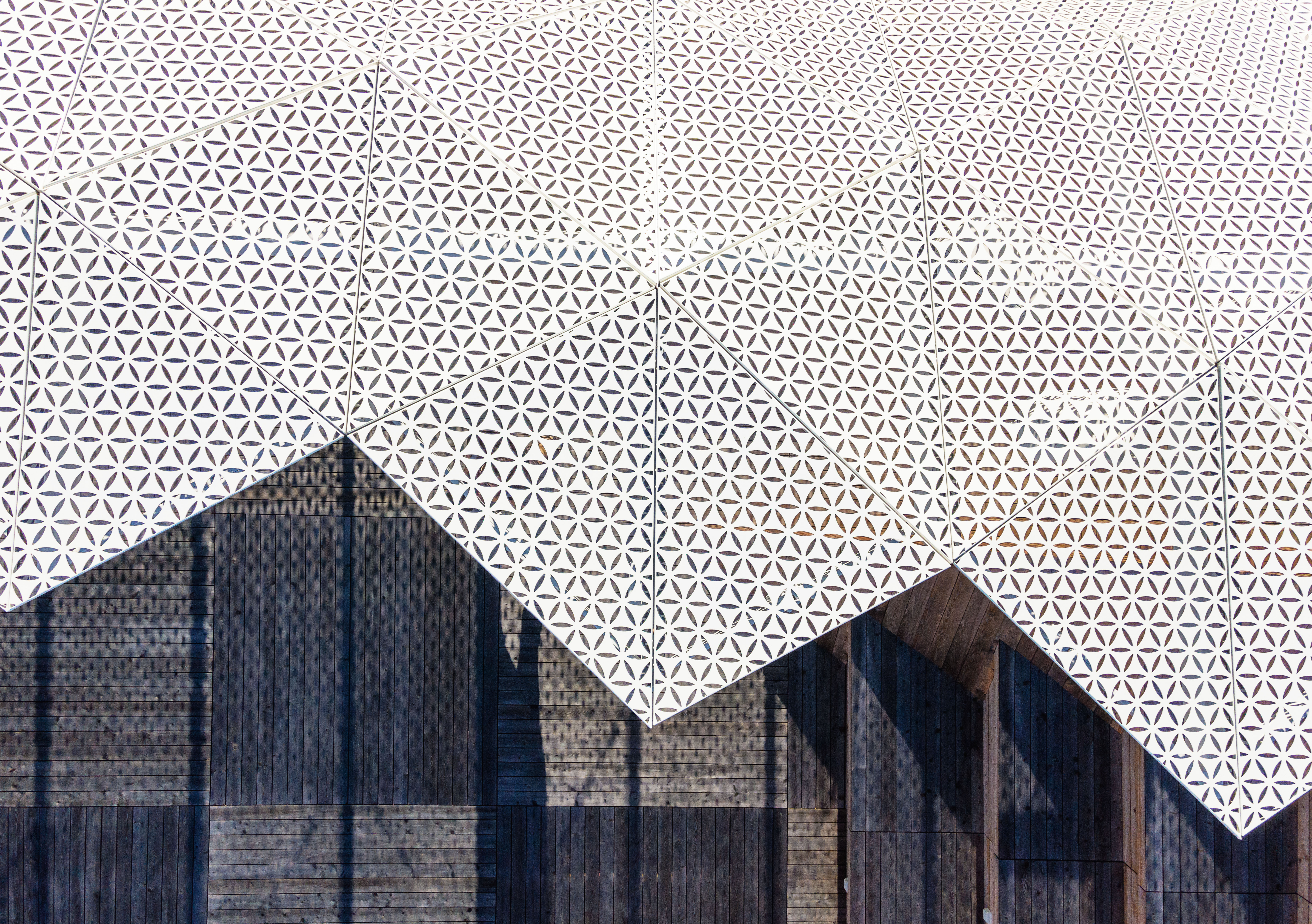 Wave One, of the European Center for Families, is located 400m from the Baltic Sea in what is historically known as a health resort town. The concept derives from the complexity of sea waves and the local vernacular of carved ornamental detailing on facade elements. Wave One, the first to be built after a lengthy design and construction process, encompasses specialized medical laboratories including SARS-CoV-2 testing labs, a research & development center and administration spaces. The white perforated facade, enfolding Wave One, was partly inspired by a series of photographs by Pierre Carreau, titled AquaViva. The architects analyzed the geometric complexity of the sea waves, captured by the photographer. The arched 3D forms, frozen in time, were translated into an architectural language that shaped the building’s final form. With 1,362 perforated triangular panels, the facade, just like a wave, bends at its crest, the top of the building. The panels perforations are a symbolic gesture in reference to the local tradition of placing ornamental details carved in wood on buildings’ facade. It made it possible to bring about an airiness and dissipation of the building in space, particularly visible in the upper realm of the facade. The East/west elevations take on 3D form with triangular panels of sintered white ceramics, skewing and refiecting sunlight onto the pavement. They create a transient detail, enlivening the immediate surroundings of the building. Equally, curvature - a reference to the concavity of a sea wave - inspired the shape of the building mass. In a facility with such a high saturation of technological equipment, many of which have to work 24 hours a day, it is very important to protect the rooms from overheating. In order to avoid such threats and at the same time to prevent enlarging the cooling systems, a number of passive solutions were used. For instance, the architects resigned from large glass surfaces. Instead, the surface area of the designed windows, provides the optimal natural lighting conditions for the laboratory rooms. The largest room, in which the technological line, generating the greatest amounts of heat was placed, is located on the North side. Further, the building facade is built of two layers. The outer layer of the facade acts as a continuous protective barrier over the building, shielding the exterior wall from heating up and the interior rooms from overheating. This barrier also has a positive effect on the surroundings. It prevents the urban heat island phenomenon.