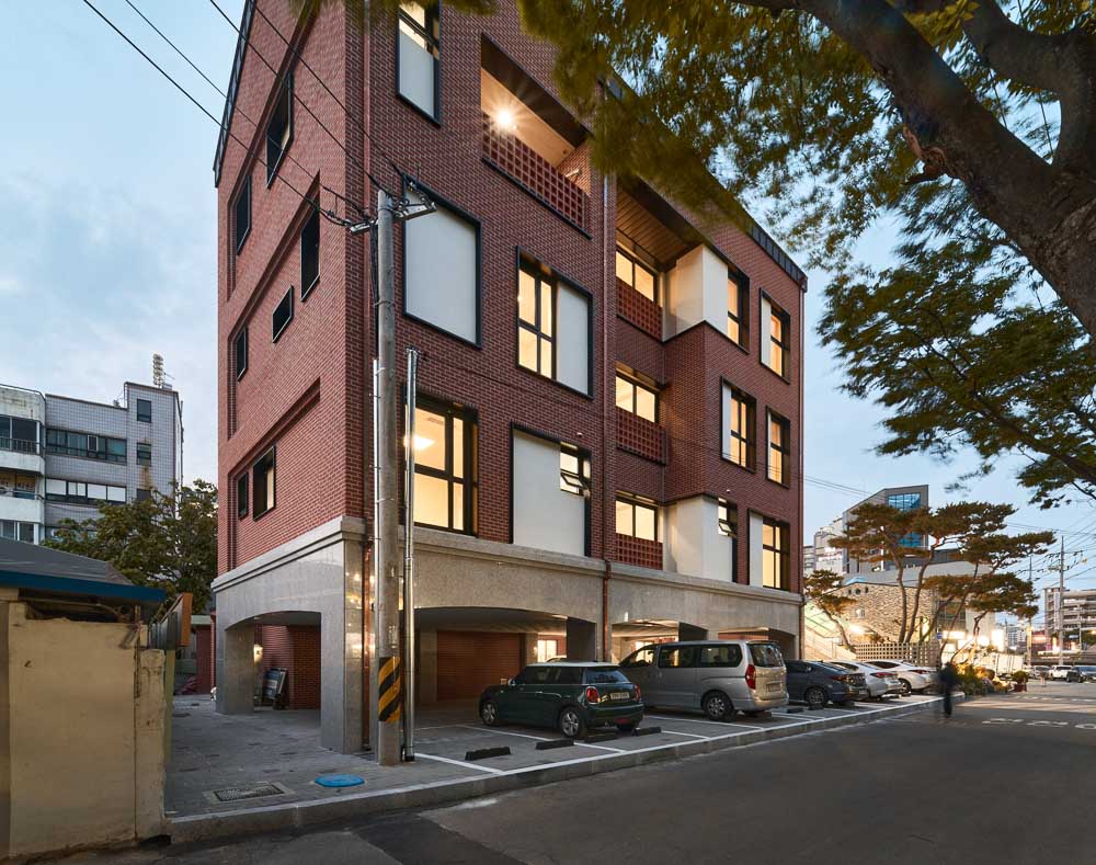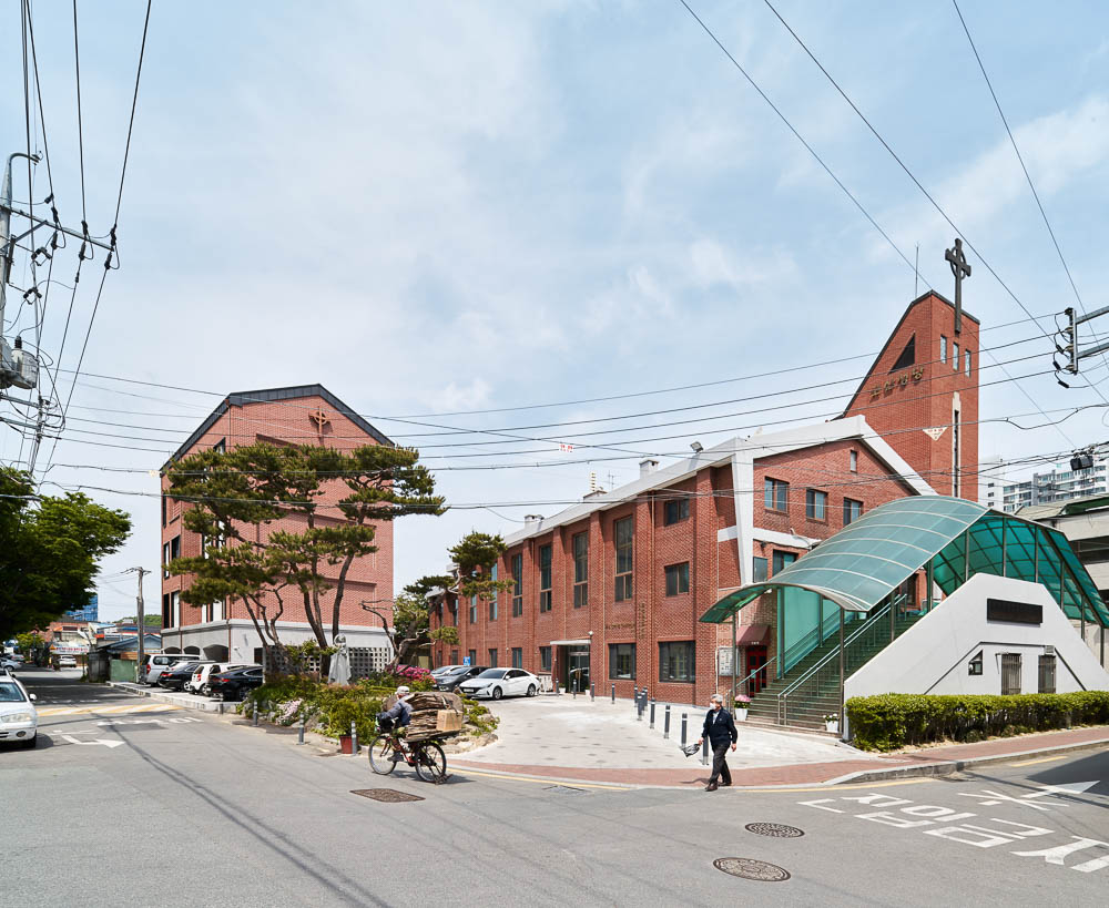 Gosan Cathedral is the oldest church in Suseong-gu, and belongs to the second deputy district of the Daegu Archdiocese. The priest’s office and nunnery were built about 35 years ago and have been in use since then. Over time, in the same way as we humans grow old, the buildings have deteriorated, and the function of the buildings have been lost. The one-way road from Dalgubeol-daero and the small crossroad connecting Siji 1st Bridge were relocated, which caused some congestion. There was a large amount of parking on the surrounding roads, which aggravated the congestion. There were no parking spaces at the cathedral, so an alternative was needed because this added to the surrounding congestion. In the plan to extend the priest’s office and nunnery, we worked on solving the parking problem to some extent, which has always been a concern, and to improve the lost function so that the clergy can engage in pastoral activities and the retreatants can concentrate on their prayers and work in the cathedral. Fortunately, there were beautiful things other than congestion around Gosan Cathedral. It was not easy to put something new in this familiar and comfortable place where the Maehocheon Stream flows to the south and there are beautiful green trees around Seongmodongsan(hill) and the old church. By revealing the pillars and beams on the exterior wall, affinity with the existing building was naturally enhanced. The use of stone and arch to suggest stability and religious traditions, and to emphasize the purity and innocence of the clergy and retreatants by using pure white cotton, expresses a new change from familiarity. The priest’s office and nunnery in the Gosan Cathedral has reflected the sentiments of users in the plan as much as possible. The parking problem was solved to some extent by configuring a piloti-type parking lot, and the building design included use of the narrow yard. For the exterior, clay bricks and a sloping roof were employed to bring the building into harmony with the existing cathedral, and blocks and white surfaces were used to incorporate a modern sensibility. In addition, the interior was zoned for each floor to ensure maximum independence within the collective building, and the bedrooms were arranged to face Maehocheon Stream to the south.