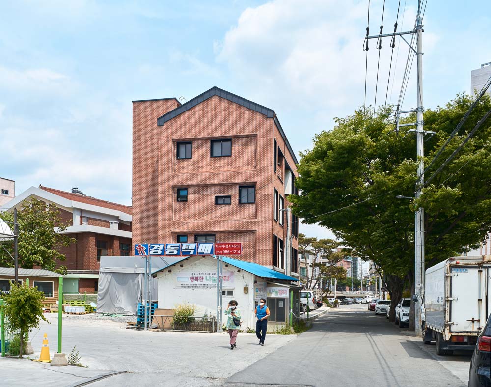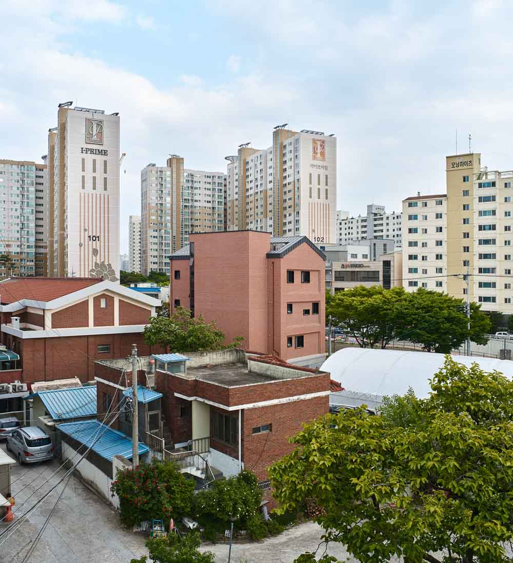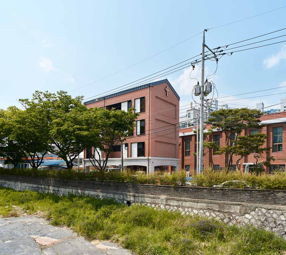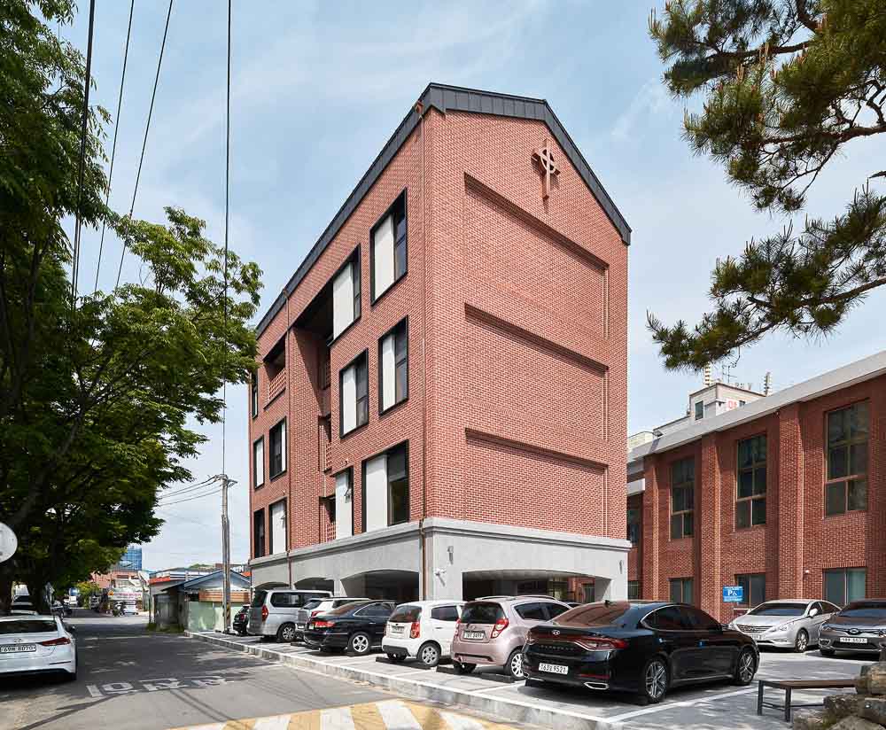 Gosan Cathedral is the oldest church in Suseong-gu, and belongs to the second deputy district of the Daegu Archdiocese. The priest’s office and nunnery were built about 35 years ago and have been in use since then. Over time, in the same way as we humans grow old, the buildings have deteriorated, and the function of the buildings have been lost. The one-way road from Dalgubeol-daero and the small crossroad connecting Siji 1st Bridge were relocated, which caused some congestion. There was a large amount of parking on the surrounding roads, which aggravated the congestion. There were no parking spaces at the cathedral, so an alternative was needed because this added to the surrounding congestion. In the plan to extend the priest’s office and nunnery, we worked on solving the parking problem to some extent, which has always been a concern, and to improve the lost function so that the clergy can engage in pastoral activities and the retreatants can concentrate on their prayers and work in the cathedral. Fortunately, there were beautiful things other than congestion around Gosan Cathedral. It was not easy to put something new in this familiar and comfortable place where the Maehocheon Stream flows to the south and there are beautiful green trees around Seongmodongsan(hill) and the old church. By revealing the pillars and beams on the exterior wall, affinity with the existing building was naturally enhanced. The use of stone and arch to suggest stability and religious traditions, and to emphasize the purity and innocence of the clergy and retreatants by using pure white cotton, expresses a new change from familiarity. The priest’s office and nunnery in the Gosan Cathedral has reflected the sentiments of users in the plan as much as possible. The parking problem was solved to some extent by configuring a piloti-type parking lot, and the building design included use of the narrow yard. For the exterior, clay bricks and a sloping roof were employed to bring the building into harmony with the existing cathedral, and blocks and white surfaces were used to incorporate a modern sensibility. In addition, the interior was zoned for each floor to ensure maximum independence within the collective building, and the bedrooms were arranged to face Maehocheon Stream to the south.