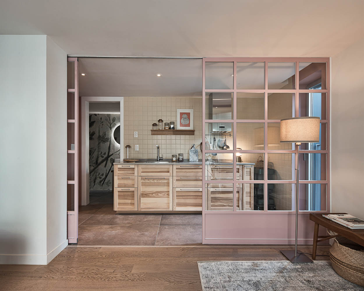 The building includes two types of houses: rental apartments of 30m2 on the 2F and 3F and a private residence in a duplex solution on the 4F and 5F. The rental apartments are designed with the intention to subdivide the space into two distinctive zones differentiating the kitchen area from the living/ sleeping one avoiding direct visual contact between the bed and the cooking. Ultimately, the purpose of the design is to create a sense of larger space.