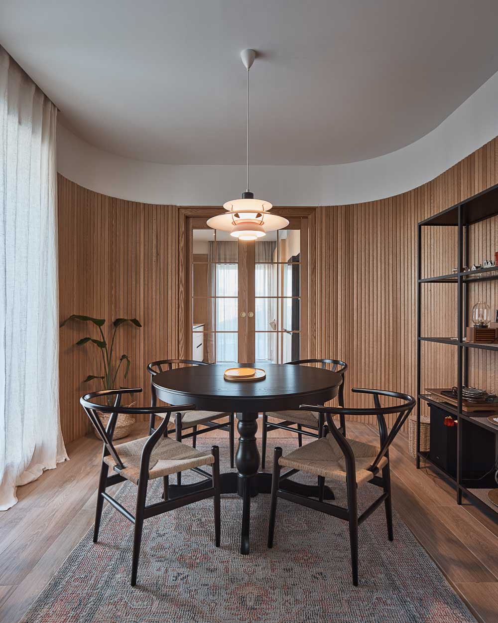 The private house on the 4F and 5F is designed with a classic European principle of space organization. The kitchen, dining, and living room are organized linearly along the same axis creating long visual perspectives, again, to increase the perception of scale of space inside a relatively small house.