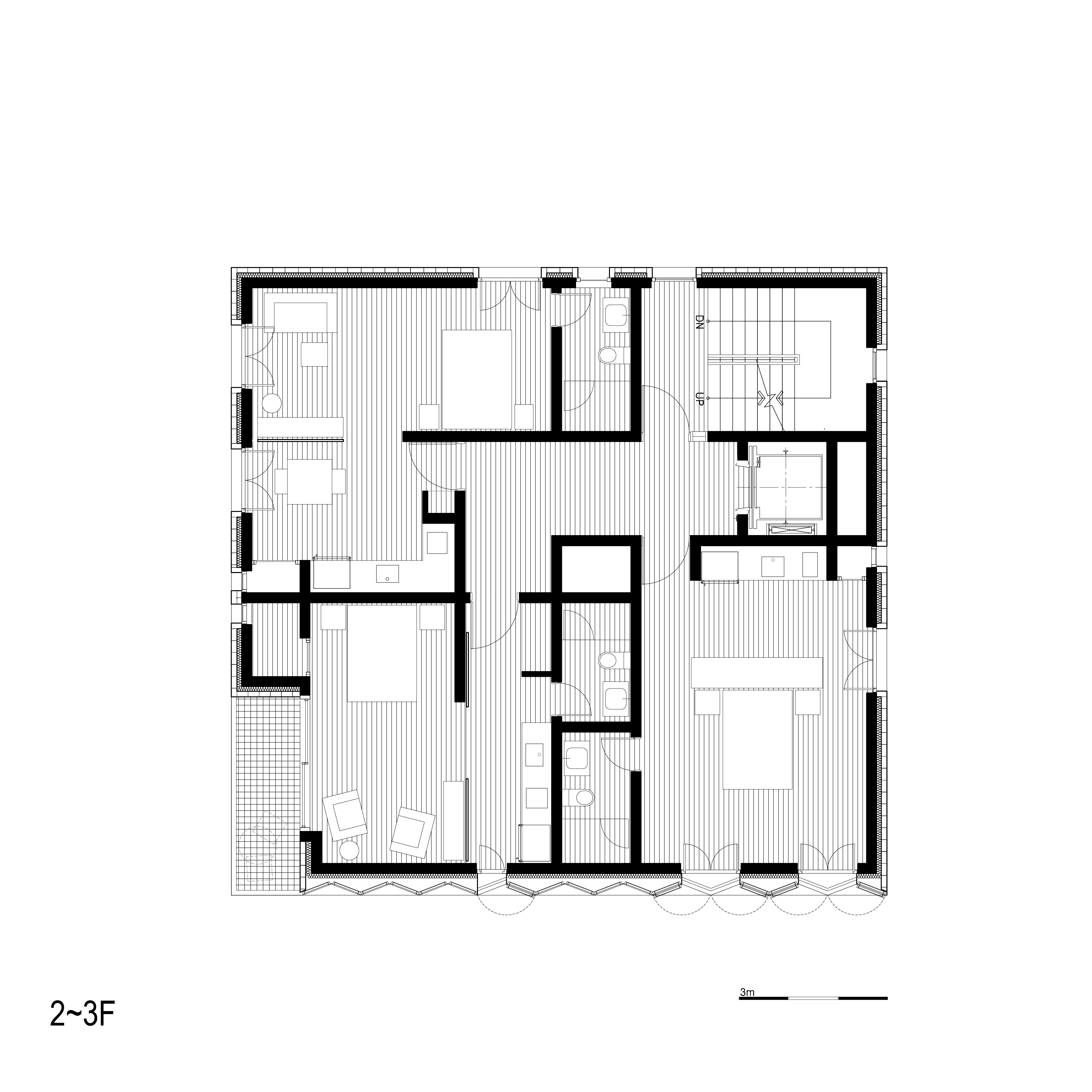 건물은 2층과 3층에 30㎡ 규모의 임대 세대와 4층과 5층에 복층형 단독주택으로 구성된 2가지 유형의 주택으로 구성된다. 임대 세대는 침실과 주방 사이의 직접적인 시각적 접촉을 피하면서 두 공간을 각각 독립적 구역으로 구분한다. 동시에 궁극적인 목표는 더 넓은 공간을 확보하는 것이다.