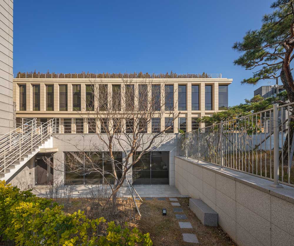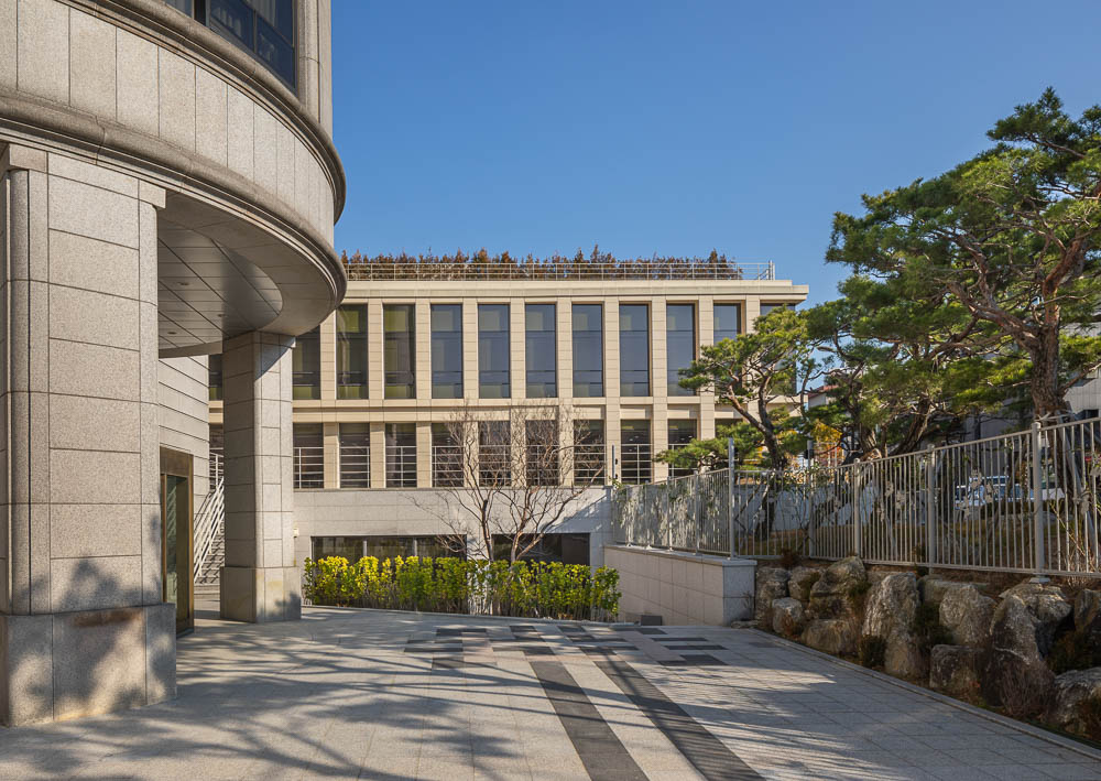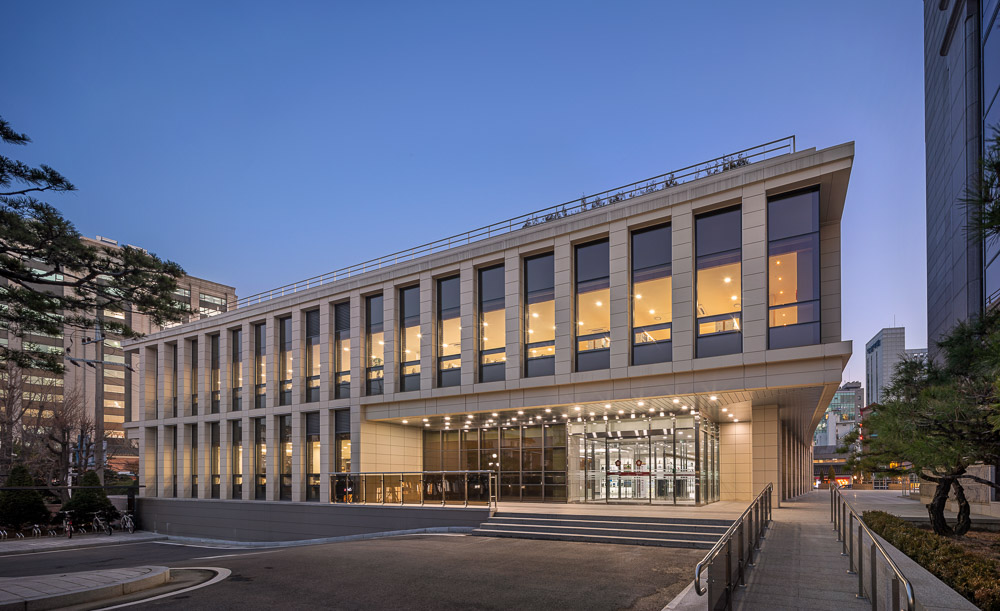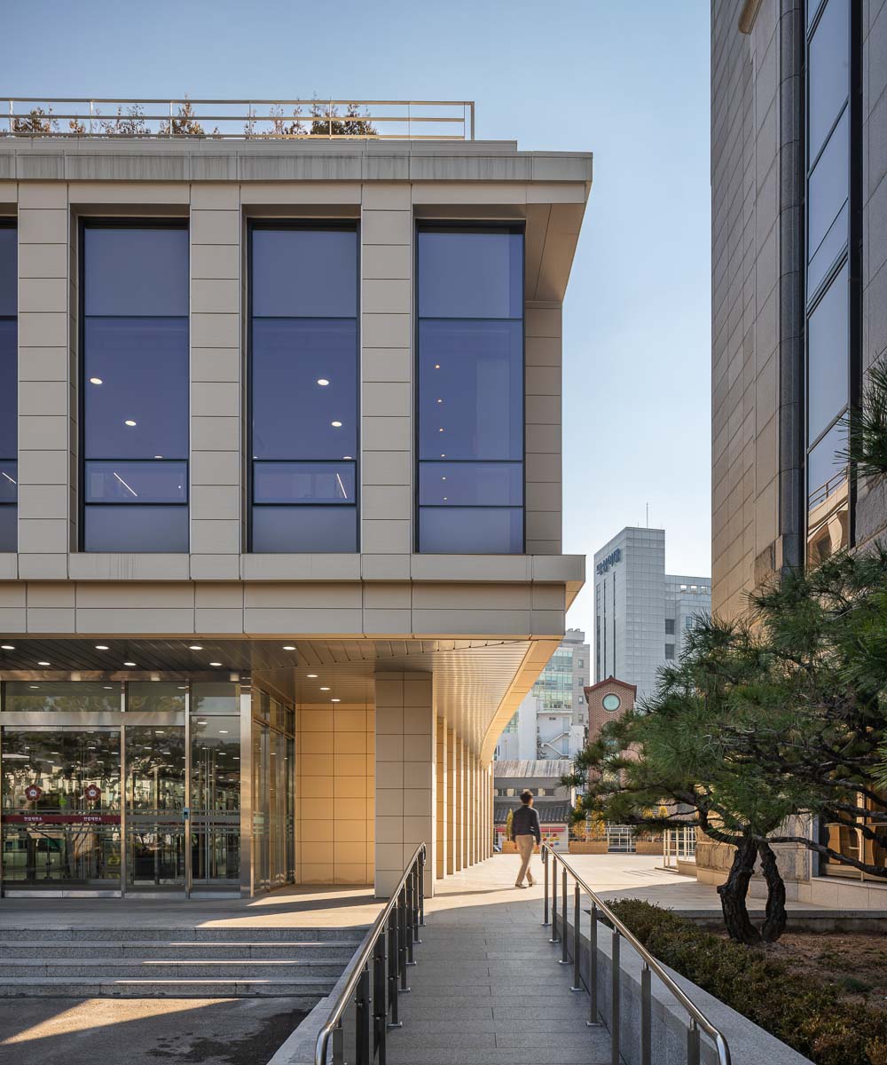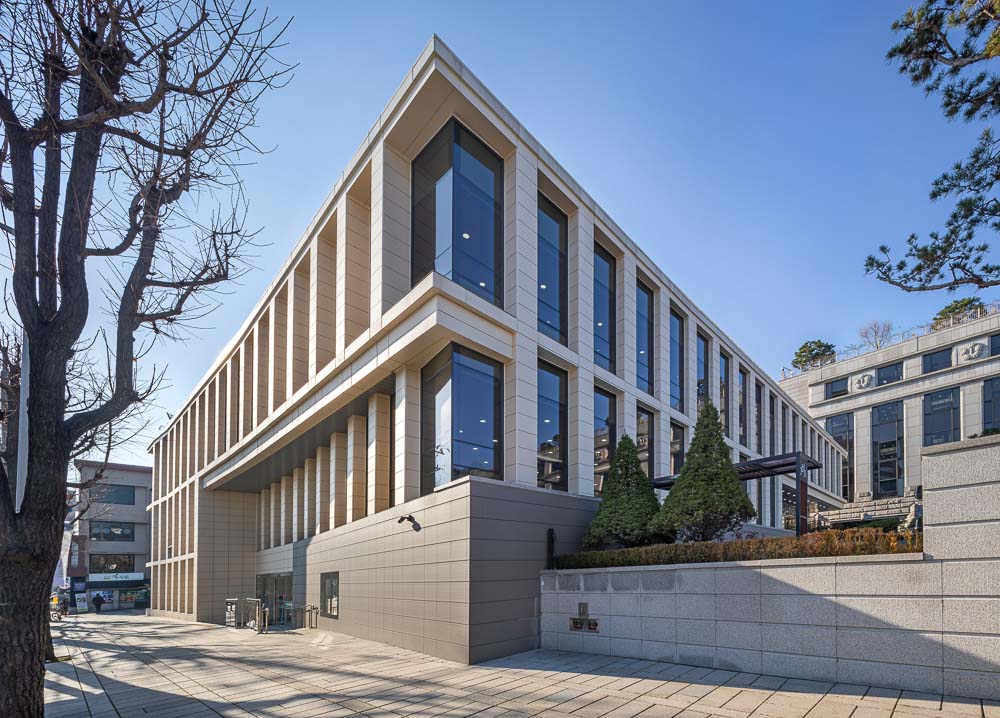 The north side encloses the front terraced fountain yard together with the main building, and provides a view extending to Bukhansan Mountain in the distance through the window of the reading room of the library. The first floor is not only linked to the lower floor through the open space connecting the main entrance hall of the library and the book cafe, but also faces the south and west rear gardens, sunken yard, and the hanok residential area in Bukchon. The view of the entire Bukchon area can be enjoyed from the roof-top garden, which is another rest area. The shape of the annex is based on a rectangle, but the east side has a diagonal contour corresponding to the front width. Each corner of the square is opened with a window and the depth of the elevation frame is changed to express the elegant nobility of the delicate hanok eaves. While applying the vertical colonnade pattern of the main building, which maintains strict symmetry with the stepped fountain in the front, the main building will harmonize with the layout and composition with some changes.