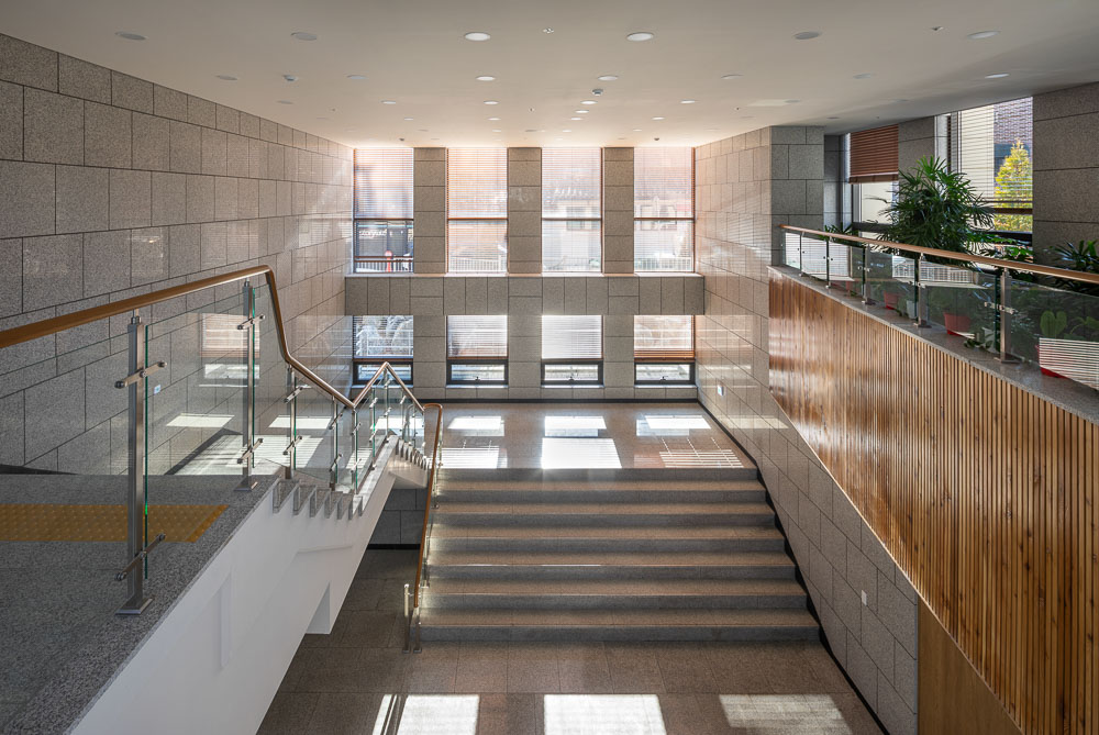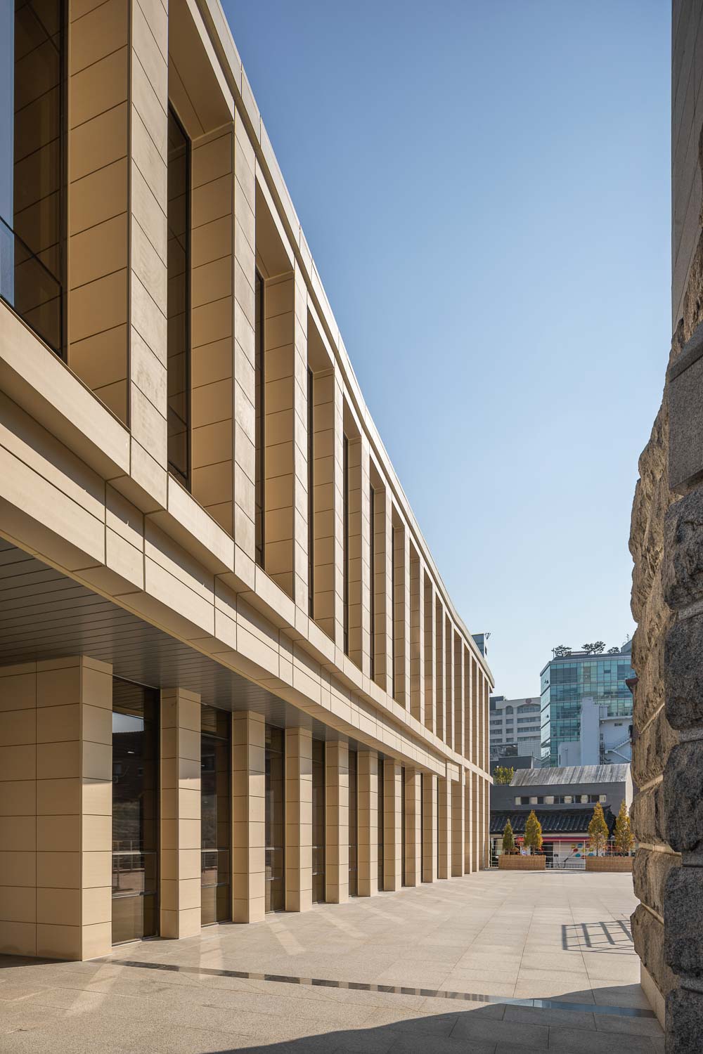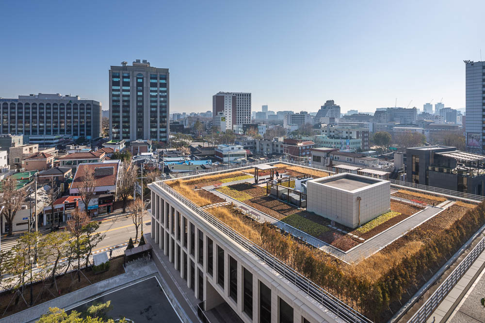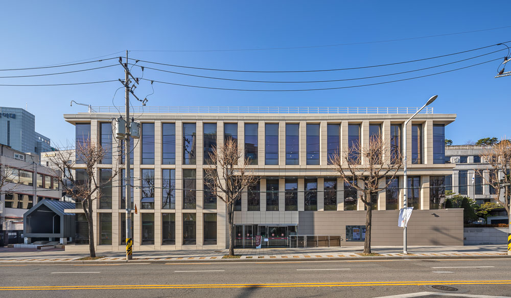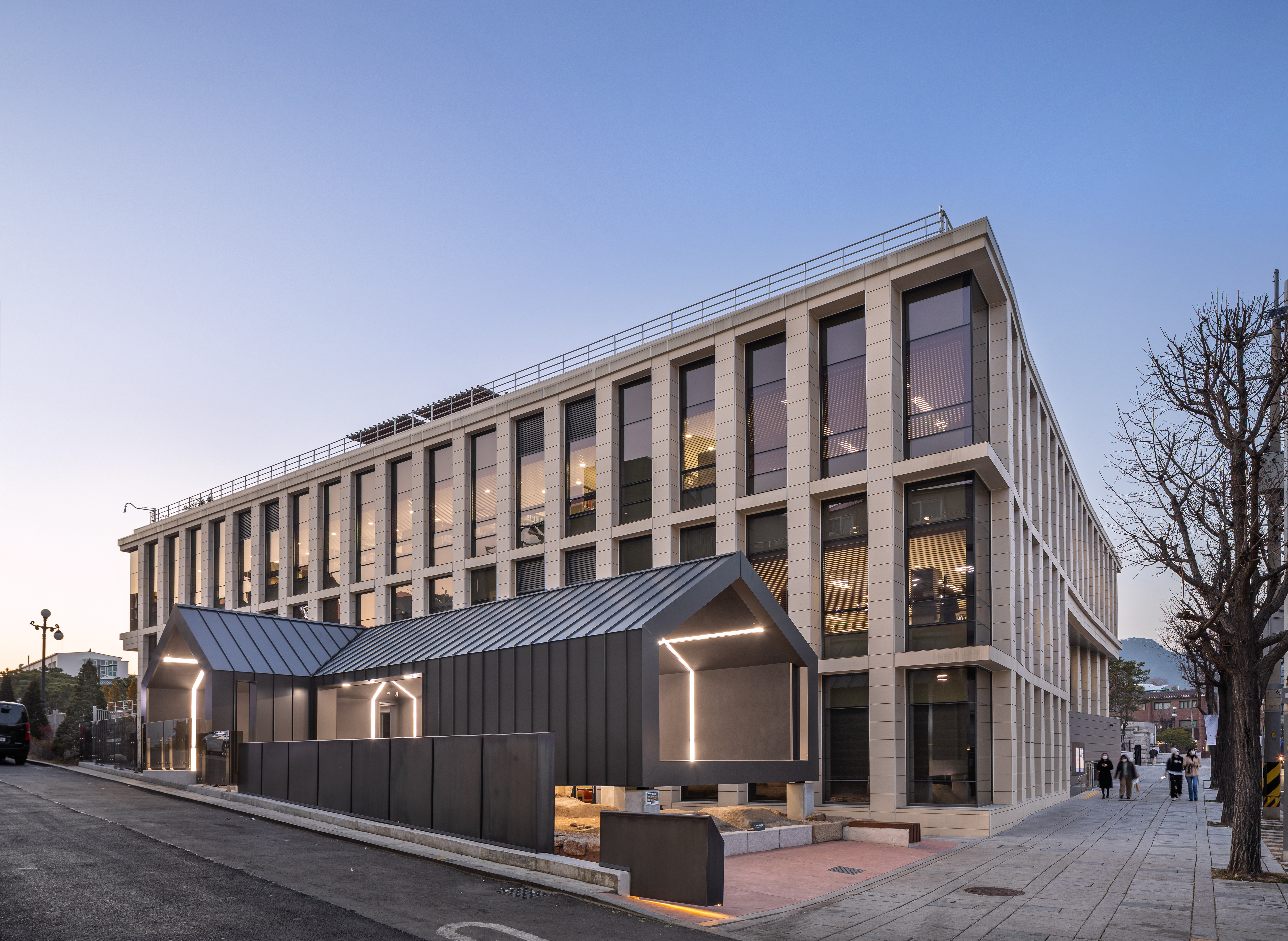 The north side encloses the front terraced fountain yard together with the main building, and provides a view extending to Bukhansan Mountain in the distance through the window of the reading room of the library. The first floor is not only linked to the lower floor through the open space connecting the main entrance hall of the library and the book cafe, but also faces the south and west rear gardens, sunken yard, and the hanok residential area in Bukchon. The view of the entire Bukchon area can be enjoyed from the roof-top garden, which is another rest area. The shape of the annex is based on a rectangle, but the east side has a diagonal contour corresponding to the front width. Each corner of the square is opened with a window and the depth of the elevation frame is changed to express the elegant nobility of the delicate hanok eaves. While applying the vertical colonnade pattern of the main building, which maintains strict symmetry with the stepped fountain in the front, the main building will harmonize with the layout and composition with some changes.