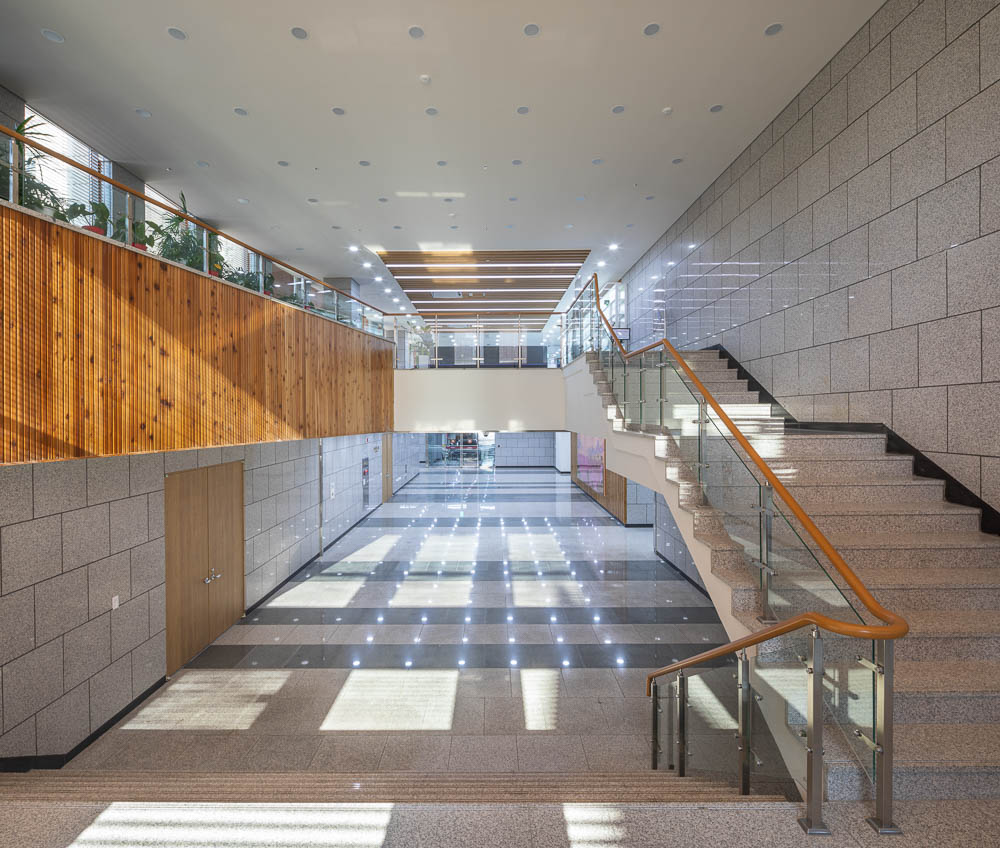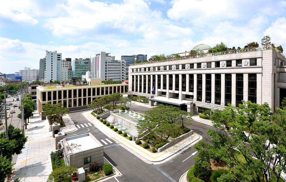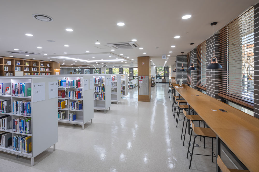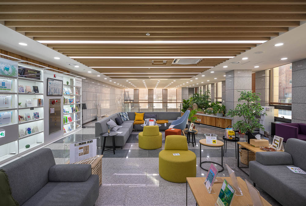 The library, which has been built as an individual area, minimizes the volume of the upper to alleviate the pressure felt on the main building without covering the main building. The contact points with the outside were expanded and openness was strengthened. The planar configuration attempts to establish a relationship with the different surrounding environments by opening the four sides with a central core. First, the east side directly faces pedestrians and visitors going to and from Bukchon. On the first basement floor, the exhibition room and civil complaint reception room are placed around the lobby, and inside, it forms a boundary with the area connected with the main building, and contains the staff office and a multi-purpose room. In the exhibition room, communication such as the history of the Constitution and the role of the Constitutional Court is communicated through exhibits. On the first and second floors, where the library is located, the reading space and bookshelves are arranged in an open style toward the outside.