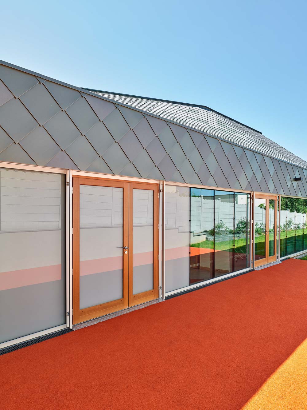 ‘또 다른’ 종류의 건물을 만드는 동시에, 사람들이 알아볼 수 있게 하려고, 들판의 상직적인 헛간의 일종인 핀치 지붕을 사용했다. 또한, 지붕 선을 달리해 프로그램의 공간성을 높였고, 구조적 원리에 따라 새로운 독립체를 만들어냈다. 지붕은 투명한 주춧돌로 땅과 분리된 덩어리, ‘하늘을 나는 지붕(Flying Roof)’로 읽힌다. 징크 지붕널로 만들어낸 지붕은 상징적인 형태와 색으로 건물의 활동을 차별화하고자 하는 열망에서 출발했다. 현장에서 찍은 사진을 지도로 변환해 픽셀의 패턴을 만든 다음 지붕 타일에 적용했다.