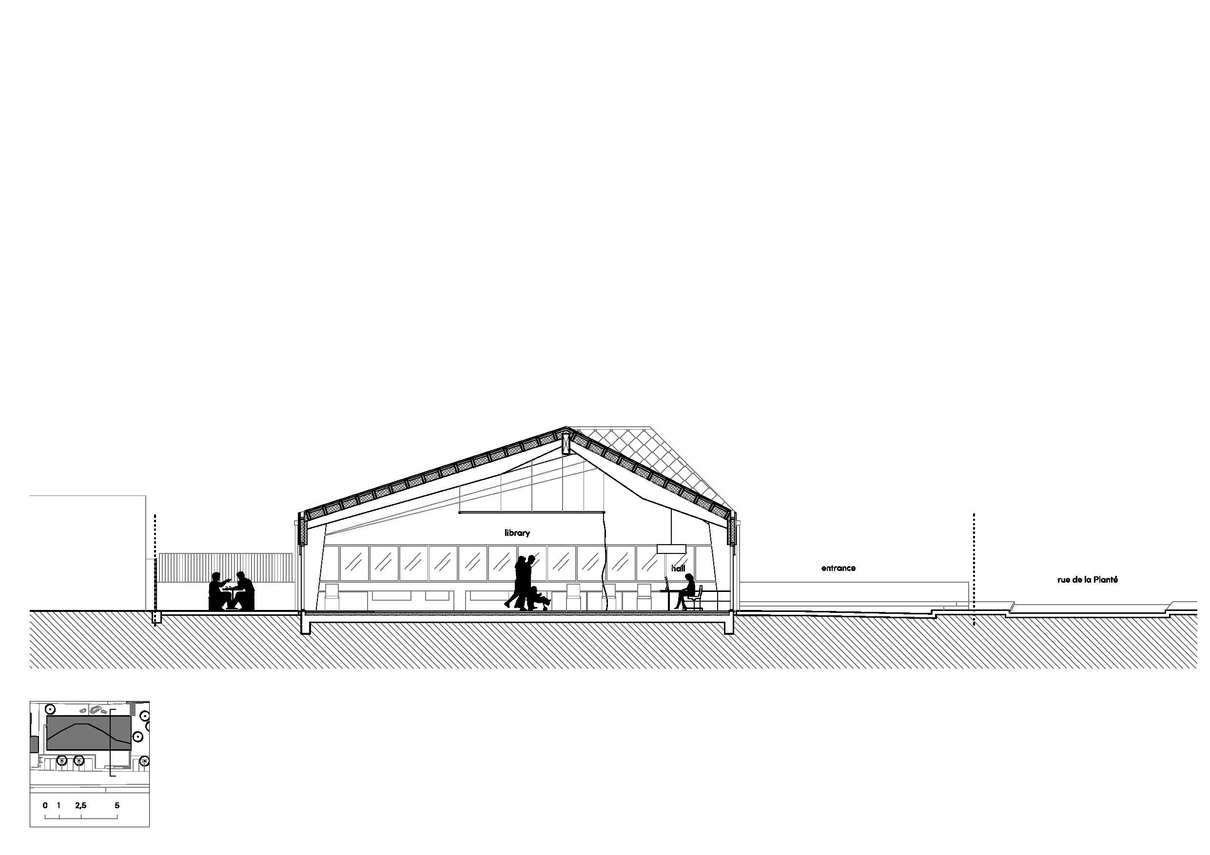 The Town Hall of Quedillac wanted to build a Cultural Center for the city. The main objective was to battle against capsularisation by providing a place where a diversity of publics could mix and gather around a common ground, thus fostering a social bond among the citizens. The new building would include a multimedia library, hall - coffee area, a youth space for teenagers and a childcare section for small children.