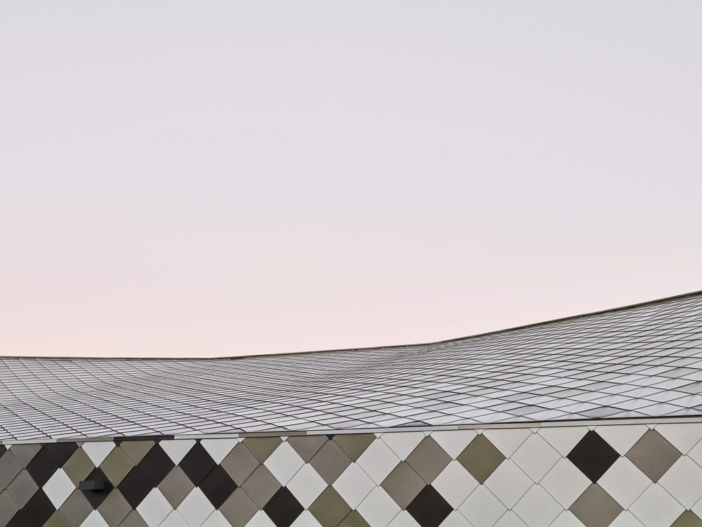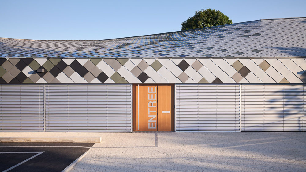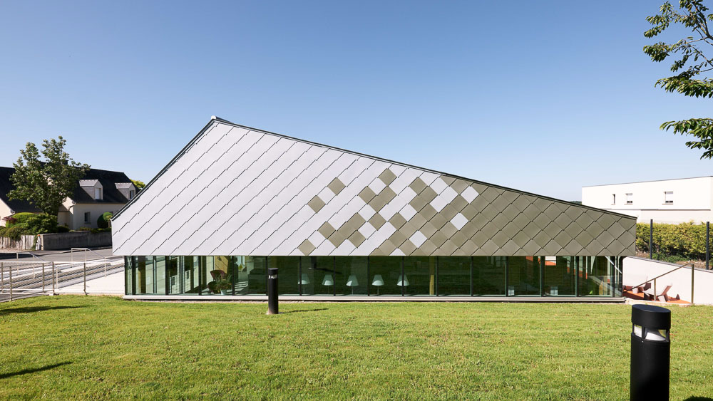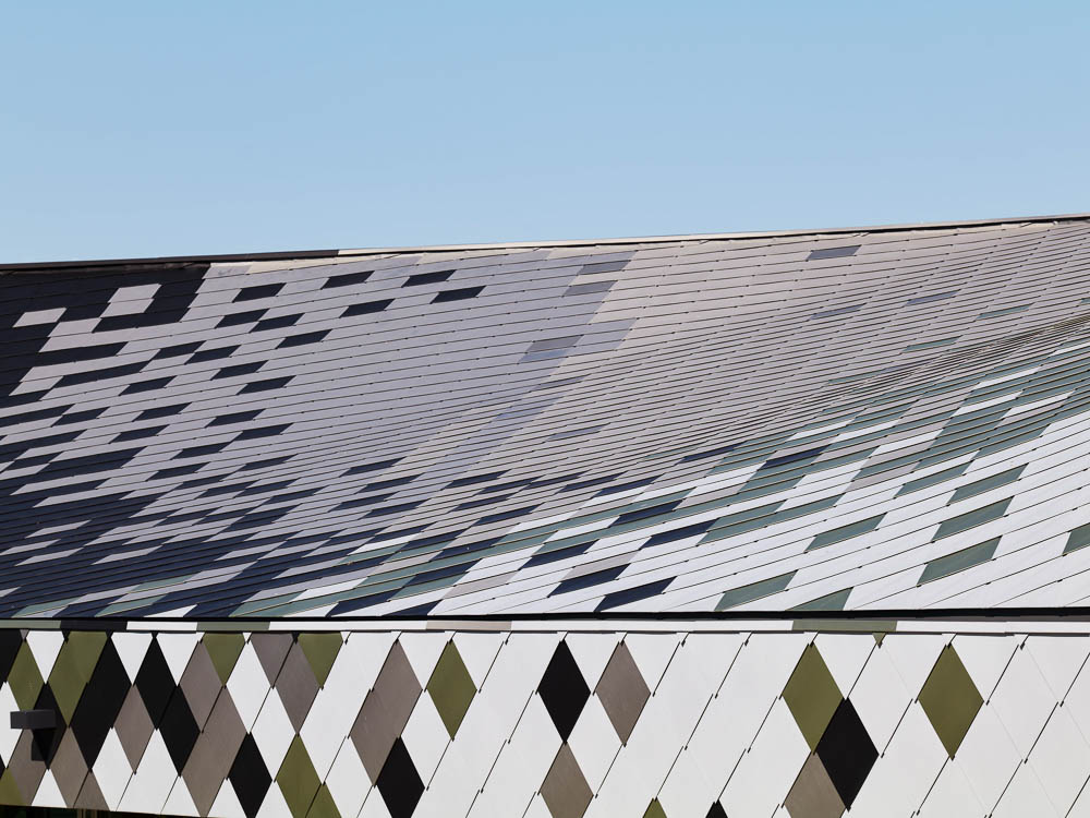‘또 다른’ 종류의 건물을 만드는 동시에, 사람들이 알아볼 수 있게 하려고, 들판의 상직적인 헛간의 일종인 핀치 지붕을 사용했다. 또한, 지붕 선을 달리해 프로그램의 공간성을 높였고, 구조적 원리에 따라 새로운 독립체를 만들어냈다. 지붕은 투명한 주춧돌로 땅과 분리된 덩어리, ‘하늘을 나는 지붕(Flying Roof)’로 읽힌다. 징크 지붕널로 만들어낸 지붕은 상징적인 형태와 색으로 건물의 활동을 차별화하고자 하는 열망에서 출발했다. 현장에서 찍은 사진을 지도로 변환해 픽셀의 패턴을 만든 다음 지붕 타일에 적용했다.