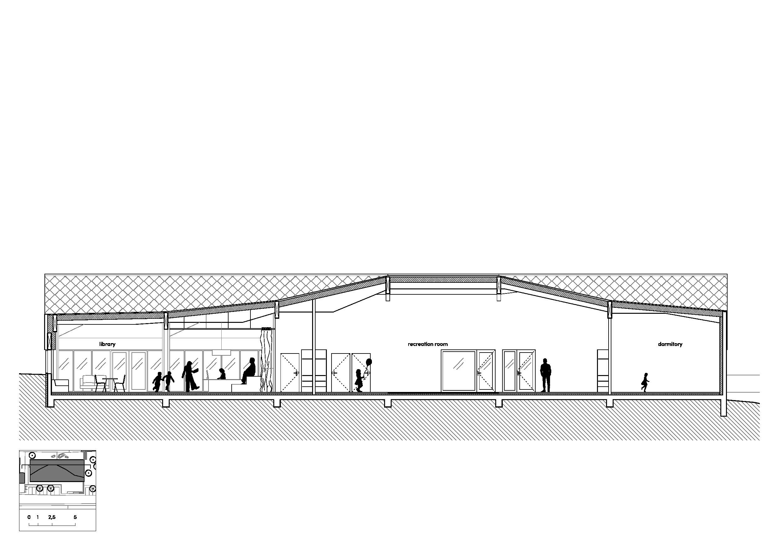 In order to create a building of “another” kind but at the same time being recognizable, we deployed a pinch roof typology, a sort of an iconic barn-house in a field. Furthermore, by manipulating the roof ridge so to enhance the spatiality of certain internal programs (youth center, multimedia library, child care section), and following the structural principle of the building, a new entity is produced. The roof is read as a mass detached from the ground with a transparent plinth, a “flying roof” sheltering the public sphere. The materialization of the roof in zinc shingles spins from its iconic form and the desire to differentiate the activities in the building through color. A map, from a picture taken from a site visit, was translated to create a pixel kind of pattern which was then applied to the roof tiling.