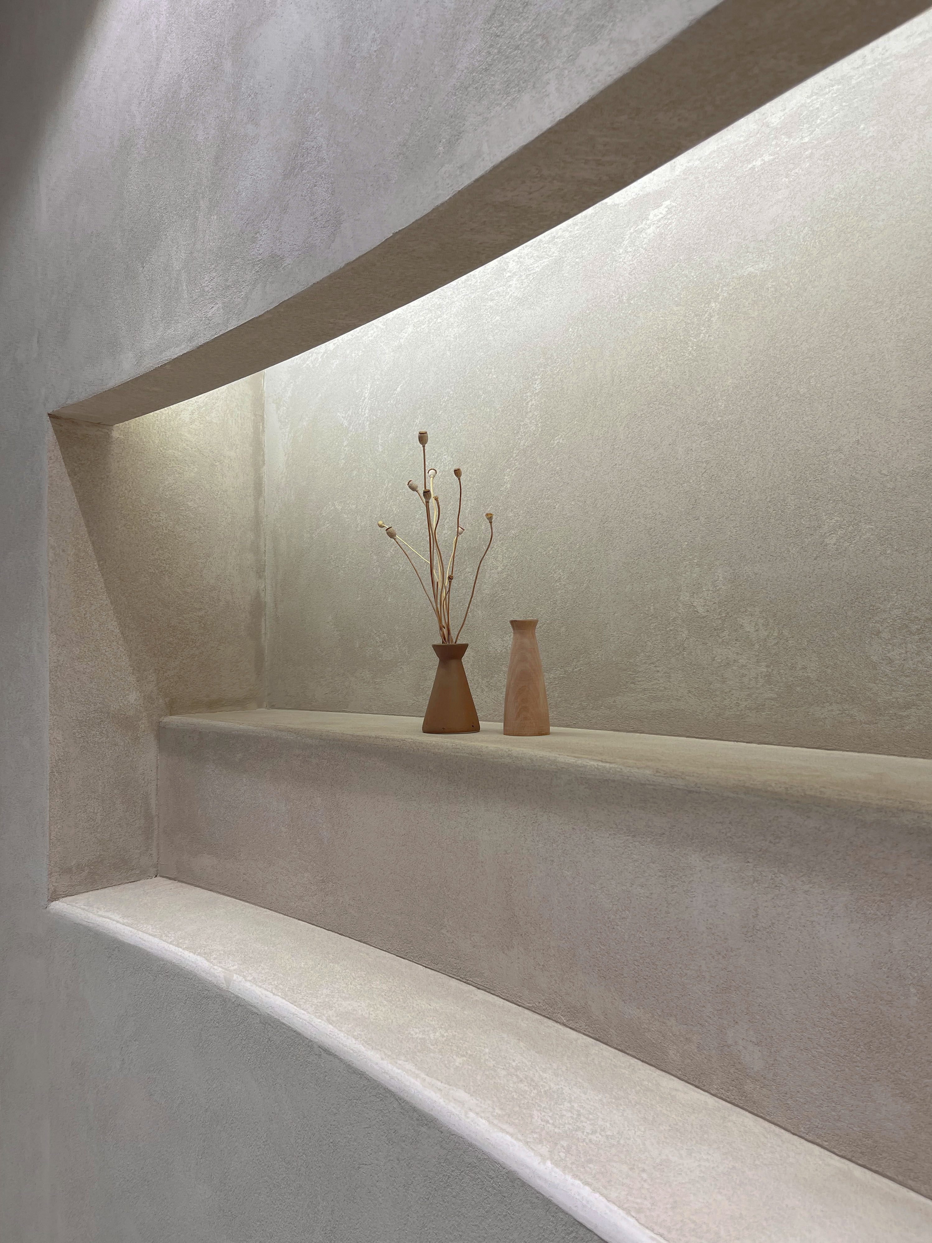 The cosmetic brand MUDE started with the word MUSE, an inspirational being. We wanted to create a space that conveys inspiration like a brand story. We developed the design language in the hope that it will be a space that expresses MUDE's unique sensibility and value. First, form. It formed a space to express the smoothness of the curve. Through elegant curves, MUDE's brand image was captured in space. Second, materials. We wanted the core space to be like a picture, and for this, we used beautiful natural elements and textures. It was intended to convey a comfortable and unique experience with a small landscape painted with a combination of long grass leaves, flowers with simple images, and stones of rough physical properties. Third, the color. The warm and deep beige color and the gentle light that shines on it drew a comfortable mood space. Through this, I was planning to carefully capture the relaxed and elegant atmosphere of MUDE. I hope it will be a space where you can rest and deliver inspiration beyond providing a better working environment for those staying in the office.