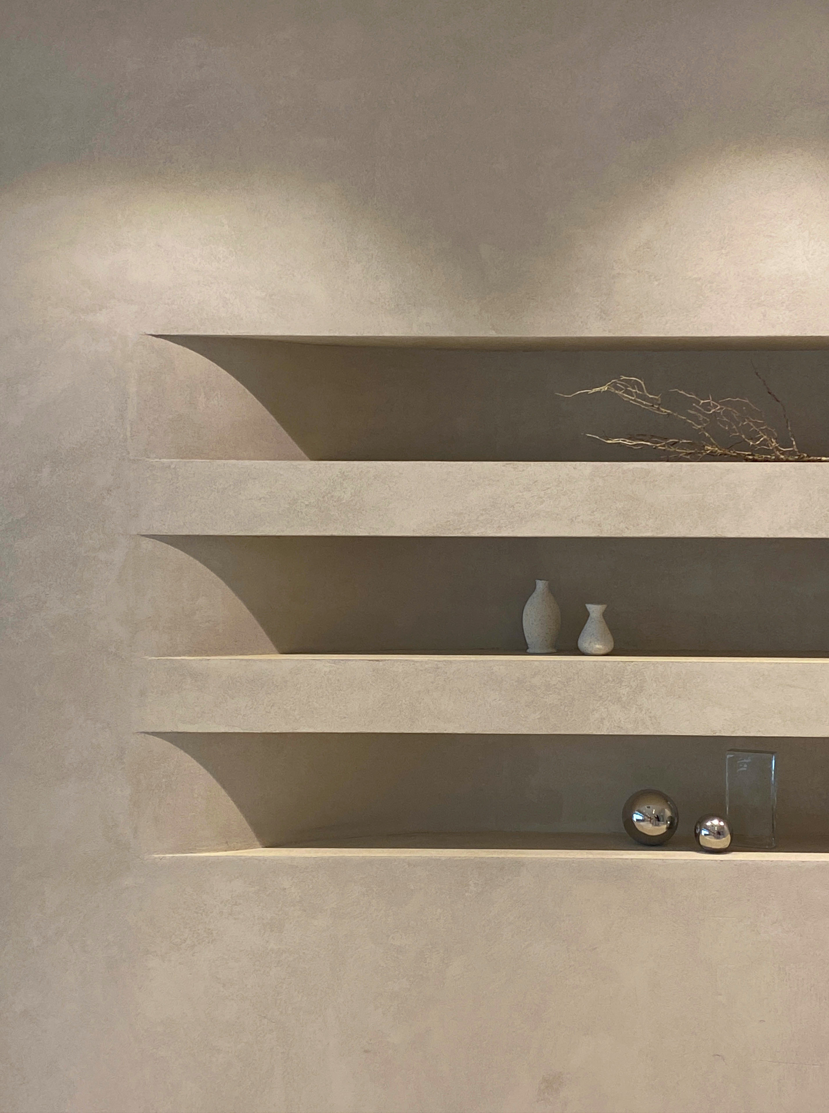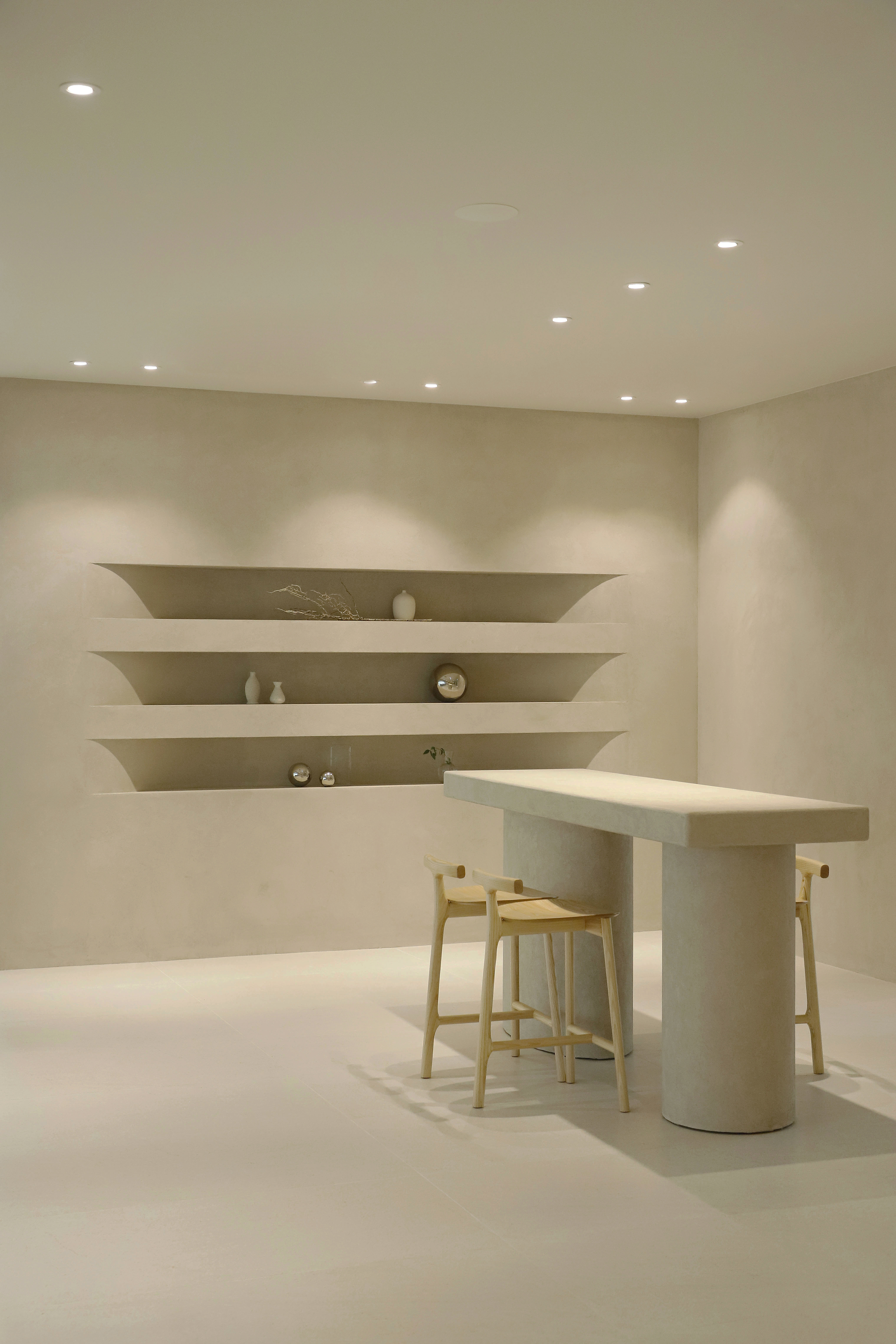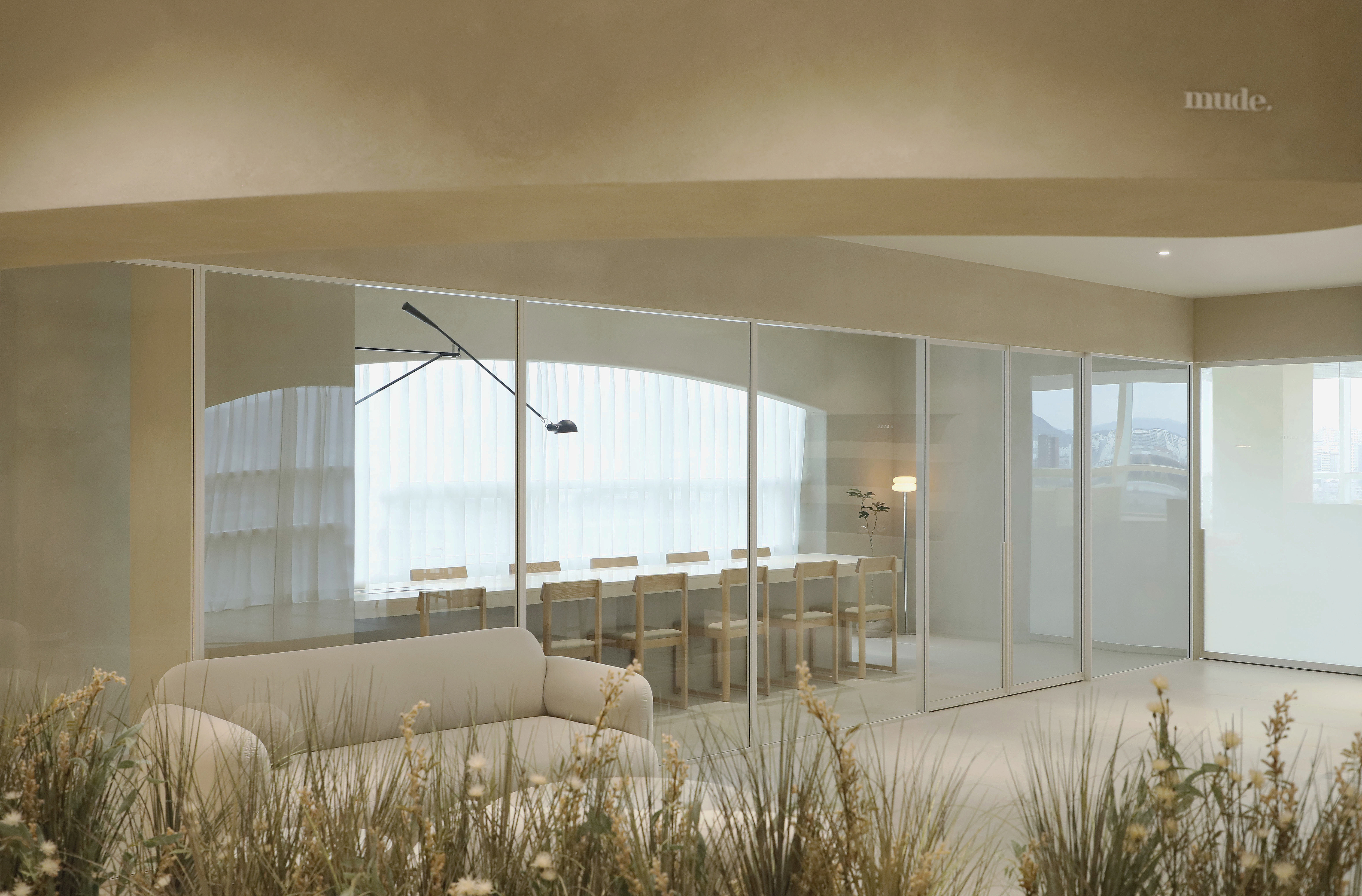 The cosmetic brand MUDE started with the word MUSE, an inspirational being. We wanted to create a space that conveys inspiration like a brand story. We developed the design language in the hope that it will be a space that expresses MUDE's unique sensibility and value. First, form. It formed a space to express the smoothness of the curve. Through elegant curves, MUDE's brand image was captured in space. Second, materials. We wanted the core space to be like a picture, and for this, we used beautiful natural elements and textures. It was intended to convey a comfortable and unique experience with a small landscape painted with a combination of long grass leaves, flowers with simple images, and stones of rough physical properties. Third, the color. The warm and deep beige color and the gentle light that shines on it drew a comfortable mood space. Through this, I was planning to carefully capture the relaxed and elegant atmosphere of MUDE. I hope it will be a space where you can rest and deliver inspiration beyond providing a better working environment for those staying in the office.