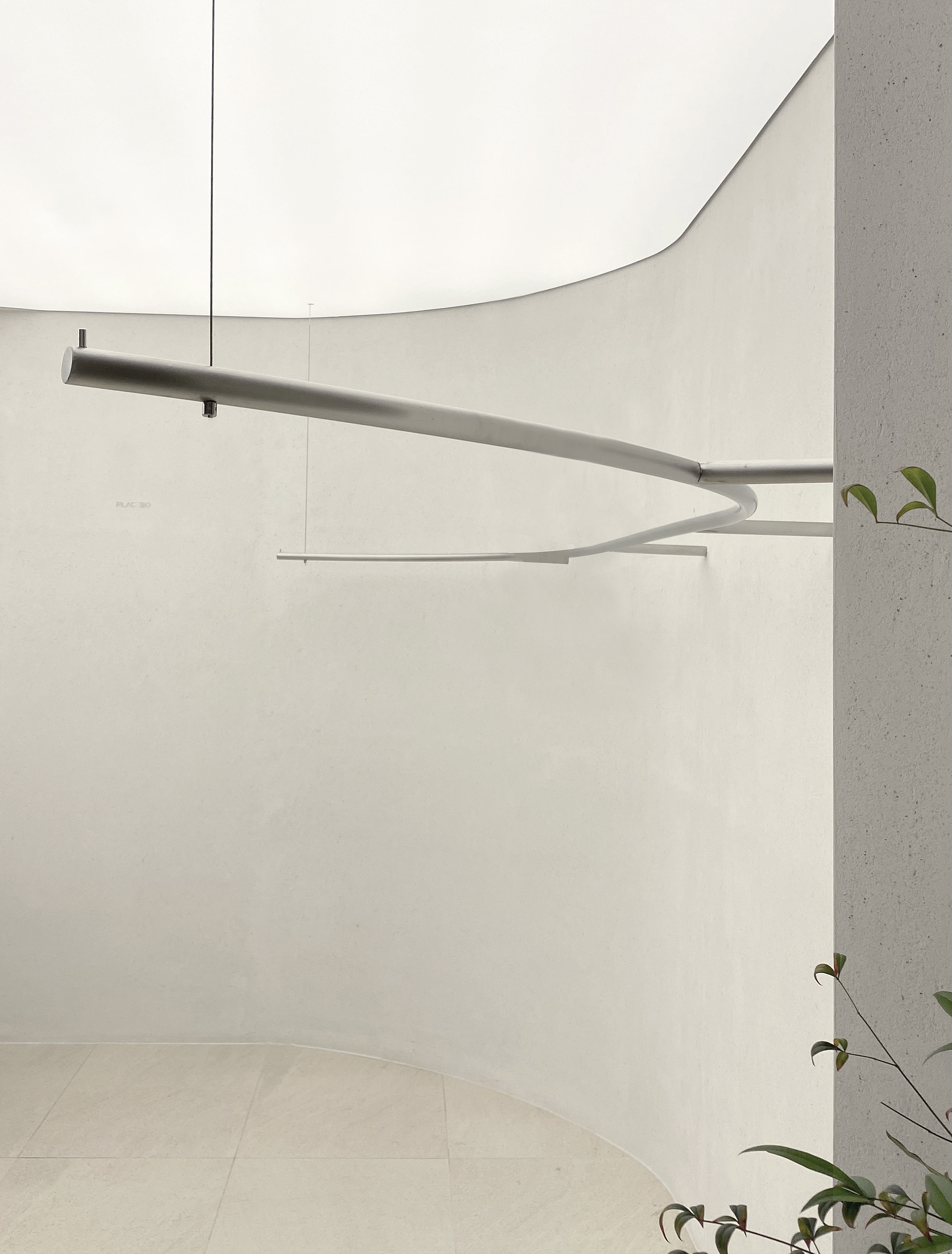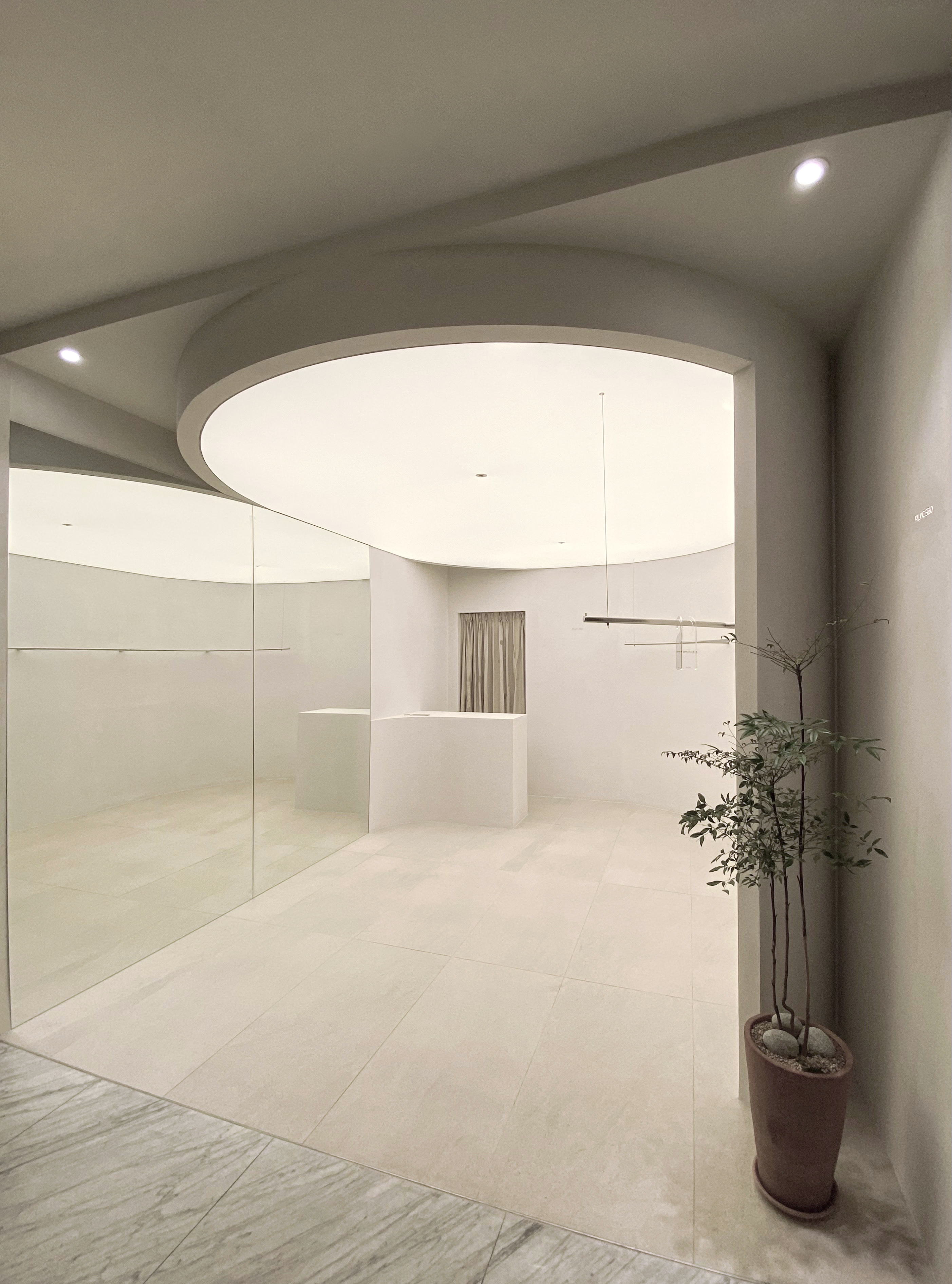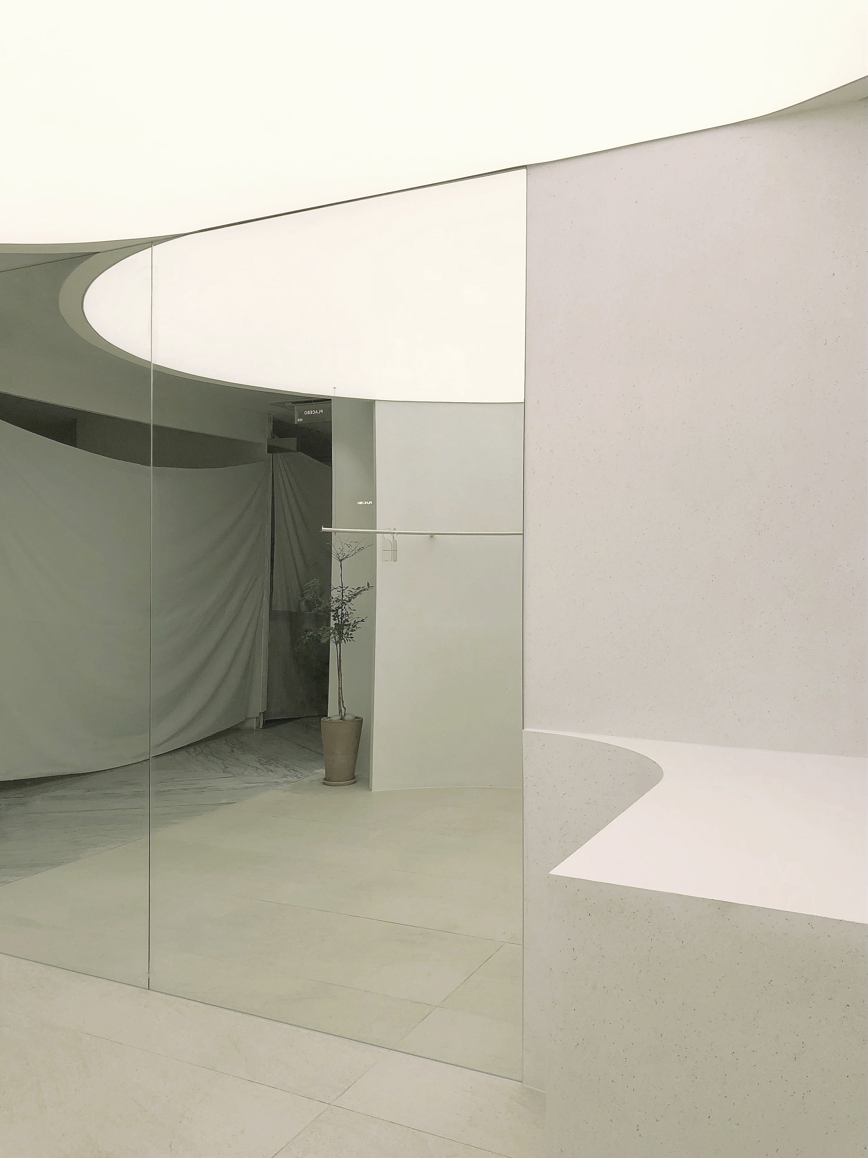 8평정도의 소규모 공간으로 부드러운 곡선의 형태미를 담은 공간을 만들고자 했다. 이를 위해 레이아웃과 소재는 간결하게 표현하여 곡선의 원형 공간을 강조하였다. 헹거링은 라운드의 형태로 한 섹션에만 구성하여 고객의 동선을 유도하였으며 공간의 집중도를 높였다. 한쪽 벽면은 거울을 통해 좁은 공간이 확장되어 보이도록 연출했다. 천장에서 은은하게 퍼지는 빛으로 차분한 분위기를 담아 자신의 취향을 세심하게 살펴볼 수 있도록 하였다.
