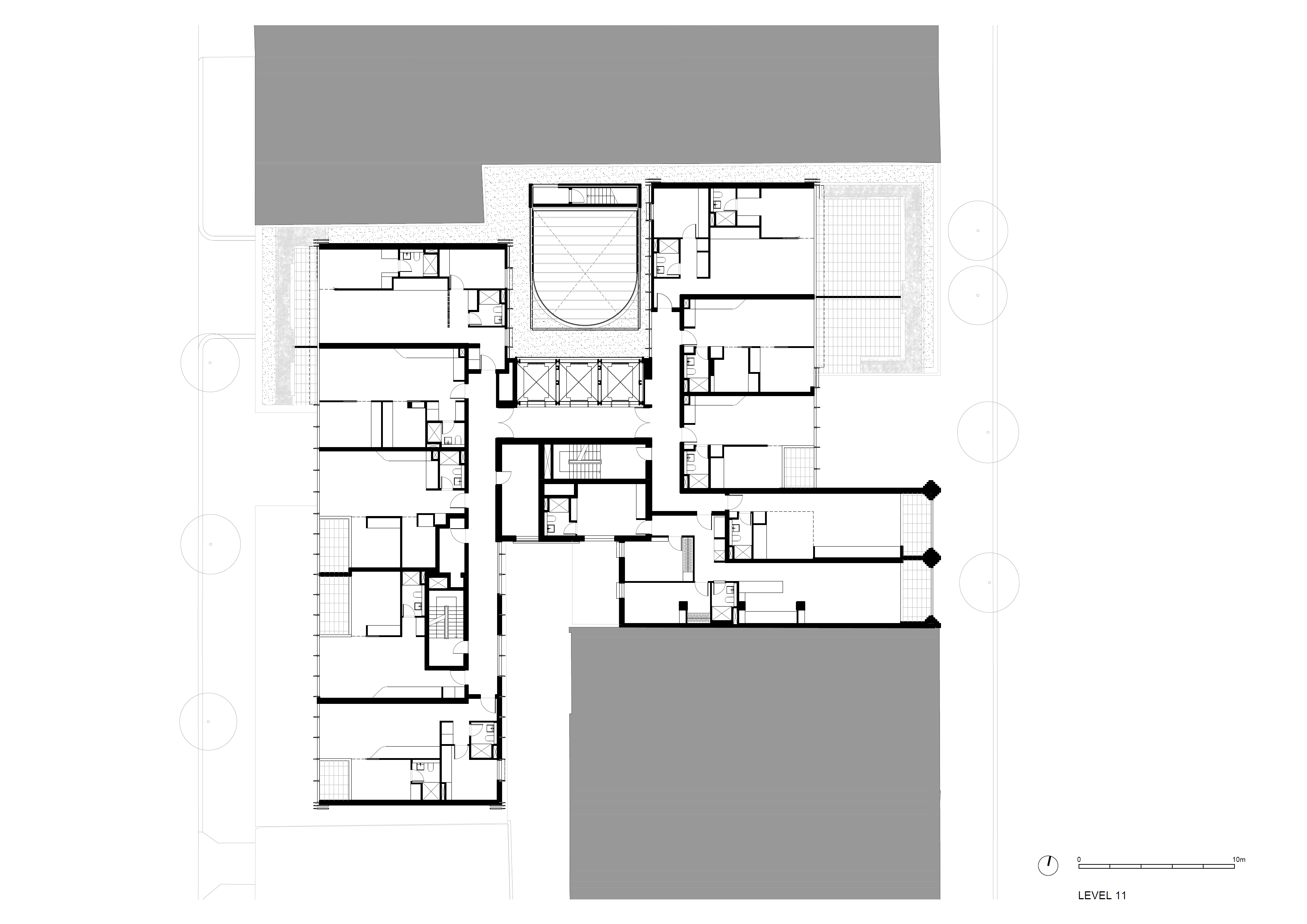 호주 시드니에 위치한 ARC는 볼링장이었던 것에서 이름을 따왔다. 위에는 59개의 지느러미 형태가 건물의 전체를 따라 이동하며 자연스러운 꼭대기의 형태를 이룬다. 타워와 하늘이 맞닿는 것을 기념이라도 하듯 곡선 지붕 형태인 Arc가 스카이라인의 나머지 부분과 구별 짓는다. 이 개념은 장소의 역사적 맥락과 관련이 있다. 우리는 시드니에서 역사적으로 사용된 아치와 재질의 비율을 주의 깊게 연구했다. 기단부는 무거운 석조적 특징을 가지고 있는 반면, 위 탑은 더 미세하고 가벼운 재질을 가지고 있다. 우리도 모르게 기대하면서, 전통적인 벽돌의 사용에 대한 긍정적인 메시지에 휩싸여 있었다. 사람들은 대부분의 건물들이 유리와 금속인 현대 도시 중심부로 되돌아오는 전통적인 방법의 사용과 따뜻함에 반응했다. 이웃에 있는 중요한 유산 건물의 석조 구성 요소에서 영감을 받았다. 적십자 건물과 Andrew Bros Warehouse에서 특유의 아치 모양을 이끌어냈다. 이중성이 정면에 도입되었으며, 단과 타워의 다양한 미학이 표현되었다. 시드니 항구의 곡선적 특성과 인근 건물의 벽돌 세공물을 통해 알 수 있는 재료와 디테일은 시드니의 과거와 밀접한 관련이 있는 복잡성과 진정성이 있다. 도시의 대다수는 모든 곳에 평평한 지붕의 건물들이 있다. 아크는 옥상을 개방할 기회를 모색한다. 우리는 시드니의 유명한 훌륭한 야외 라이프 스타일과 틀을 깨는 최초의 고층 주거 디자인을 기념하기 위해 디자인했다. 우리는 개인 아파트 대신 공공 편의시설을 위해 지붕을 사용하는 것이 더 가치가 있다고 시와 고객들에게 확신시켰다. 건축물이 사회적 상호 작용과 도시 환경의 재해석을 용이하게 하는 옥상으로 사람들이 탈출할 수 있는 도시를 상상해보라. 유기적인 꼭대기의 모양은 탑이 어떻게 하늘과 만나는지를 기념하는 곡선 지붕 형태인 아크를 주변 환경과 즉시 구분한다. 옥상은 지반면뿐만 아니라 고층부까지 활성화하면서 우리의 미래 도시에서 가능한 것에 대한 새로운 대화를 연다. 아크 옥상에 올라오면 도시의 뷰를 배경으로 시드니 항구가 보인다. 휘어진 지붕 아치는 당신을 시드니 항구의 자연스럽고 물결모양인 선과 최고의 자연 자산과 연결시킨다.