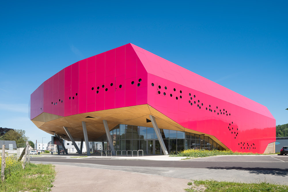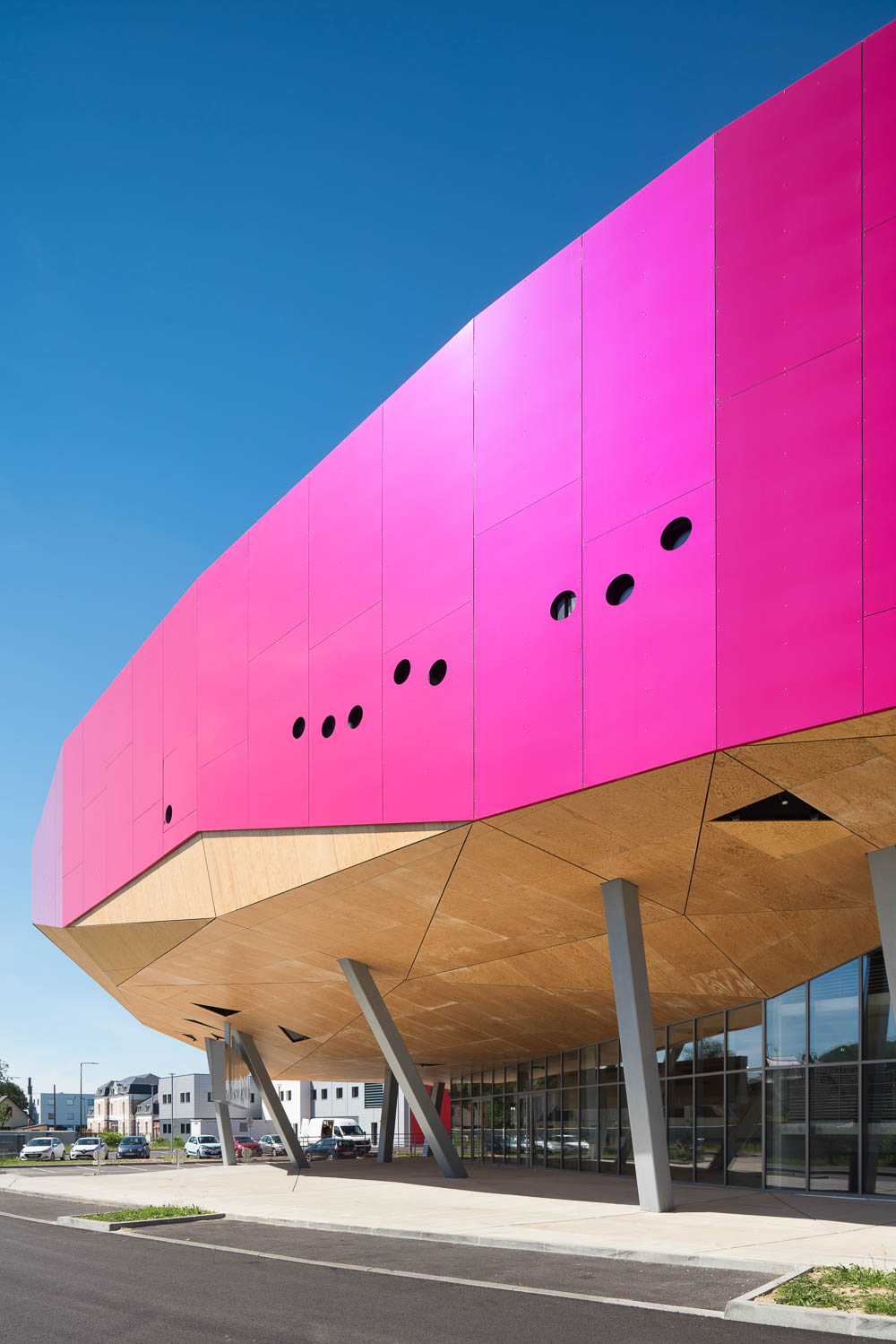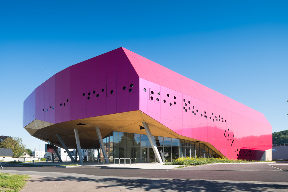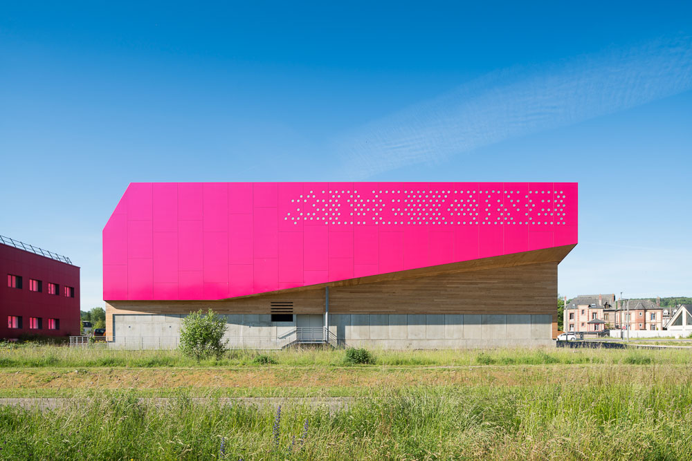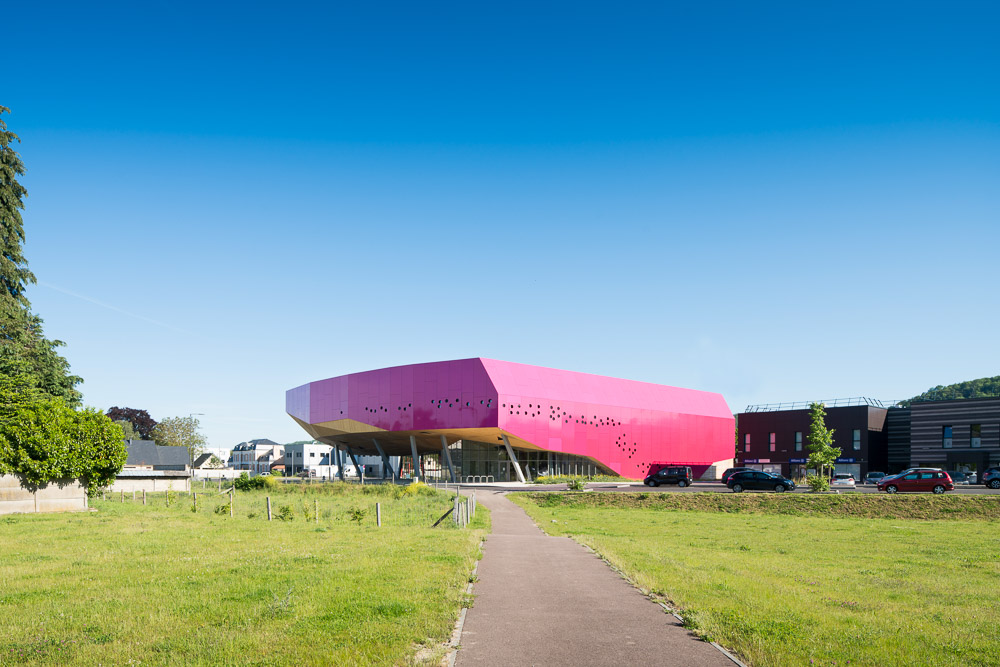 Together with an old train station repurposed into a restaurant, the cineplex signals the town’s new shopping and entertainment area and therefore should have a strong presence. While Jakob+MacFarlane’s centrally-located Pont-Audemer theatre is highlighted in orange - a contemporary version of the colour red that used to identify public entertainment venues in French cities of the nineteenth century - the envelope of the cineplex comes in strong pink, emphasizing its rootedness in the suburban culture. The cineplex will serve a larger area around Pont-Audemer with many of its visitors arriving by car, and a bright pink volume will be something one won’t fail to notice from a driver’s seat.