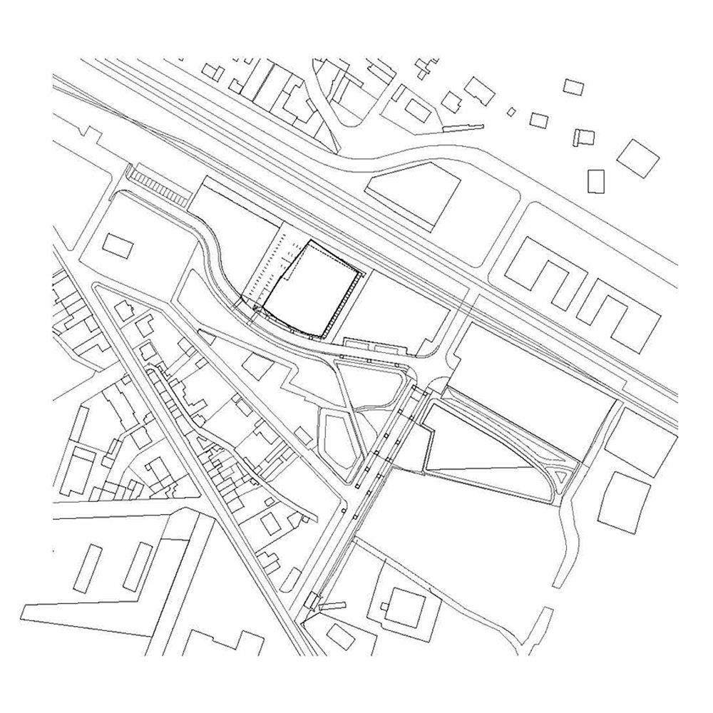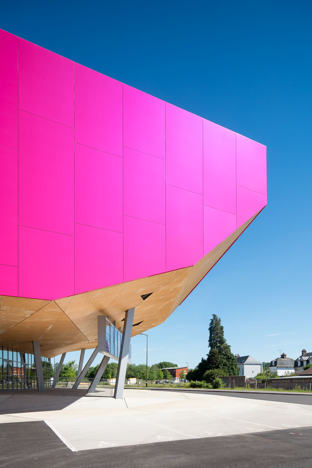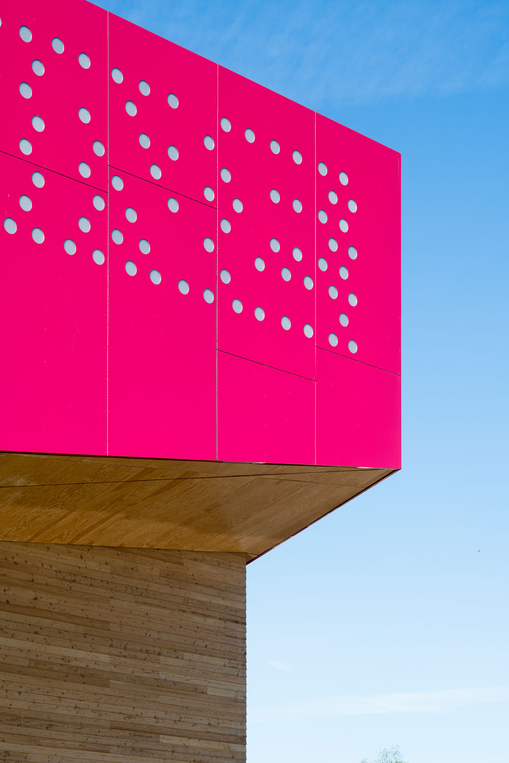 Together with an old train station repurposed into a restaurant, the cineplex signals the town’s new shopping and entertainment area and therefore should have a strong presence. While Jakob+MacFarlane’s centrally-located Pont-Audemer theatre is highlighted in orange - a contemporary version of the colour red that used to identify public entertainment venues in French cities of the nineteenth century - the envelope of the cineplex comes in strong pink, emphasizing its rootedness in the suburban culture. The cineplex will serve a larger area around Pont-Audemer with many of its visitors arriving by car, and a bright pink volume will be something one won’t fail to notice from a driver’s seat.
