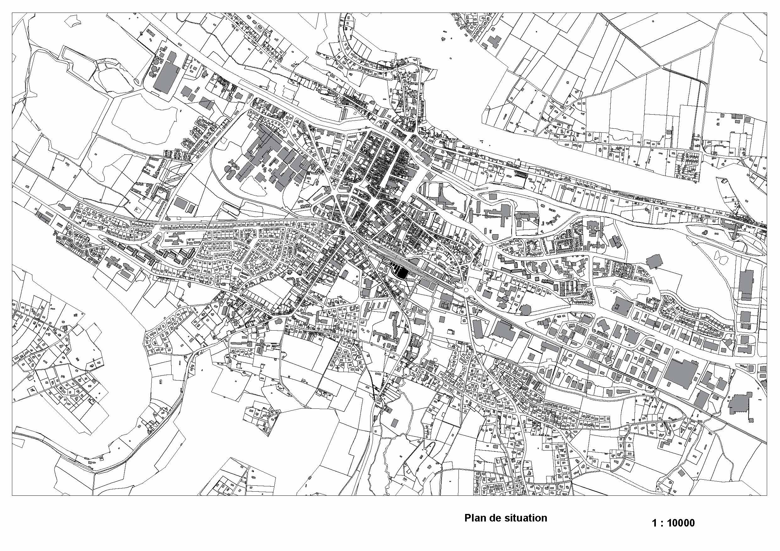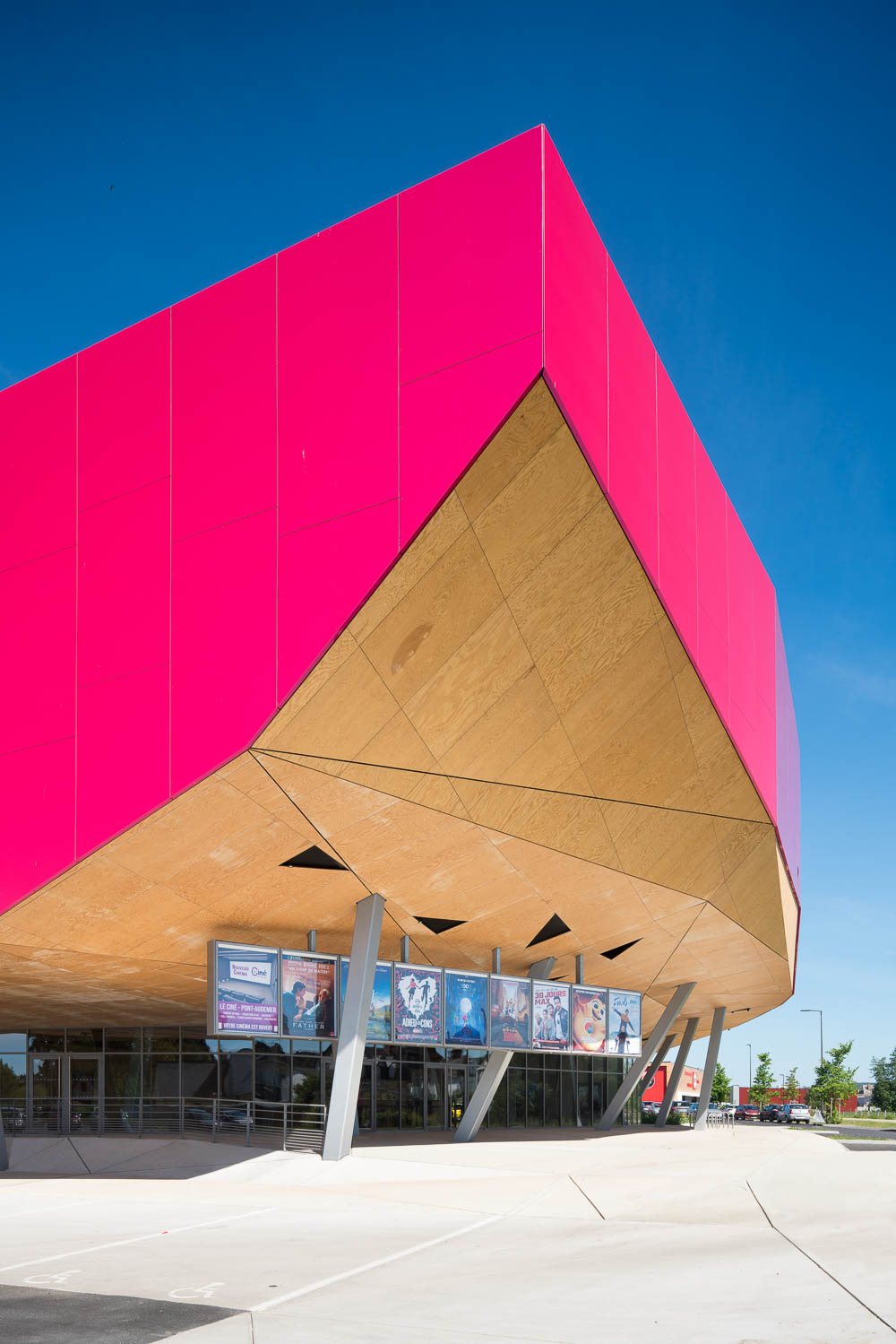 The new cinema complex is located on the edge of Pont-Audemer (but still within walking distance of the town center) and anchors a future commercial strip emerging on the site of a demolished foundry.