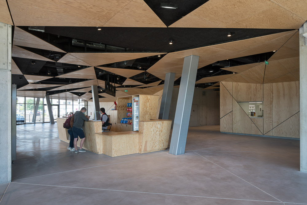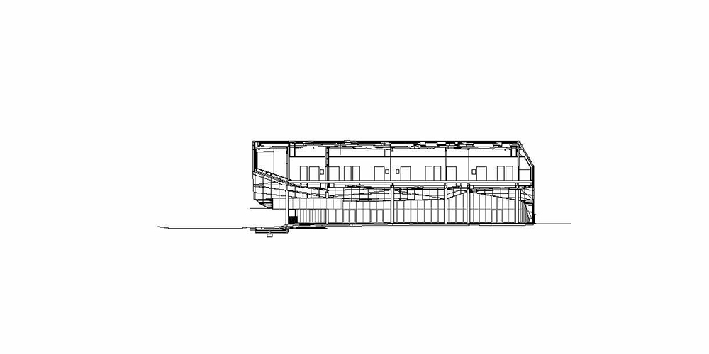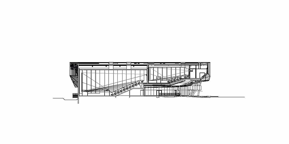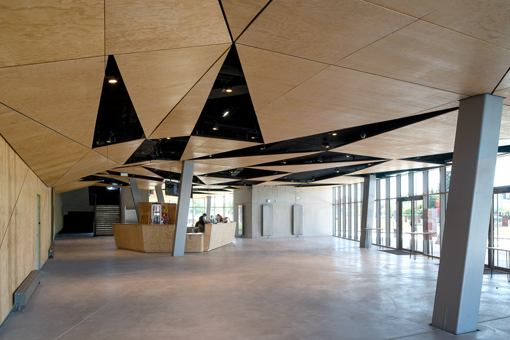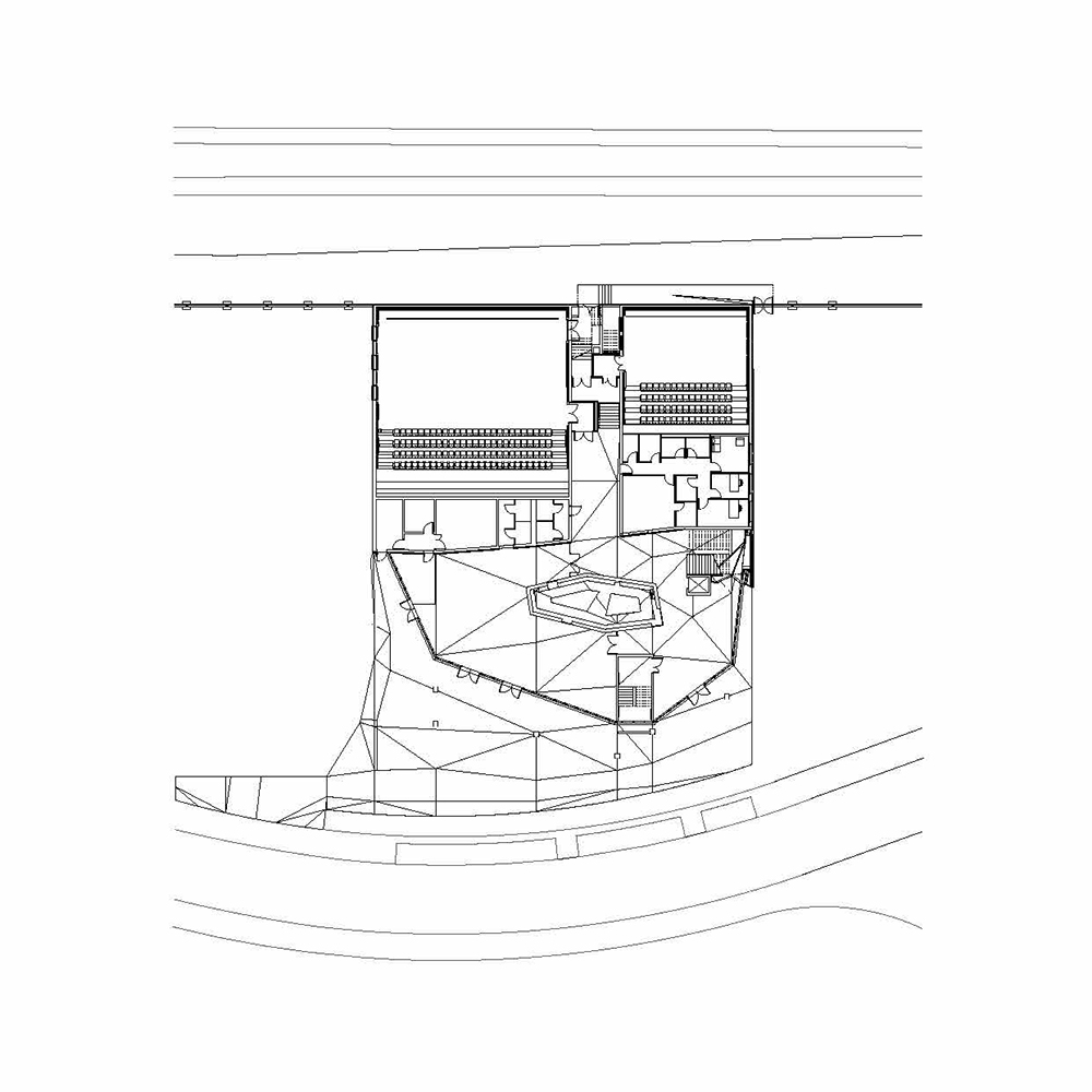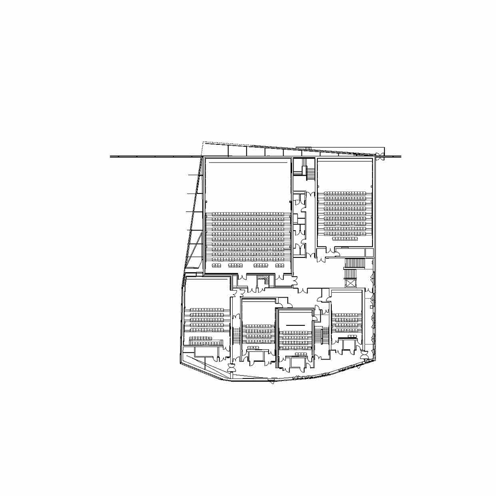 Six movie theatres ranging in size from 40 to 280 seats are stepped up in section from ground to first floor. The architects decided to stack the cinemas, with their naturally tiered shapes, into a small-to-large sequence - which created a raked volume with enough space underneath to wedge in an ample public lobby. The transparent lobby overlooks the newly created ecological zone.