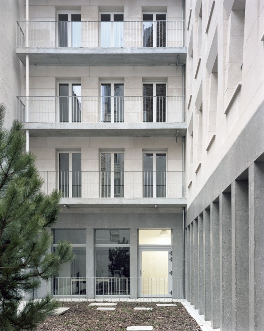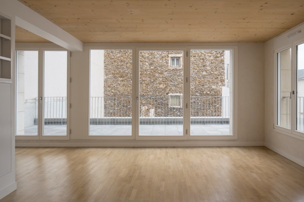 The construction of the building is hybrid, composed of different materials each assuming a particular mechanical or thermal role. All the facades are in massive stone supported by reinforced concrete porticos on the ground floor. This juxtaposition recalls the Parisian building tradition, wherein the materiality of the lower and higher levels was typically differentiated. The thickness of the stone facade varies depending on the degree of its sollication, with 35 centimeters on the first level and 30 centimeters on the floors above. A metal frame associated with the facade reduces the load on the floor plates. Hemp concrete, whose breathability is well suited for stone masonry, insulates the building.