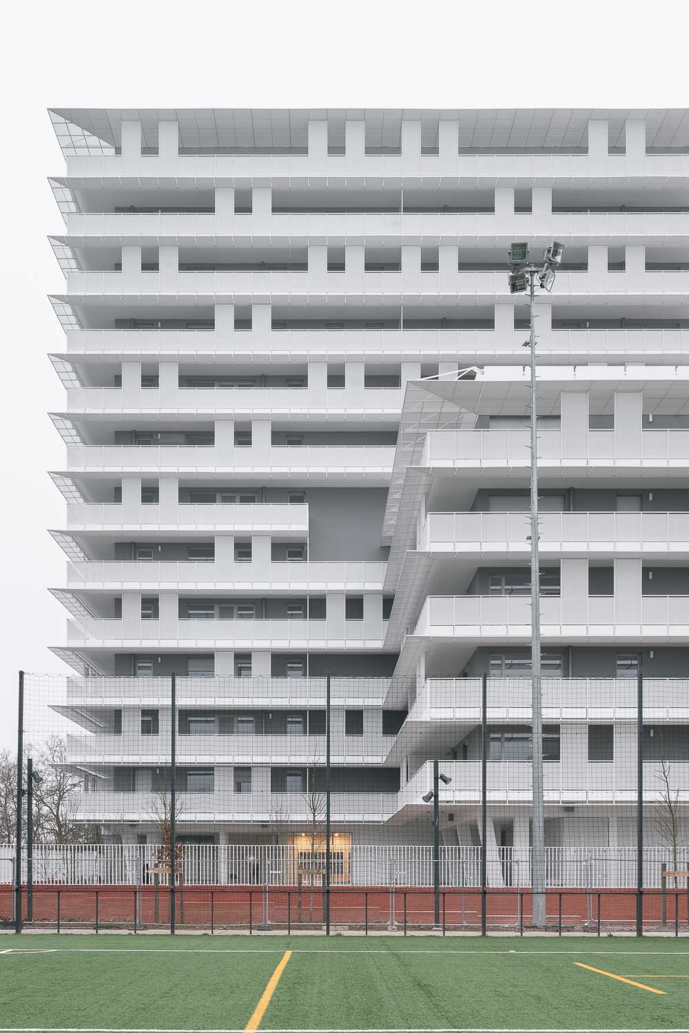 The sliding layout of the two buildings generates two large green outdoor spaces, one hosting the main entrance hall of the building protected by a large landscaped porch, and the other giving access to the stairwells at the back of the building. With a south-facing main facade bordering a football field, it was essential to think about how to guarantee summer comfort to all apartments.