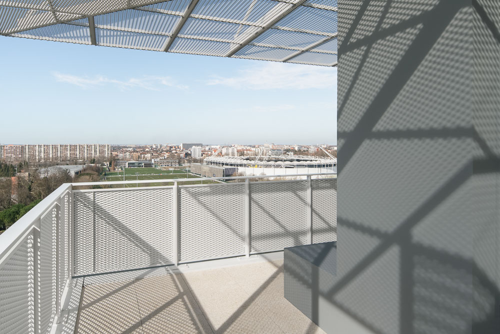That is why a double device has been set up, combining large metal sun protections, extending 2m wide long balconies all along the South and West facades, and creating real outdoor rooms in addition.