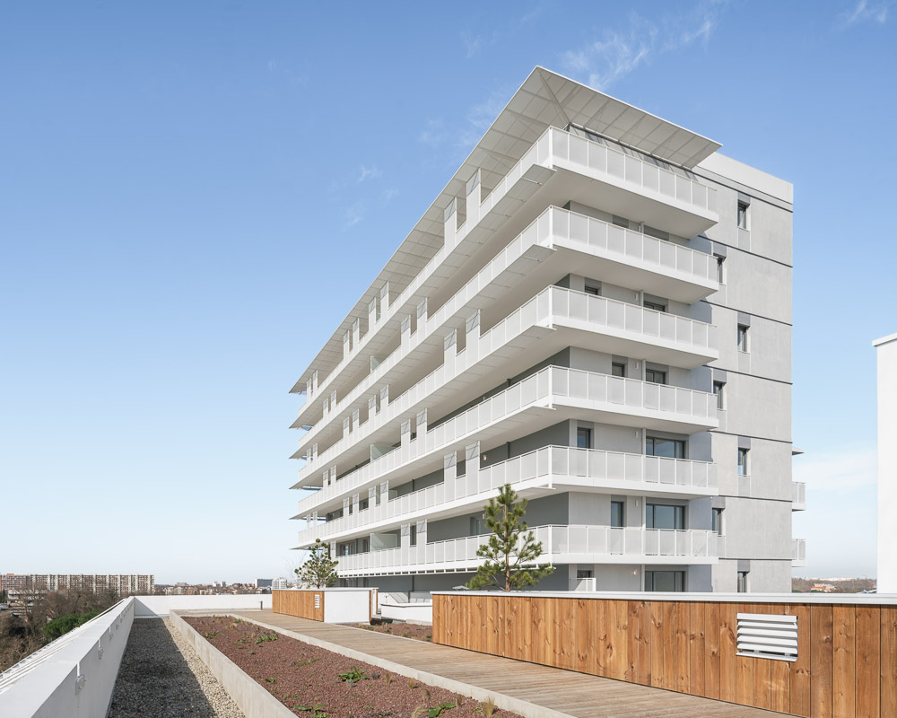 In the south of Toulouse, in the Empalot district, 90 housing units for sale and 20 social housing units are located in two volumes, a vertical one: ‘the belvedere’, and a horizontal one: ‘the prairie building’, sliding against each other and showing light facades with sun protections and generous balconies. A few metro stations from the heart of Toulouse, along the Garonne, Empalot is a district of the city being renewed, close to the city center, mainly composed of housing complexes of the 1950s, with generous public spaces. It is one of the city’s gateways. Composed of a vertical and a horizontal volume sliding against each other and recalling the surrounding volumetrics, this ‘landscape building’ hosts 90 housing units for sale and 20 social housing units.