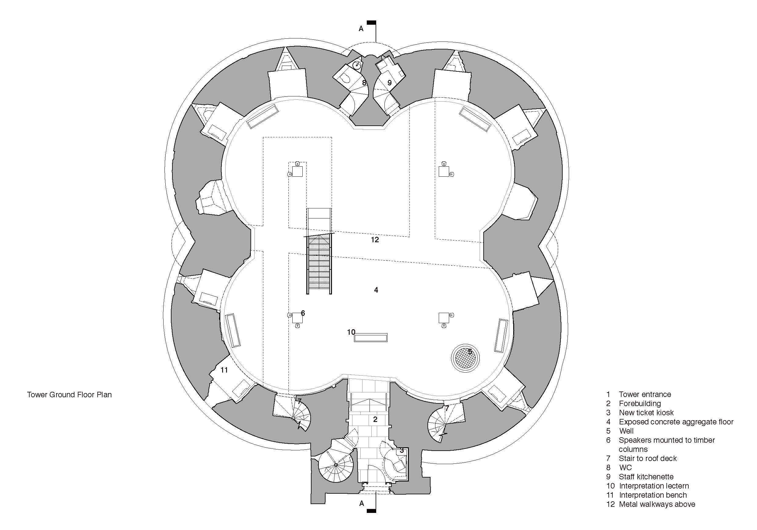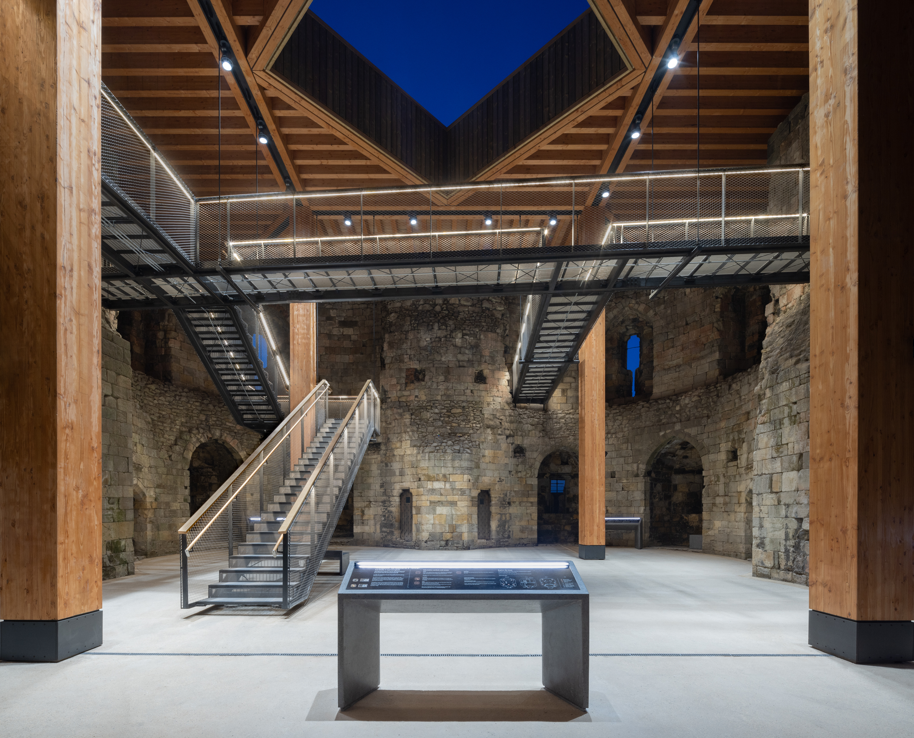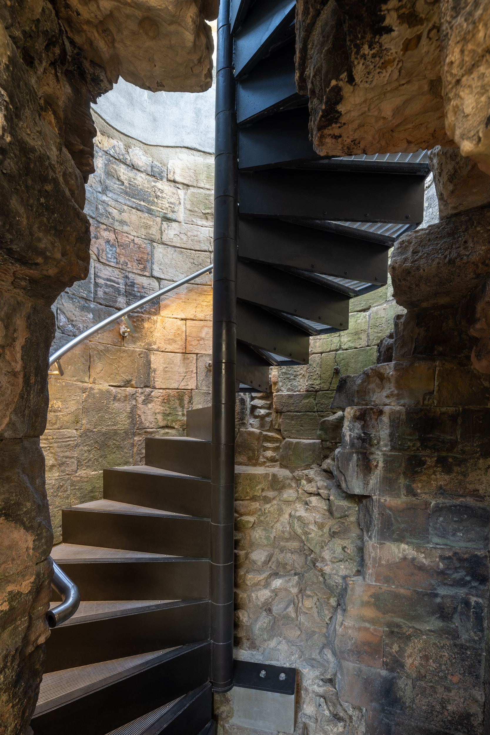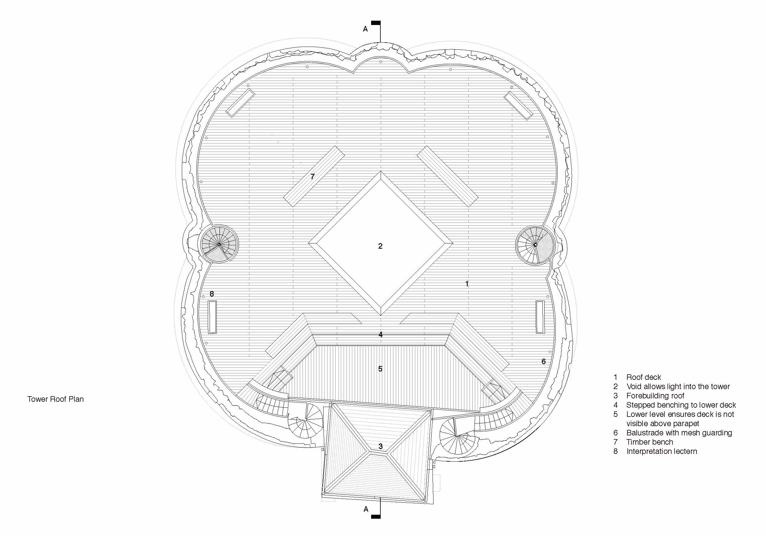 The deck includes amphitheater seating for group activity, with a series of lightweight walkways suspended from its structure which gives access to previously unseen first floor features and doubles the access to the roof level through restoration of two bartizan vices.